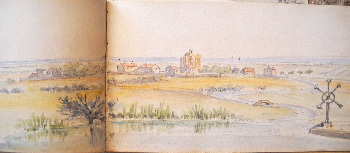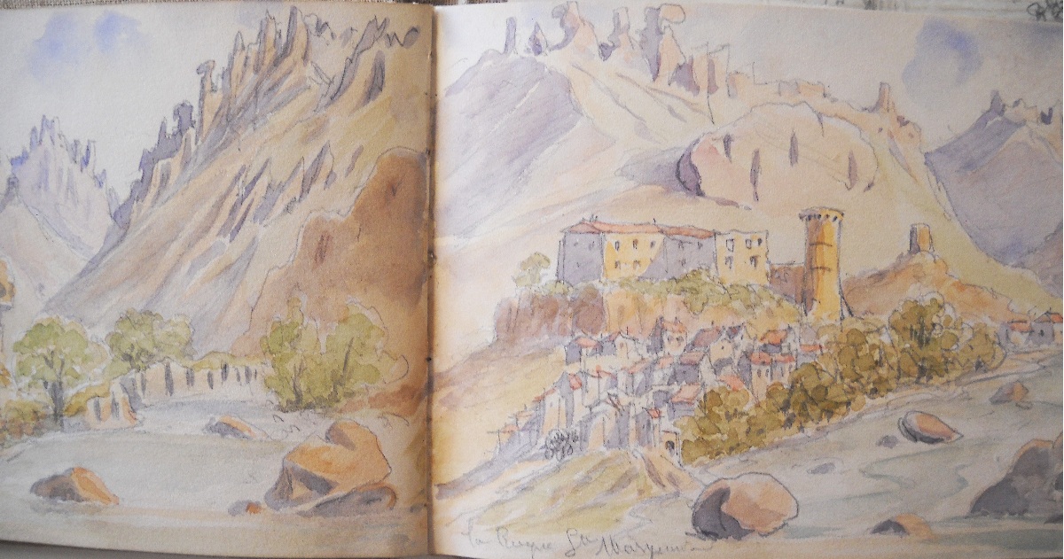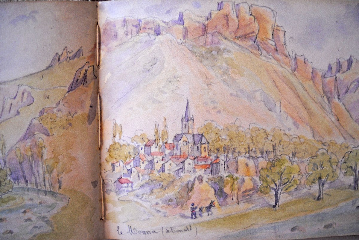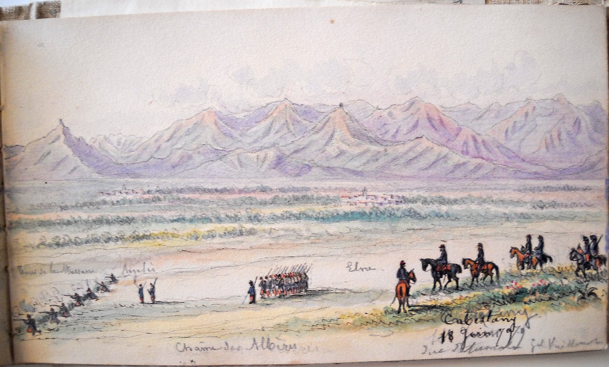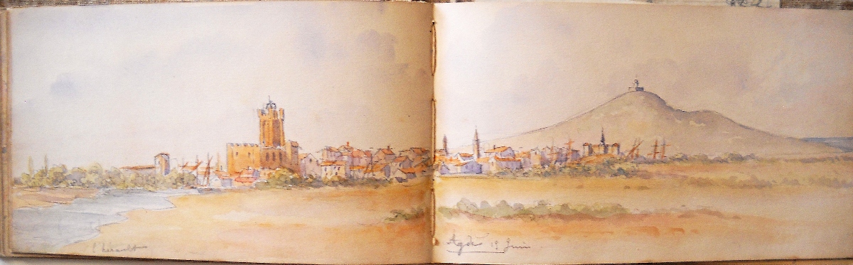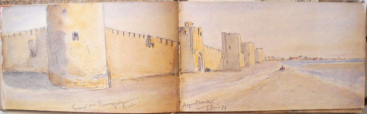 Carnet souvenir personnel du lieutenant-colonel Guioth retraçant les paysages des différents lieux parcourus lors de la tournée d'inspection générale durant le mois de juin 1879 auprès du duc d'Aumale: Beaucaire, Tarascon, bords du Rhône ; Nîmes ; Aigues-Mortes ; pont du Gard ; Clermont de l'Hérault, Poujols ; Pégairolles de l'Escalette ; Soubès ; Le Caylar (plateau du Larzac), Millau (vallée du Tarn), Le Monna ; La Roque Sainte Marguerite (vallée de la Dourbie), Corp, Cantobre, Saint Jean du Bruel ; abbaye de Maguelone, Sète ; étang de Thau ; Agde ; Béziers, Montady, étang de Sigean, Salses le château ; Perpignan, Cabestany ; Ria-Sirach (vallée de la Têt), Villefranche, Mont-Louis ; Quérigut, Carcanières (vallée de l'Aude), gorges de Saint Georges, Gorges de Pierre Lys ; Carcassonne ; Albi ; Monts du Cantal, Aurillac, Polminhac (vallée de la Cère), Murat (vallée d'Alagnon) ; Puy de Dôme ; Riom, Sancerre ; etc. En fin de carnet un croquis daté du 20 décembre 1898 et titré " Turenne et les quatre routes (Corrèze) ".