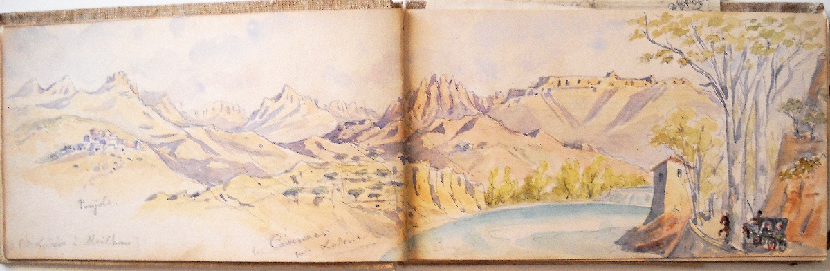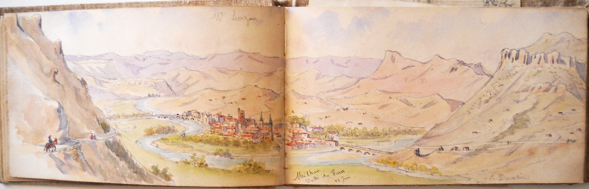 [Duc d'Aumale - Cévennes - Pyrénées] Carnet à l'italienne, 12 x 19 cm, contenant 67 croquis au crayon et à la plume, certains rehaussés à l'aquarelle et pastel, légendés et datés, réalisés au cours du mois de juin 1879 par Pierre Florentin Louis GUIOTH (1834-1899), aide de camp du général Henri d'Orléans, duc d'Aumale, inspecteur général en tournée des corps d'armée du sud-ouest de la France.
