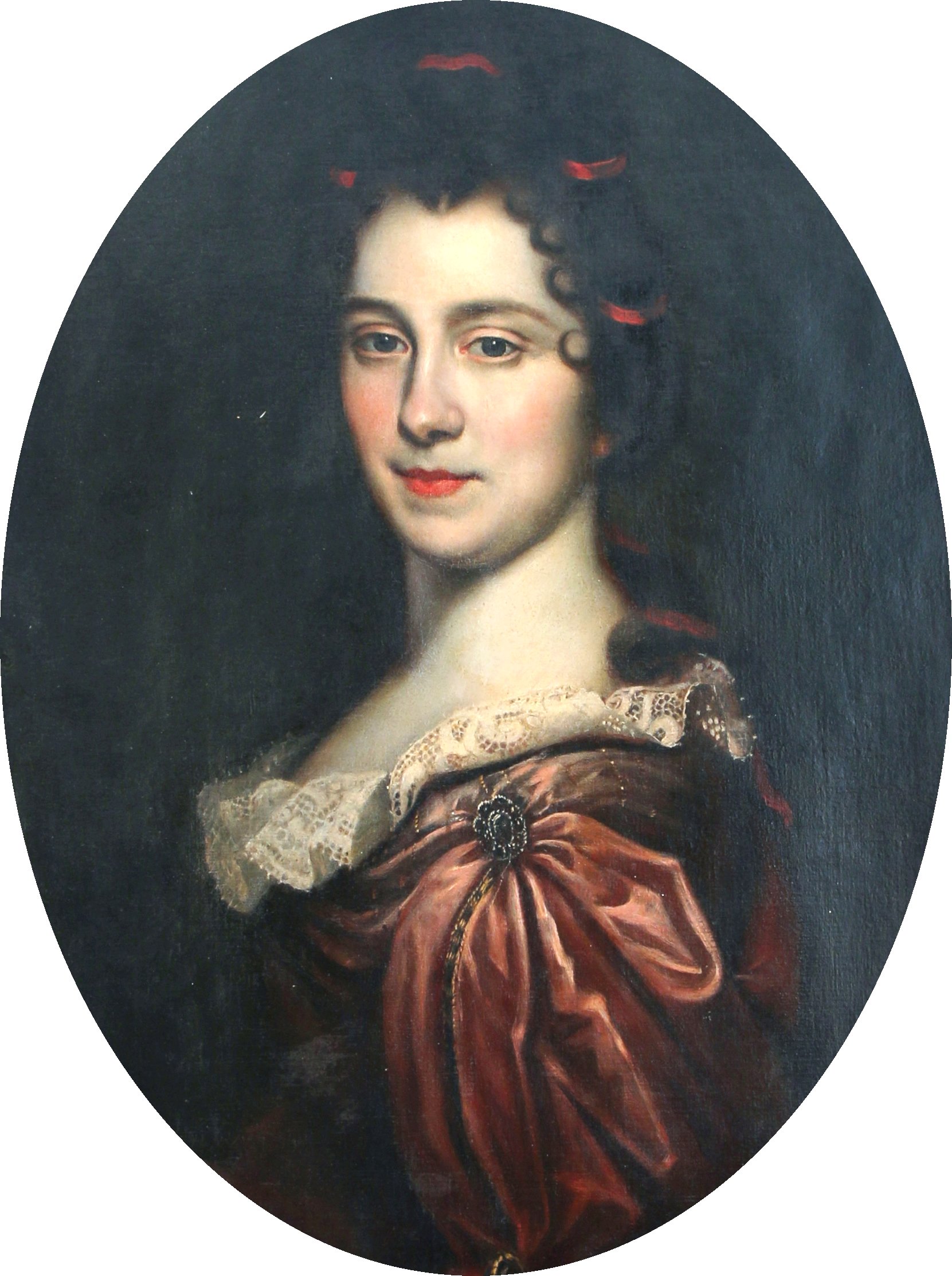 Porte une inscription manuscrite sur le châssis: " Noble Dame Marie de Morand Courseulles née au château de Courseulles le 19 août 1657 + au château de Cristot le 6 novembre 1695. Fille de Nicolas Claude de Morand chevalier Baron de Courseulles et de noble dame Marie-Charlotte de Hacqueville épouse de noble homme Messire Pierre du Buisson chevalier sieur de Courson seigneur et patron de Cristot et Brouay ".
