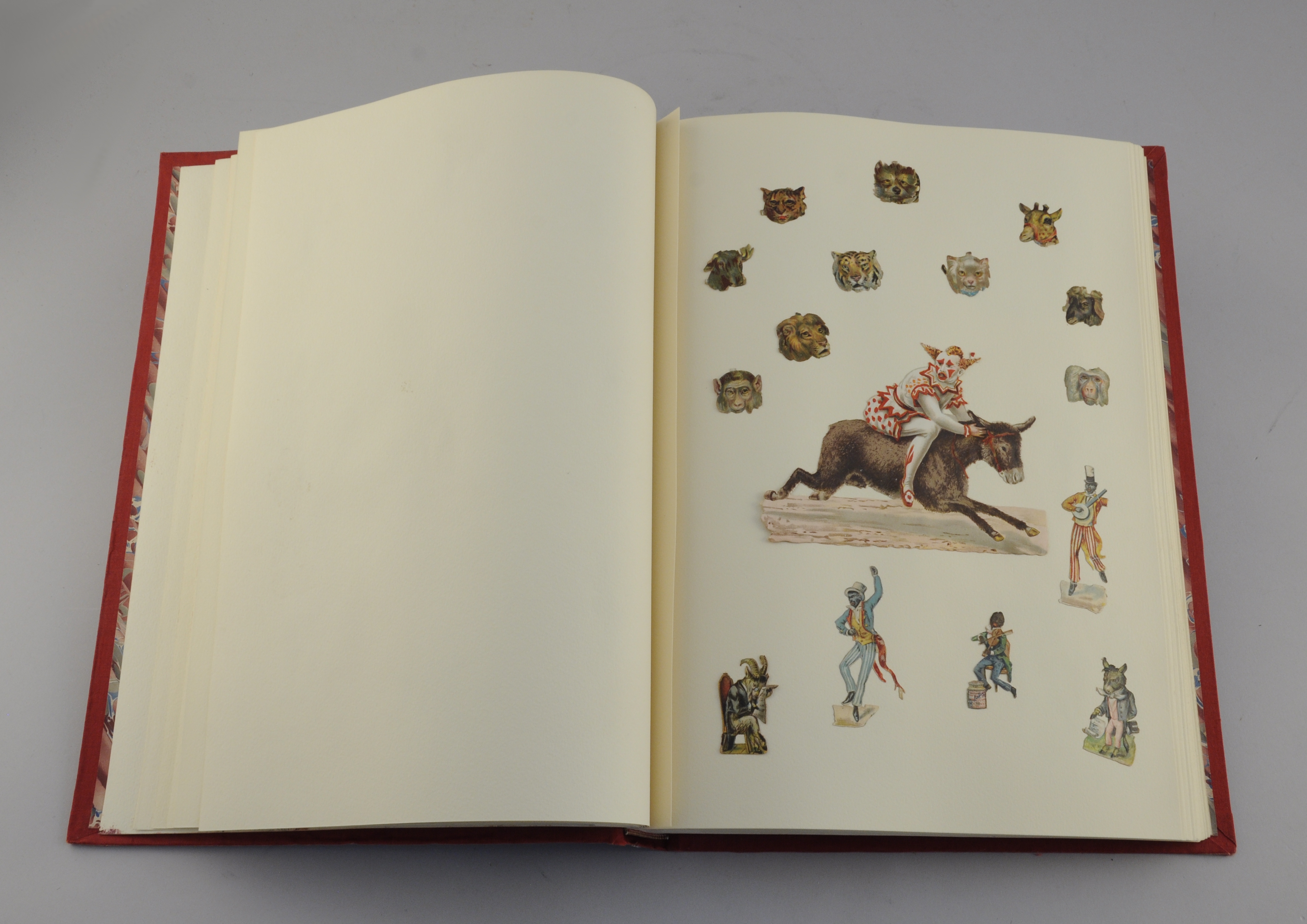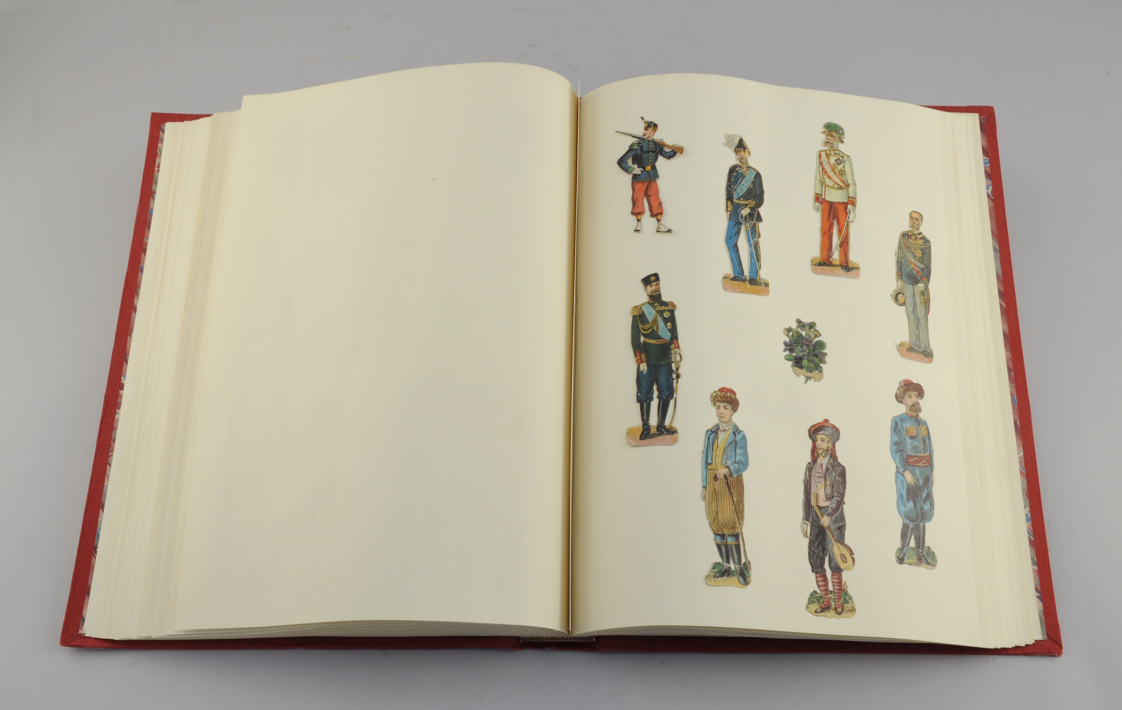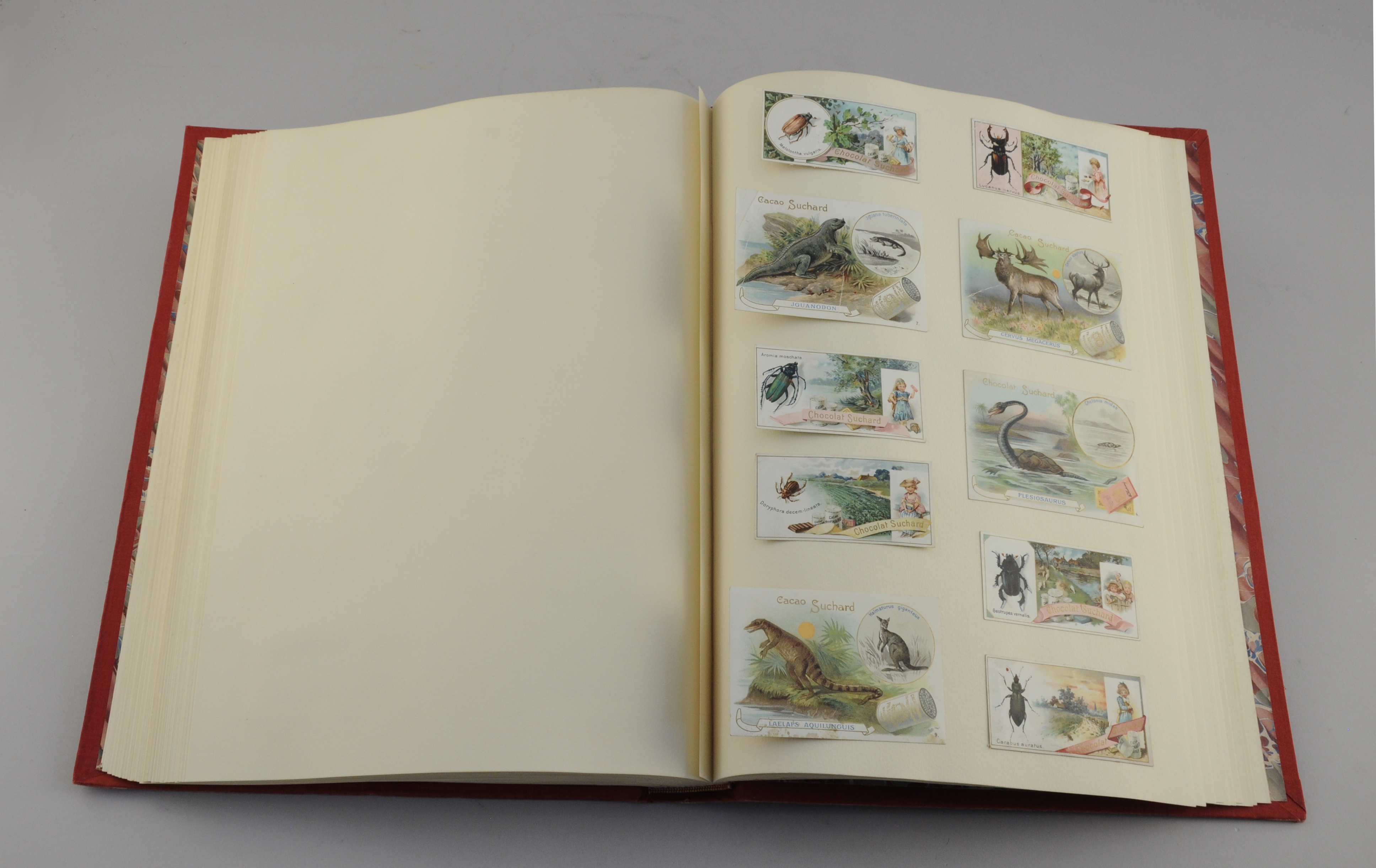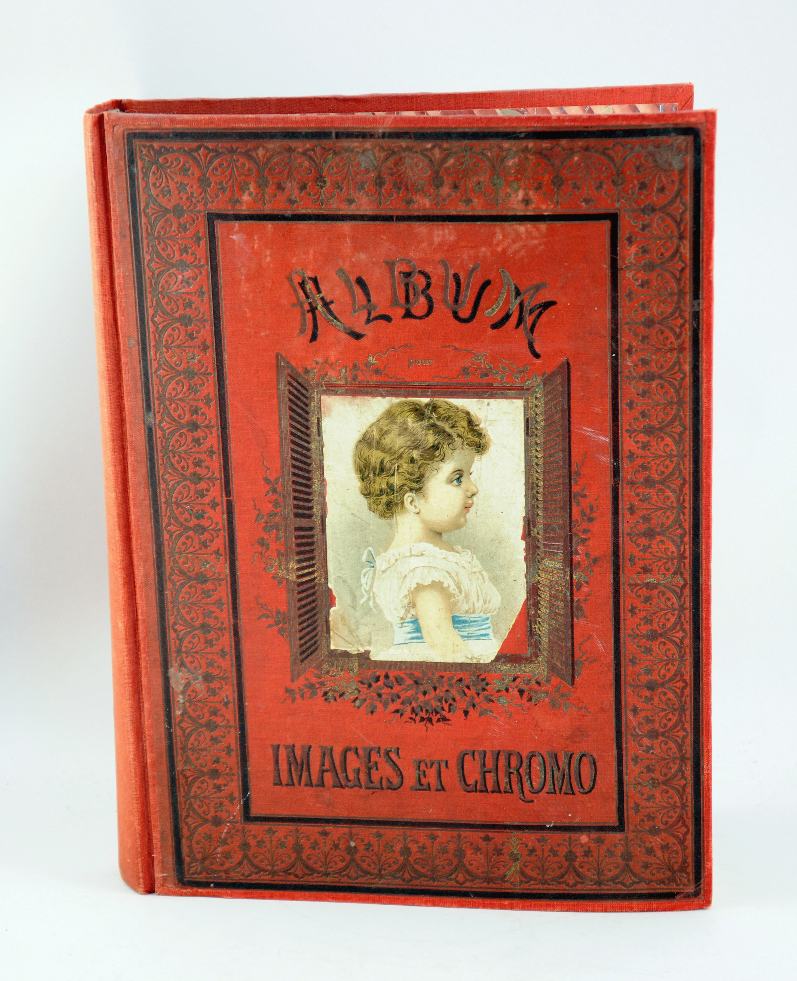 Riche ALBUM de CHROMOLITHOGRAPHIES enfantines, 58 pages. Il comprend de nombreuses images découpées et des cartes à collectionner dont Liebig, Trébucien, Suchard, Eysséric, Kaus ou encore Poulain.