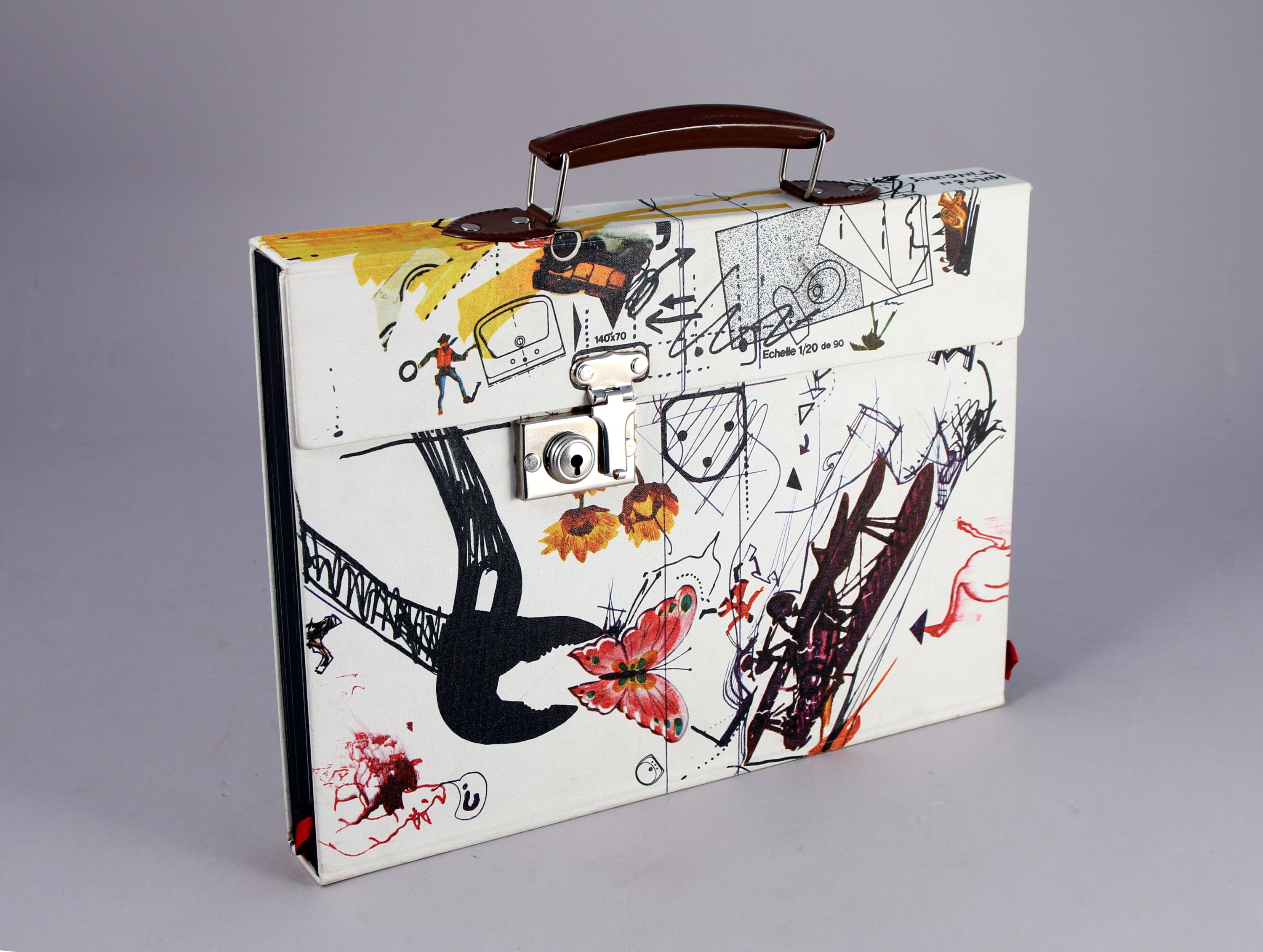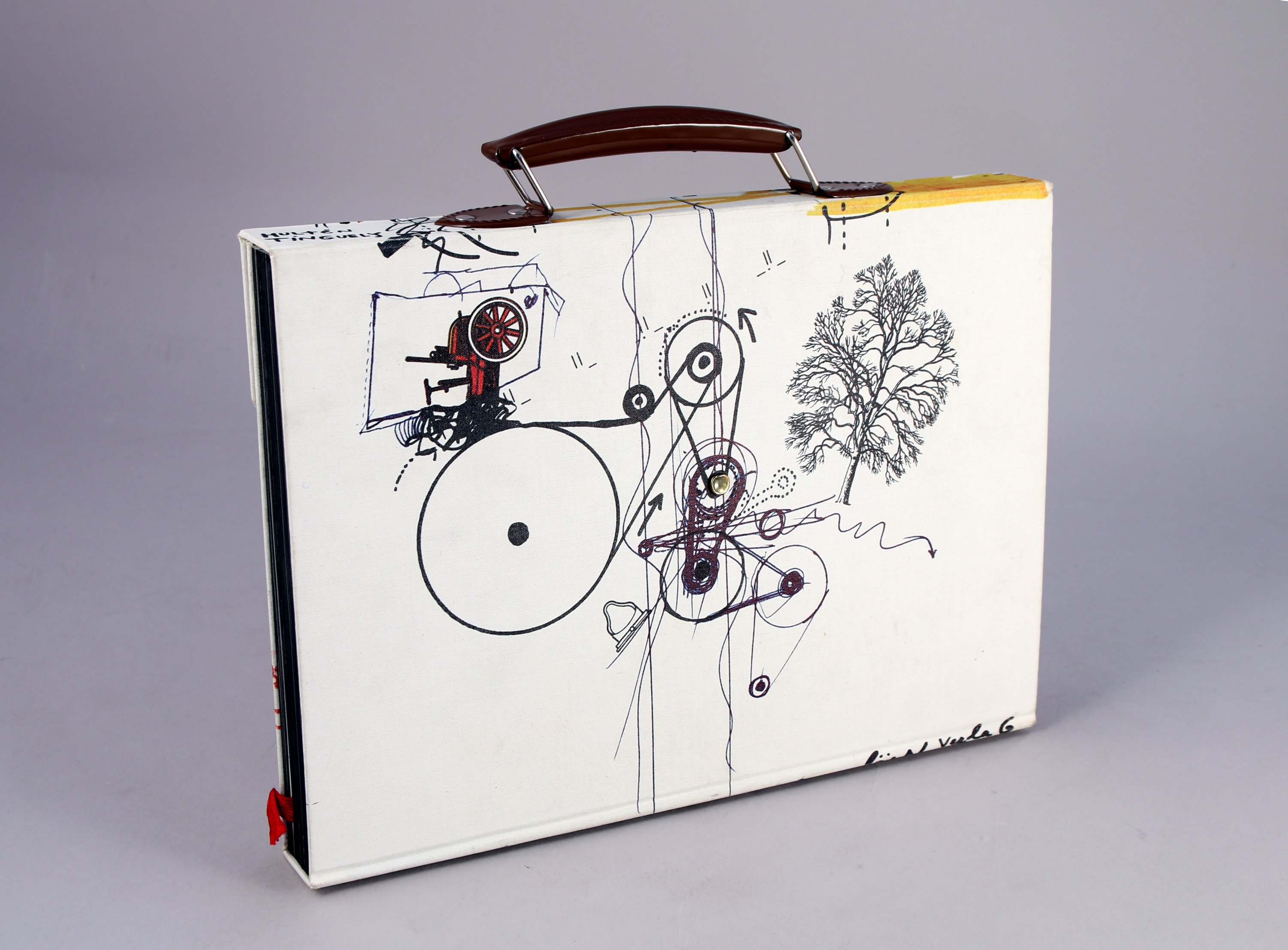 LIVRE en VALISE avec un dessin signé "Tinguely" et légendé au dos: "peinture exécutée avec "metamatic n°8" de Tinguely" le 8 mai 1974 à Stockholm. Exemplaire complet du 33 tours "Sounds belongings to Pontus Hultén's book on Jean Tinguely's work, Méta". Édité par Pierre Horay, Paris 1973, in-4°, p. 364.