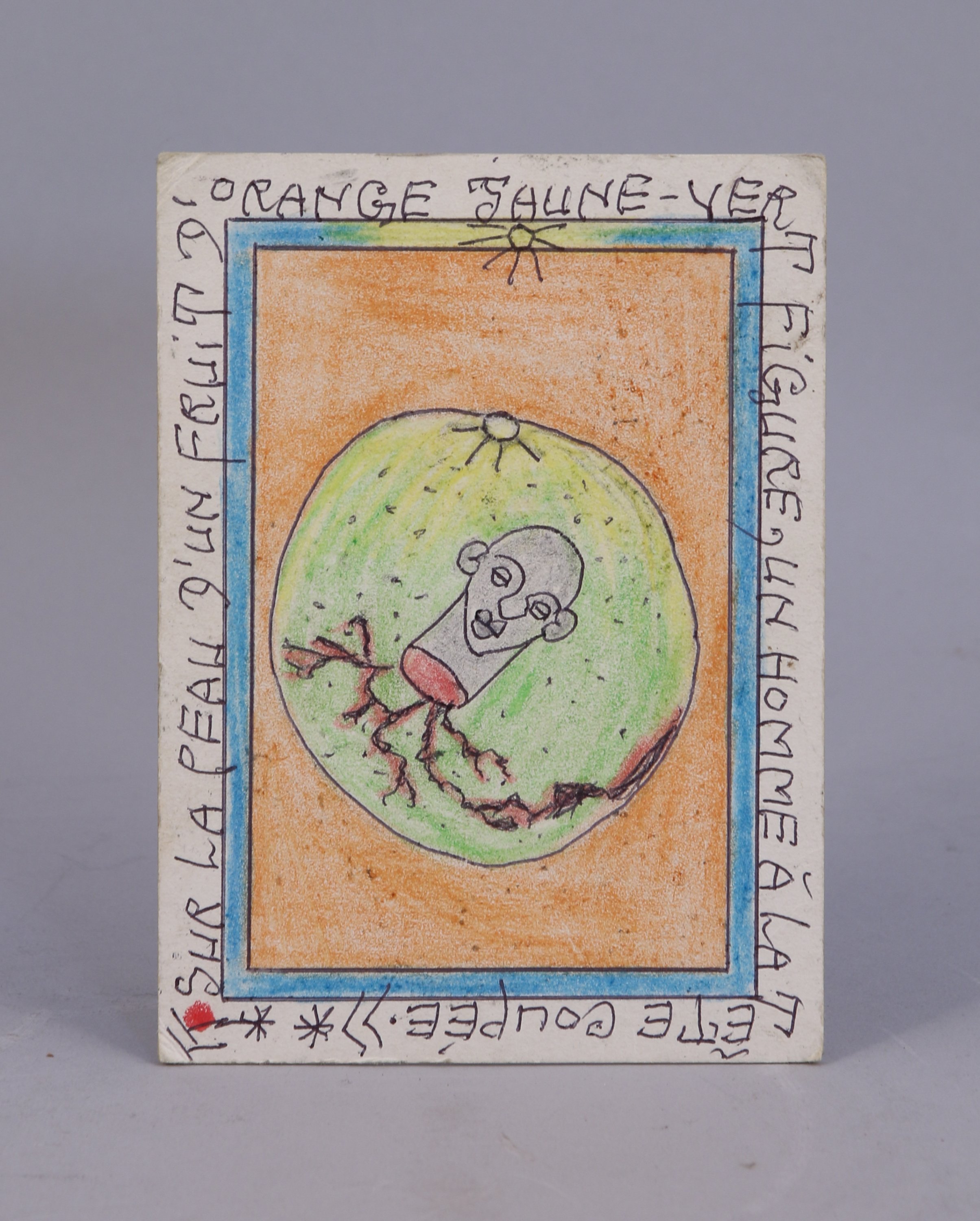 "Sur la peau d'un fruit d'orange jaune-vert figure un homme à la tête coupée." 2008