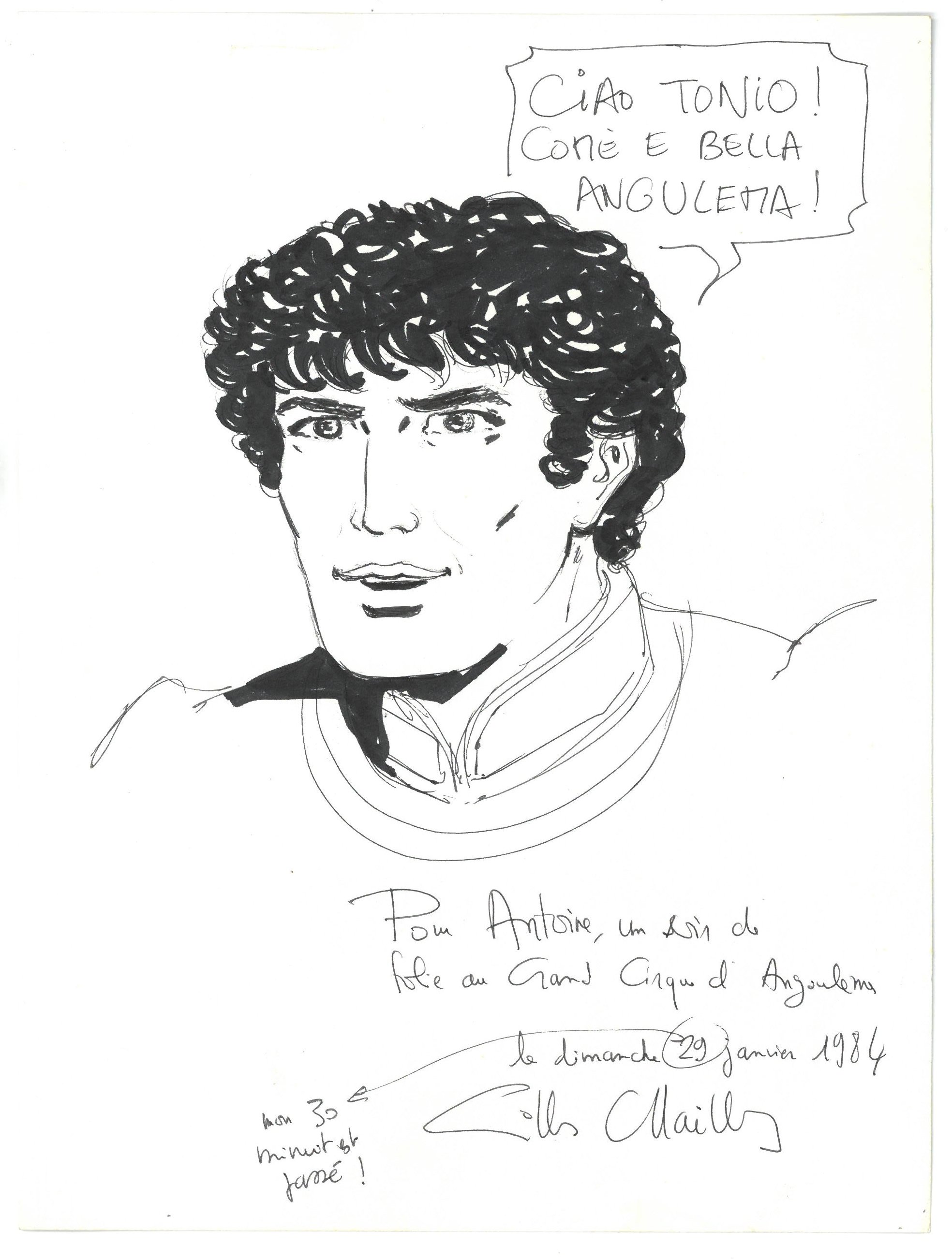 Dessin dédicacé et daté "Pour Antoine un brin de folie au Grand Cirque d'Angoulême, le dimanche 29 (non 30 minuit est passé) janvier 1984".