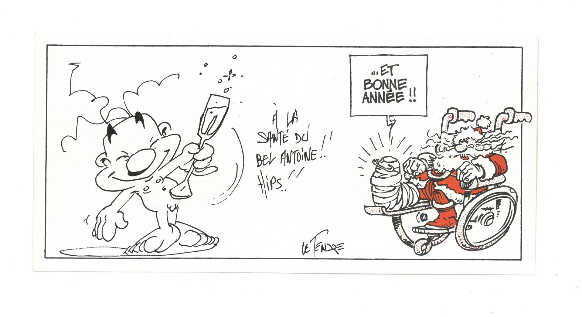 Papier. Signé et dédicacé: "À la santé du bel Antoine!! Hips!!".