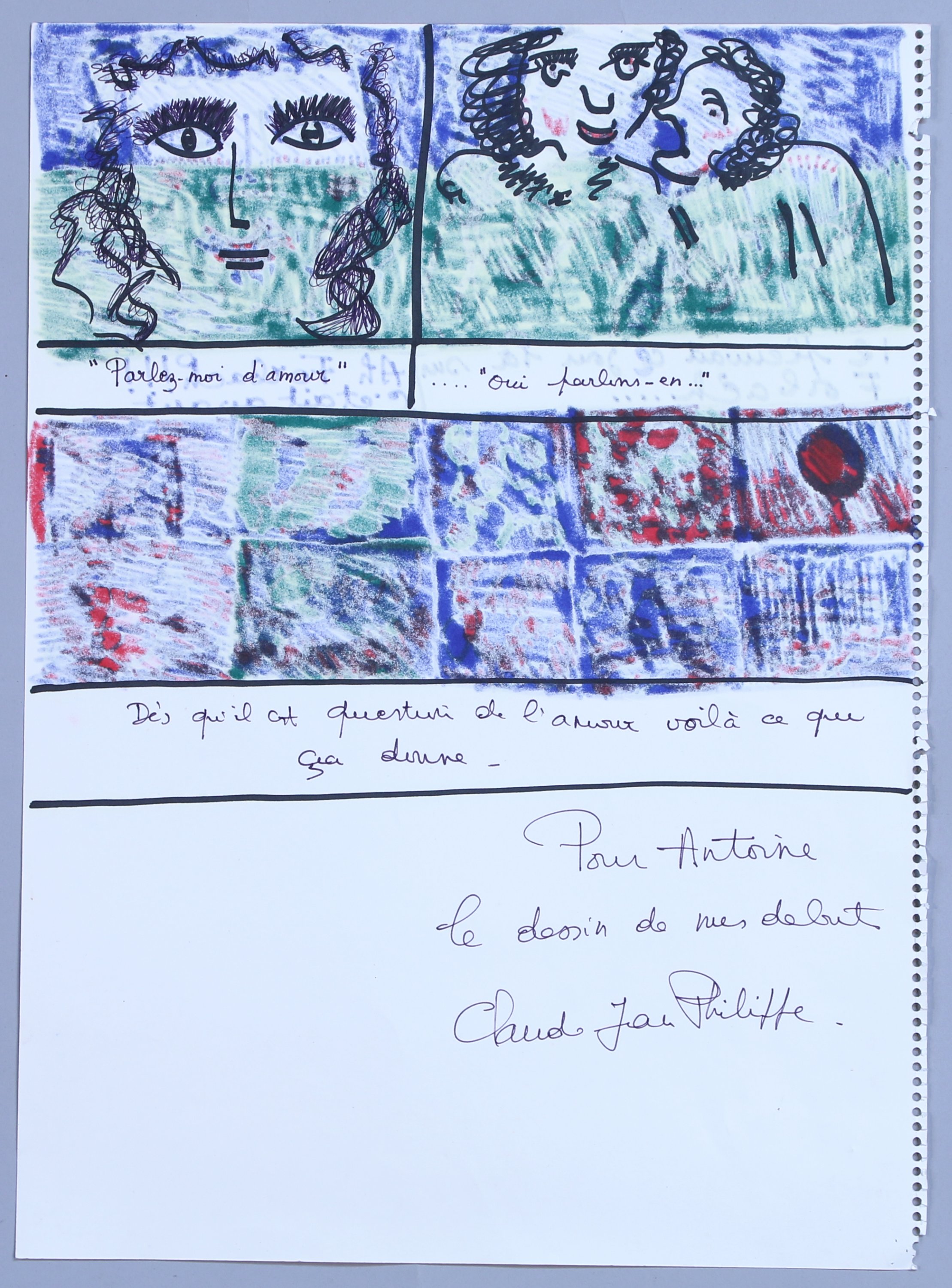 Papier, couleurs, signé et dédicacé: "Pour Antoine le dessin de mes débuts".