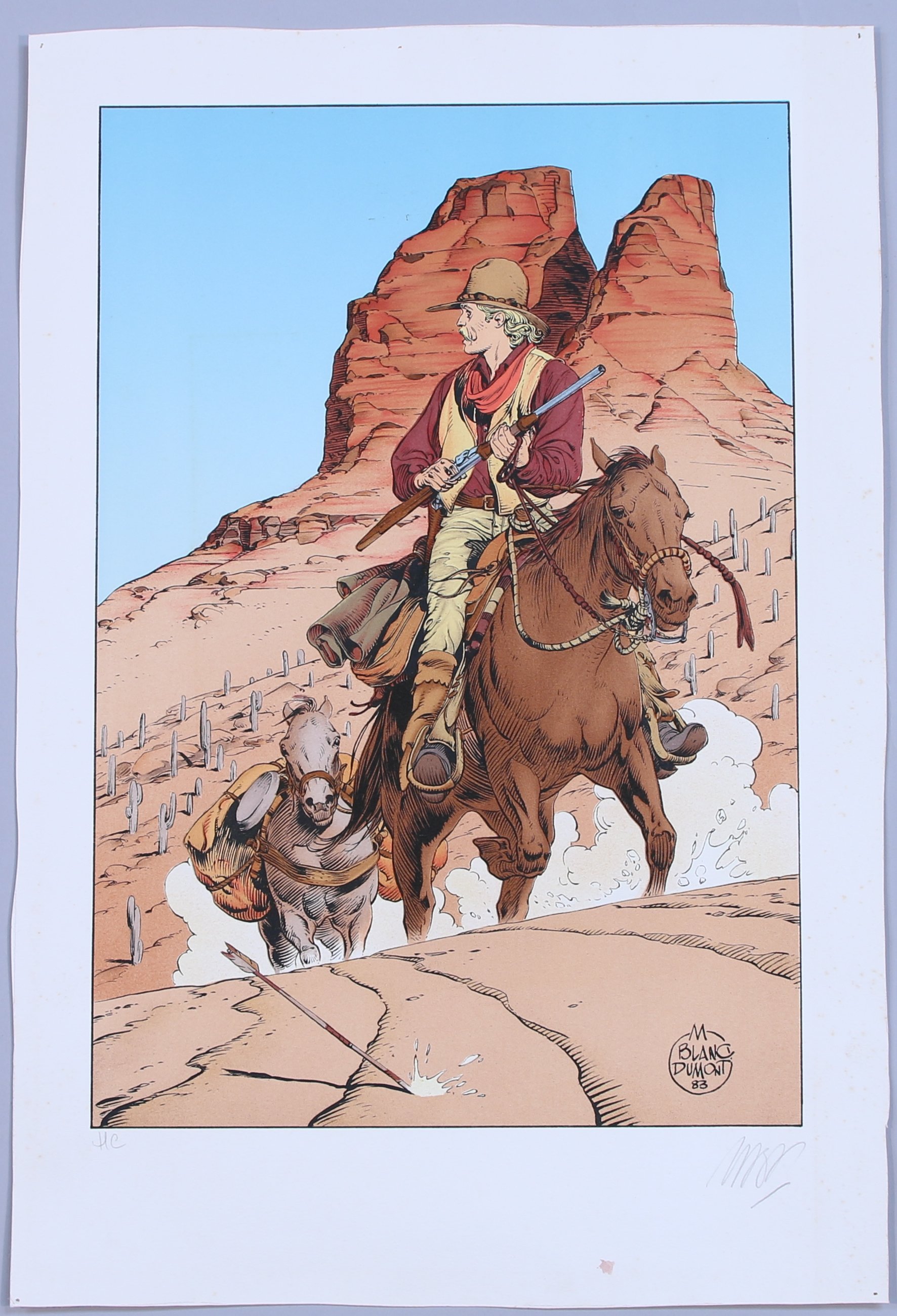 - M Blanc Dumont, Le cavalier, 83, signé au crayon. 54,5 x 36,5 cm (tachée).