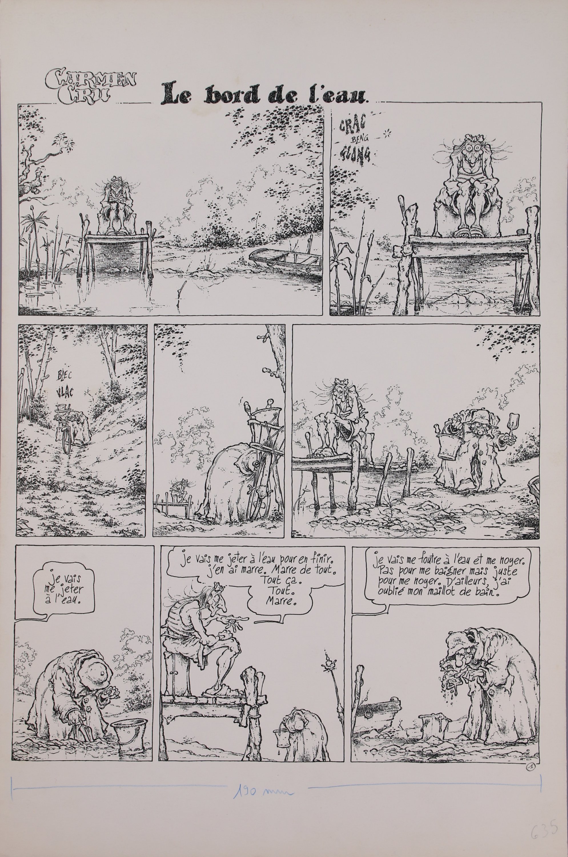 1ère planche de l'histoire (5 planches au total) publiée dans le magazine Fluide Glacial et dans l'album n°5 " L'écorchée vive " en 1987.