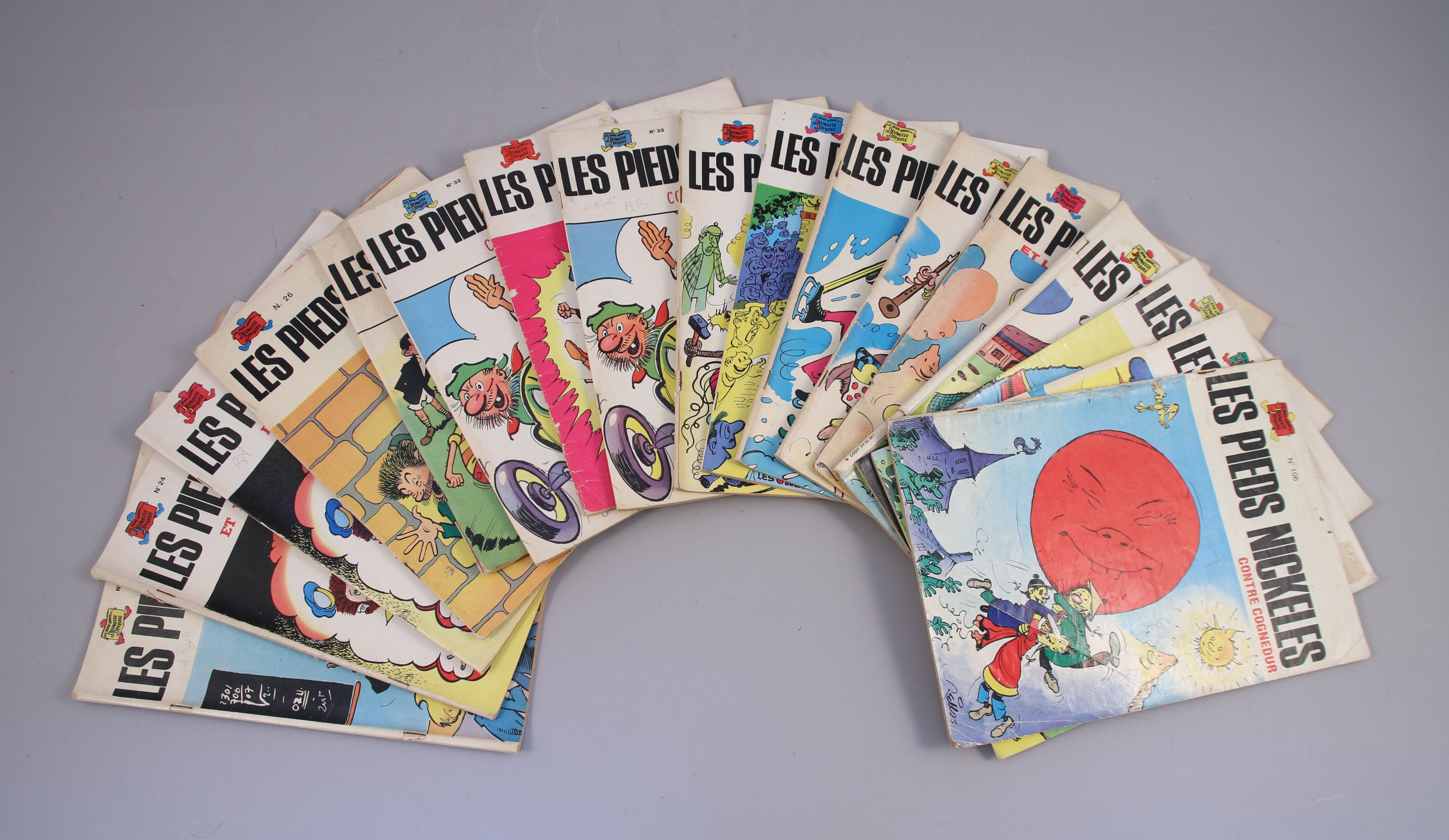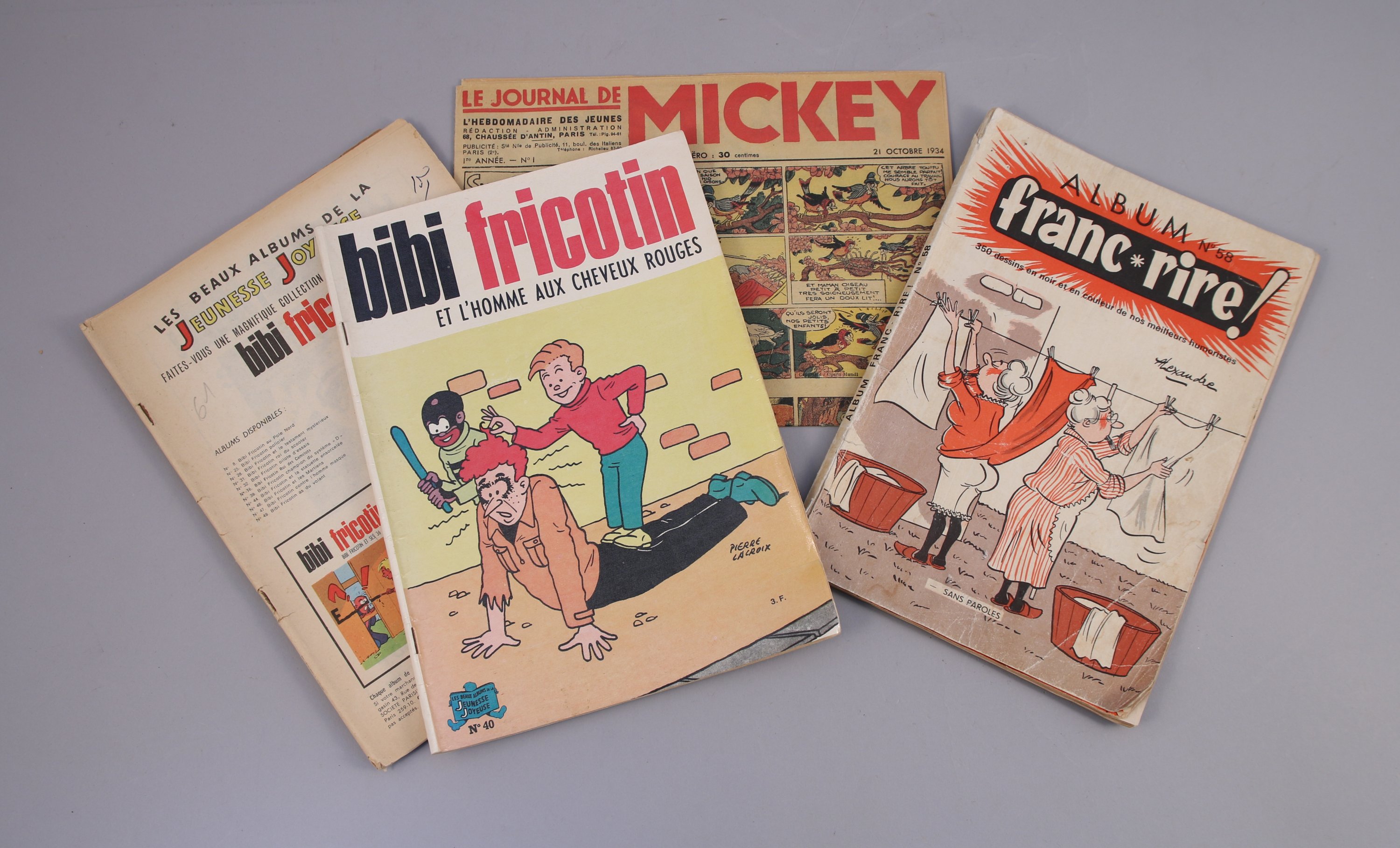 BD JEUNESSE, 21 volumes: HERGÉ. L'Étoile Mystérieuse. Casterman, 1947 dos toilé rouge; LES PIEDS NICKELÉS (17); BIBI FRICOTIN n°40; Les 7 boules de cristal, 1999; Le JOURNAL DE MICKEY, fac-simile du n°1.