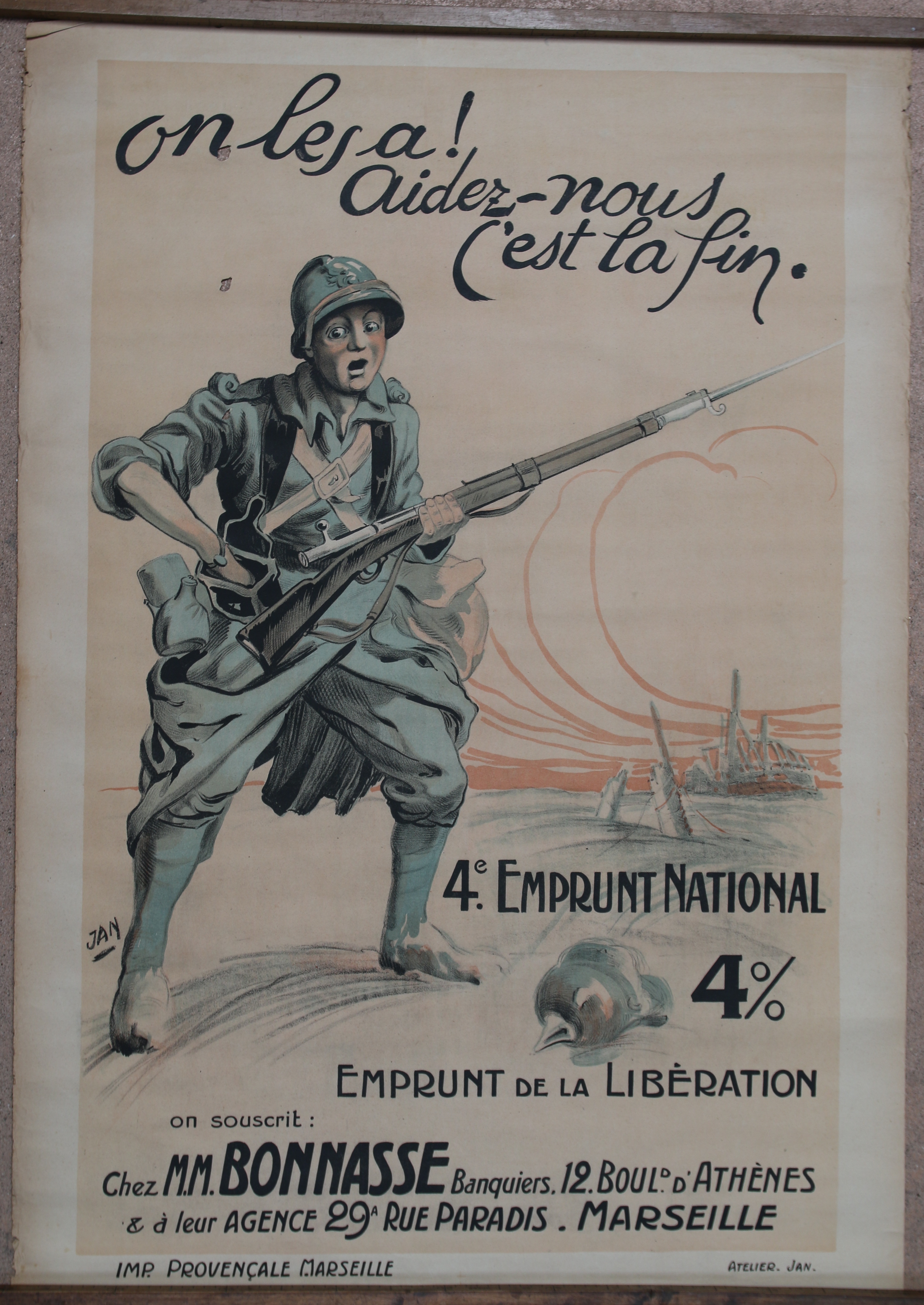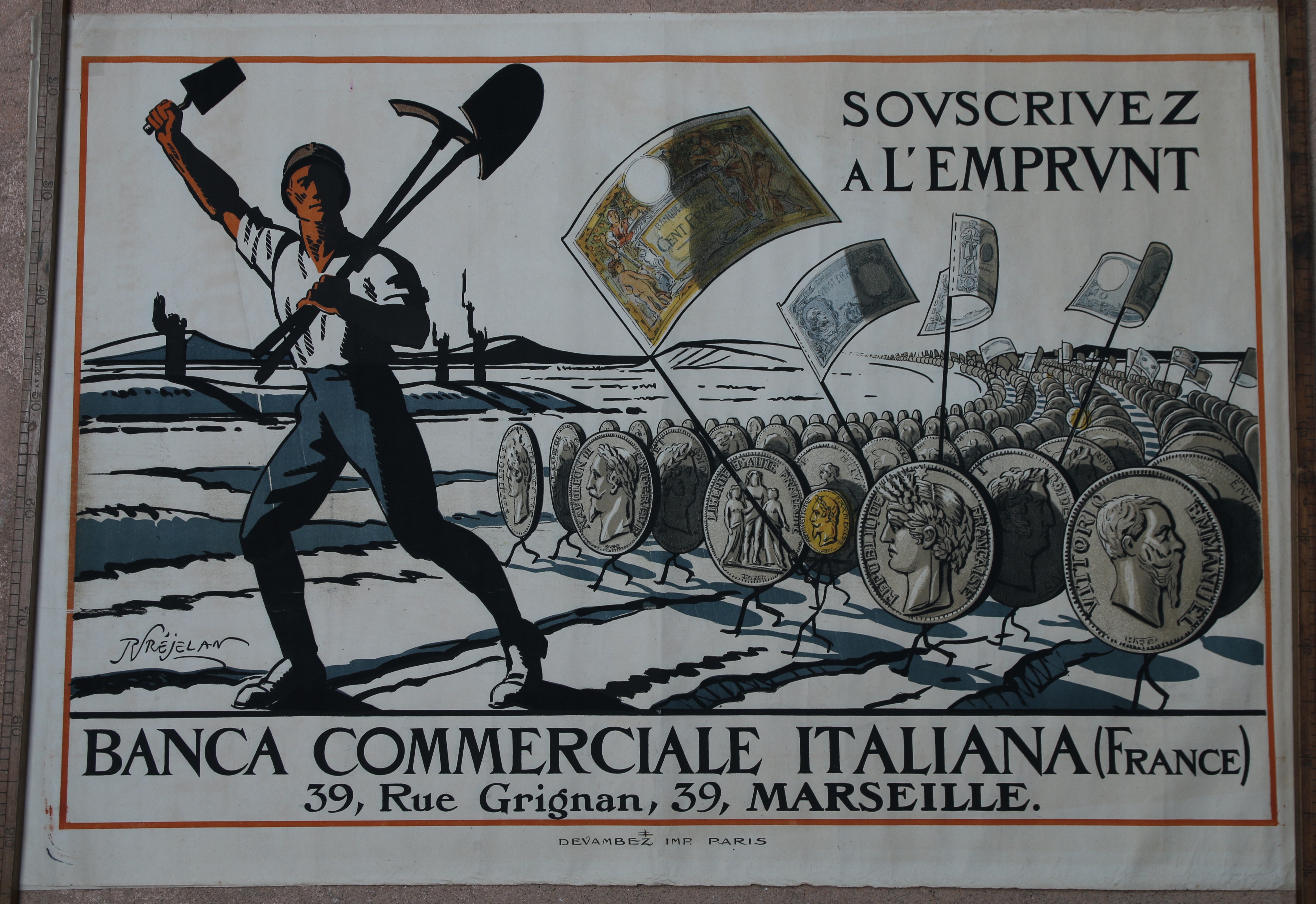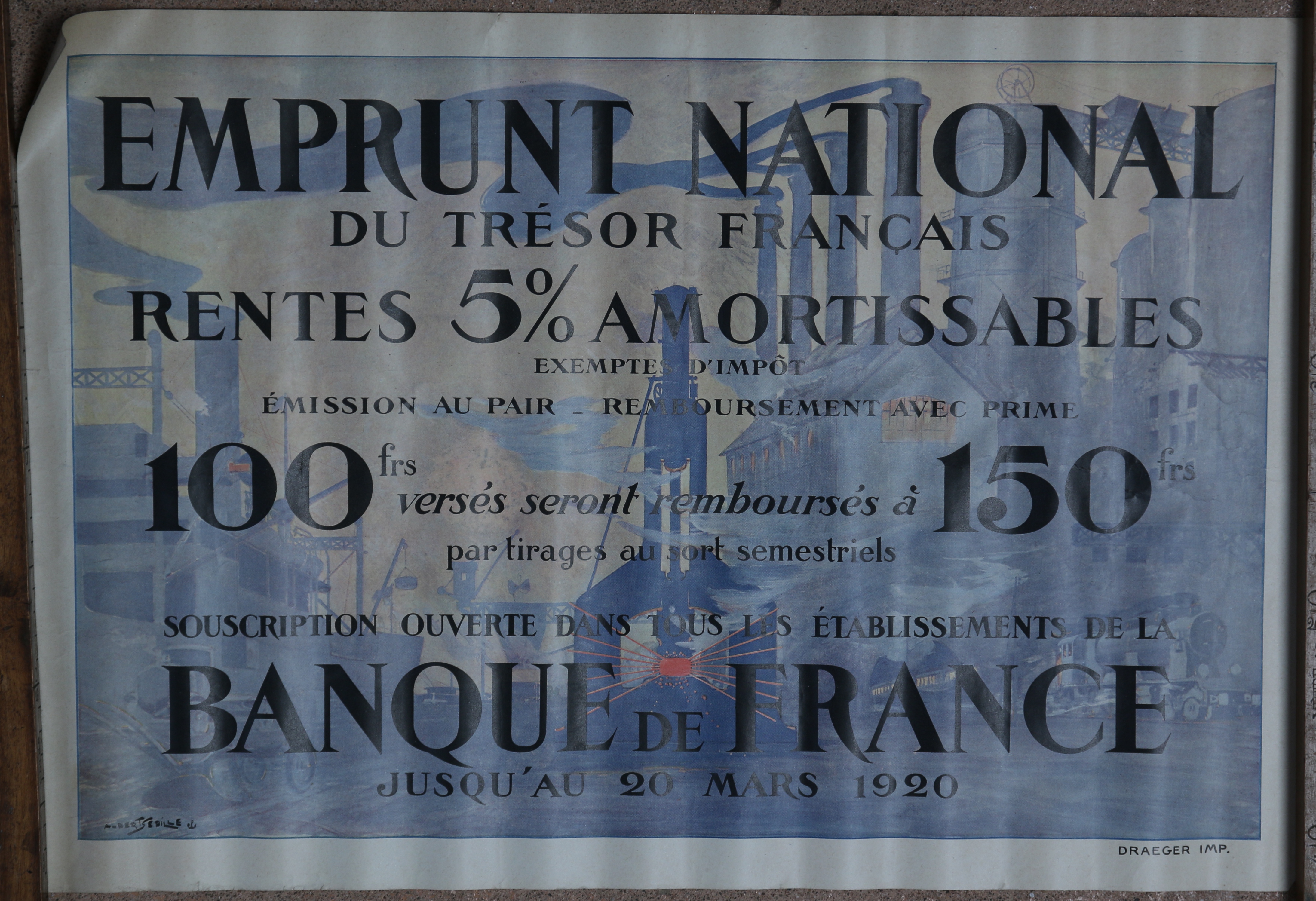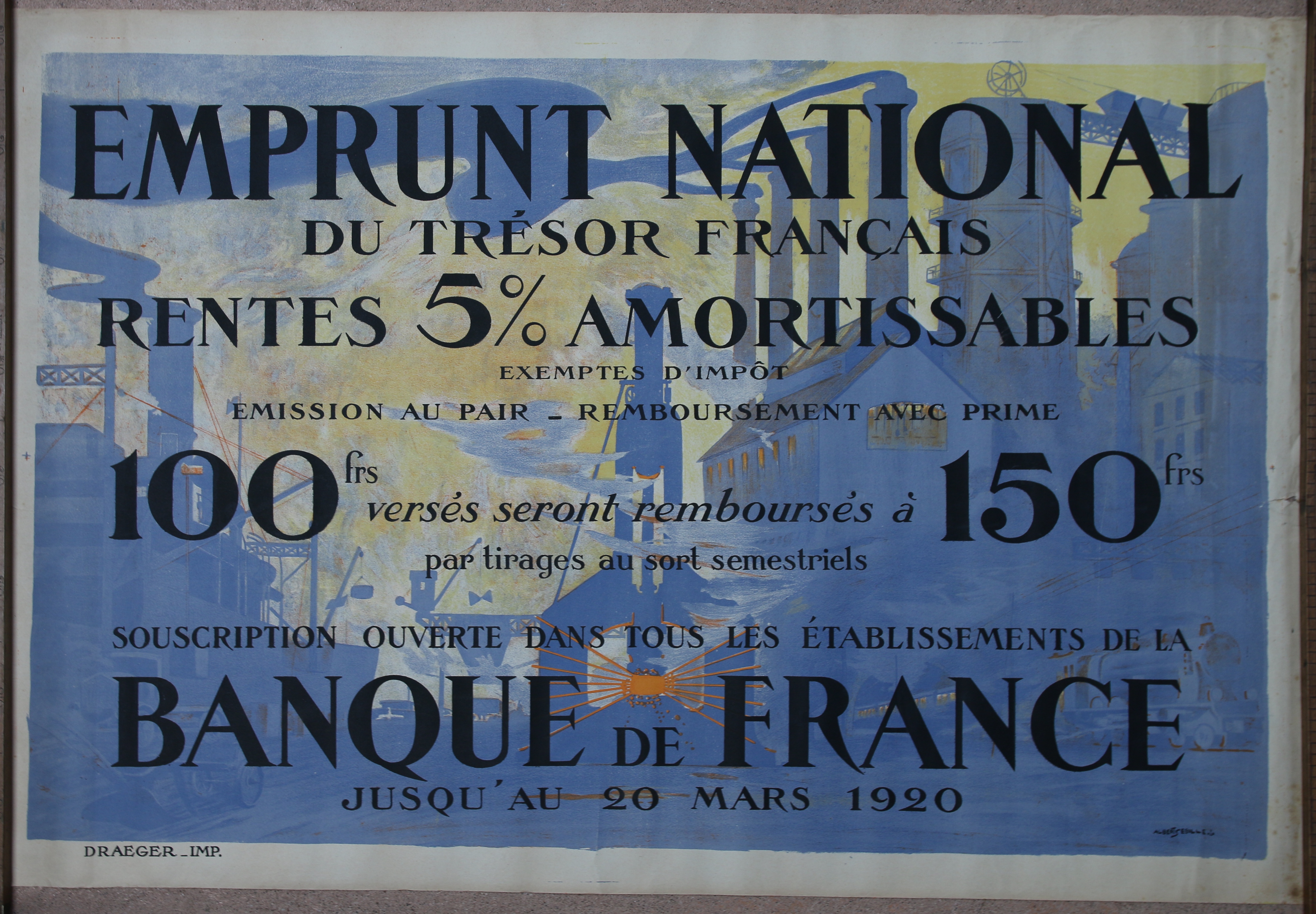 HISTOIRE BANCAIRE. Collection d'une centaine d'AFFICHES majoritairement sur le thème des EMPRUNTS BANCAIRES, nottament lors de la première guerre mondiale, mais aussi des établissements de crédit marseillais, du Sud de la France, d'Algérie et d'Italie.