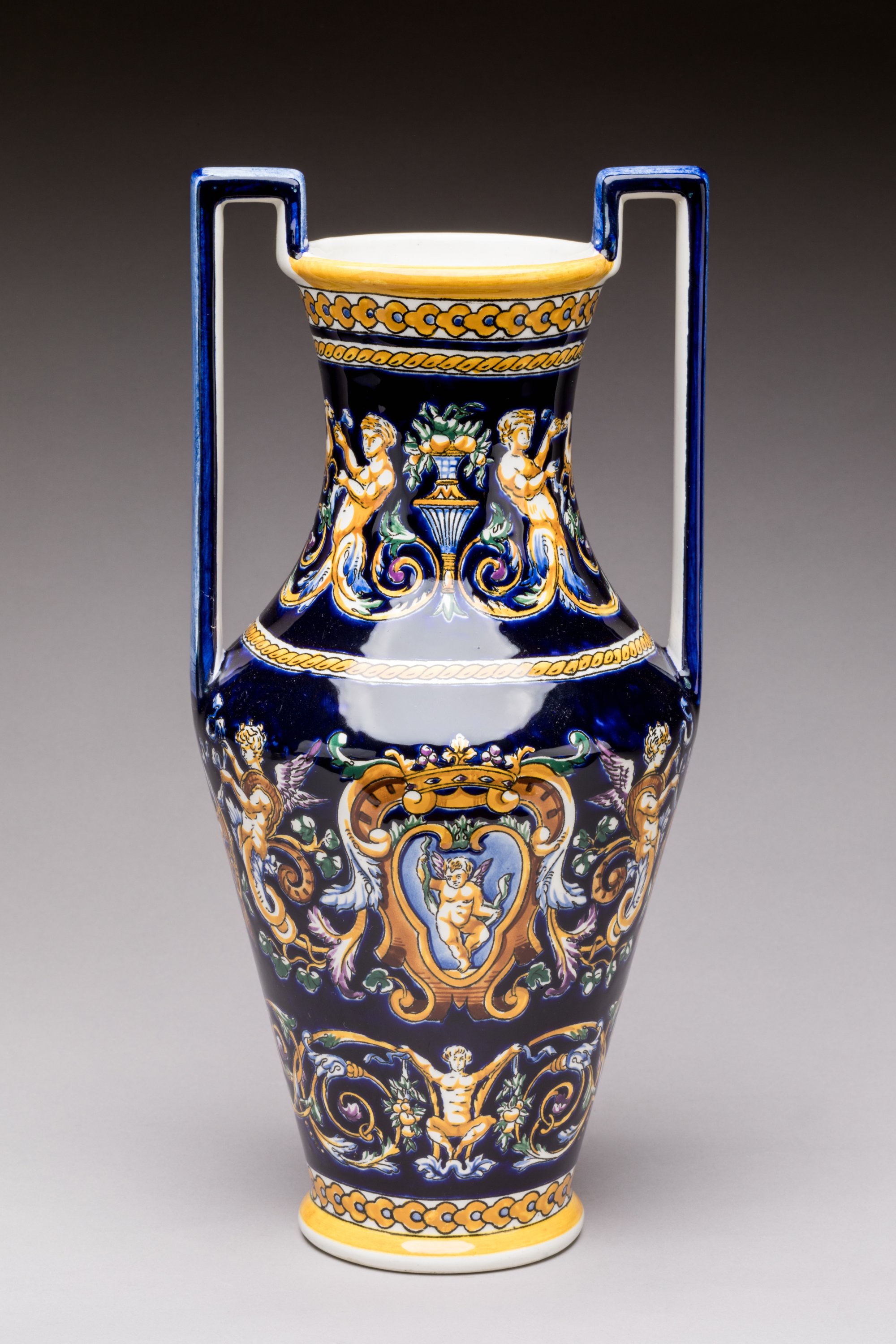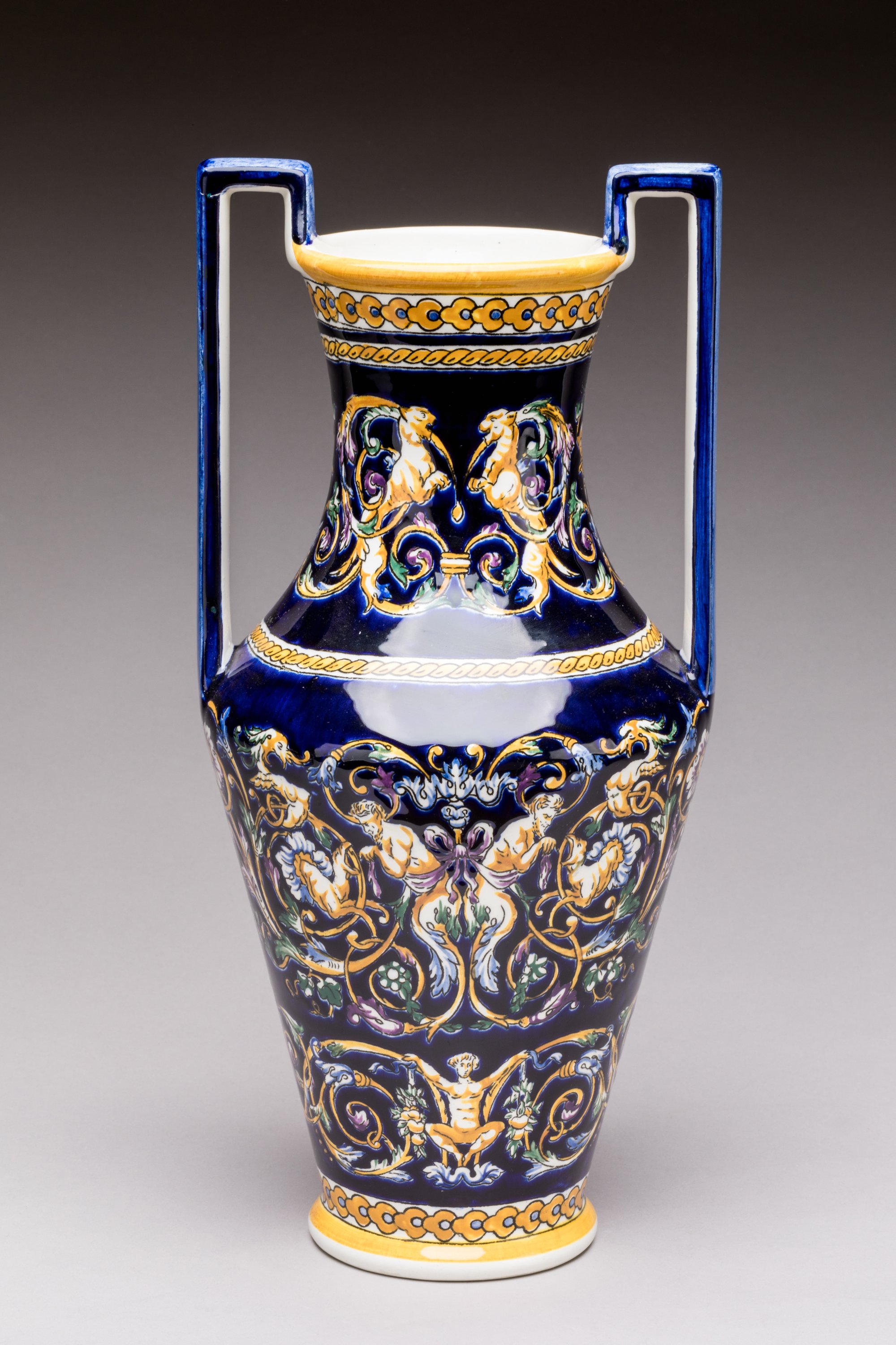 JOINT: VASE en céramique à décor de la Renaissance à fond bleu.