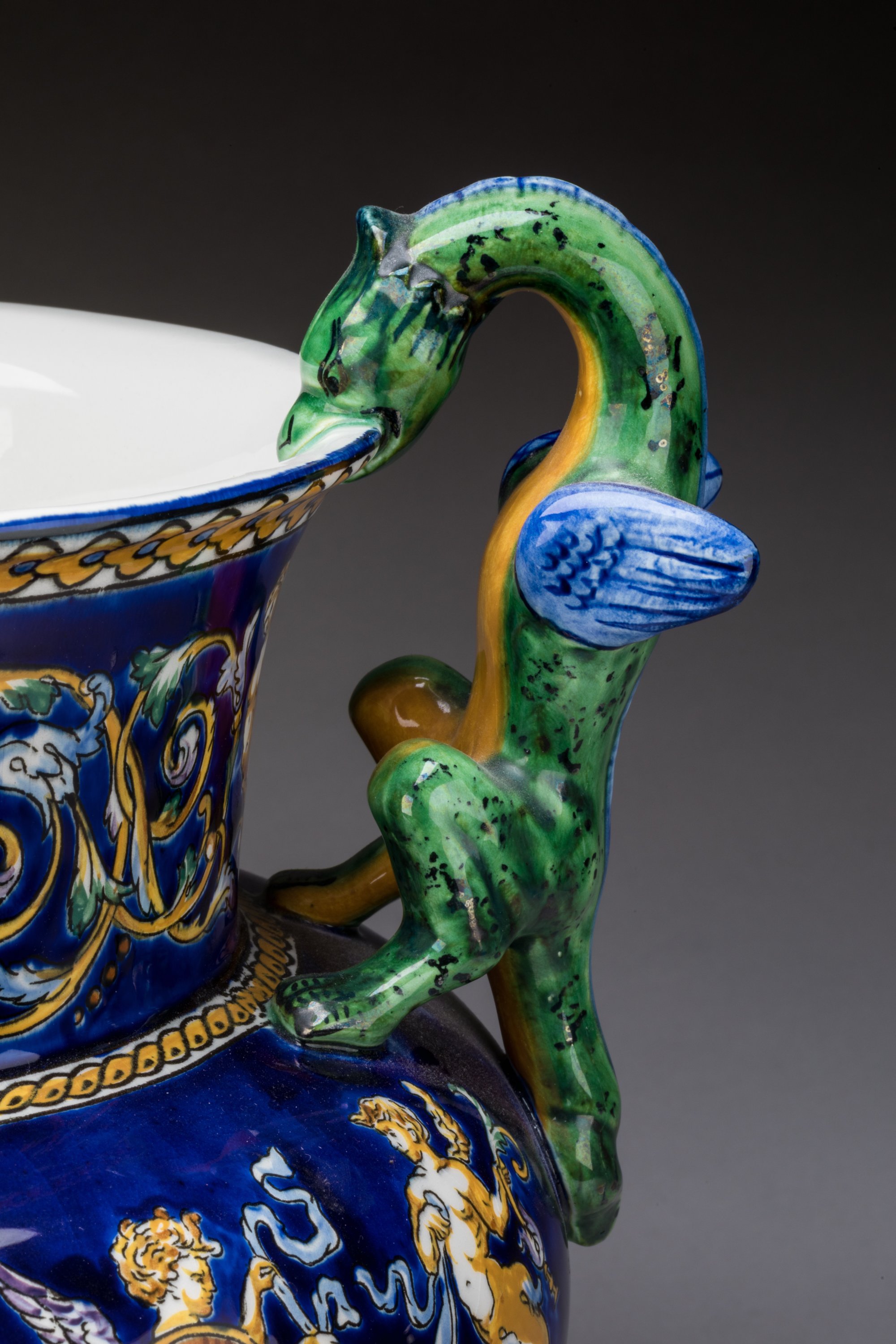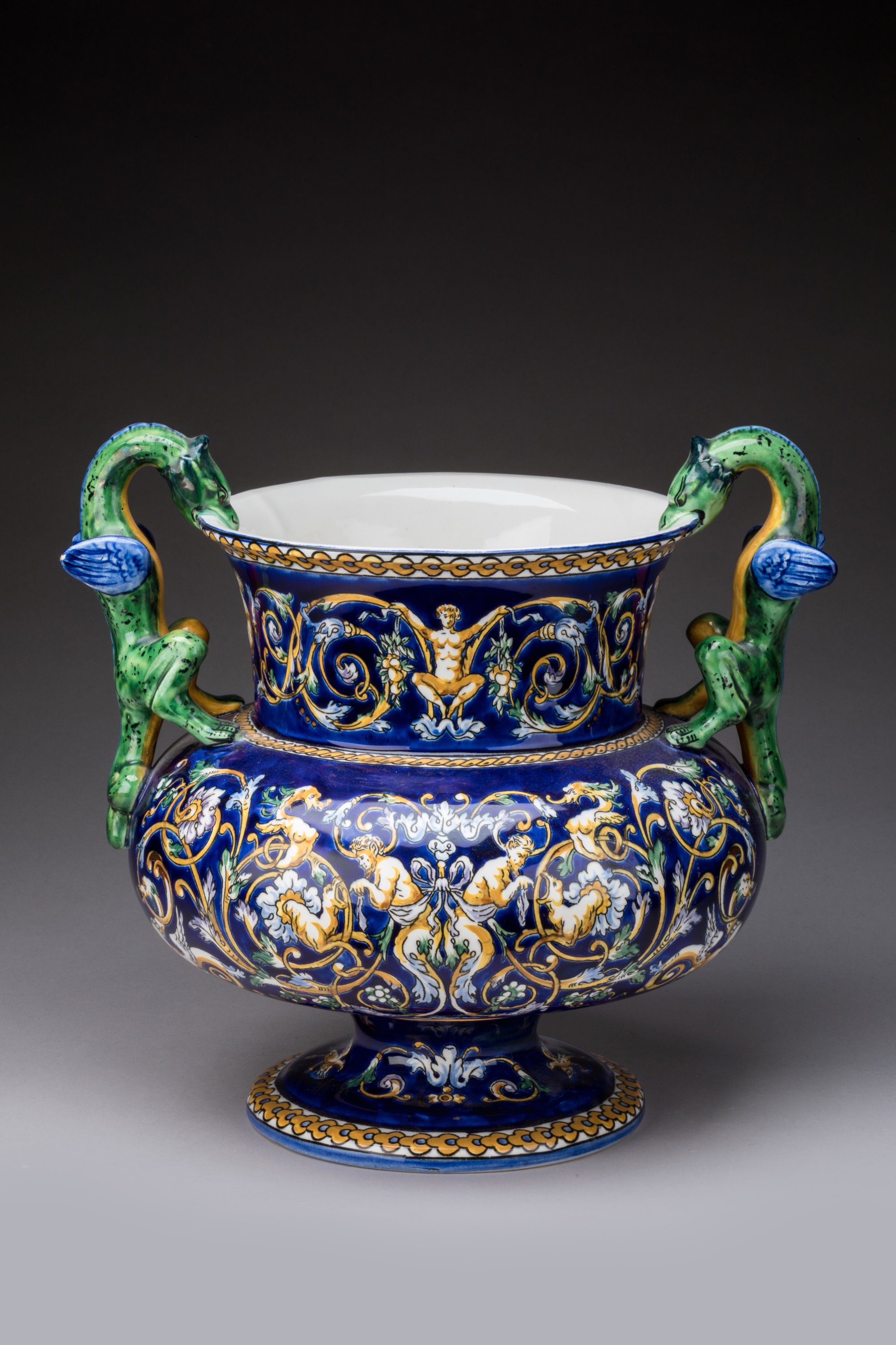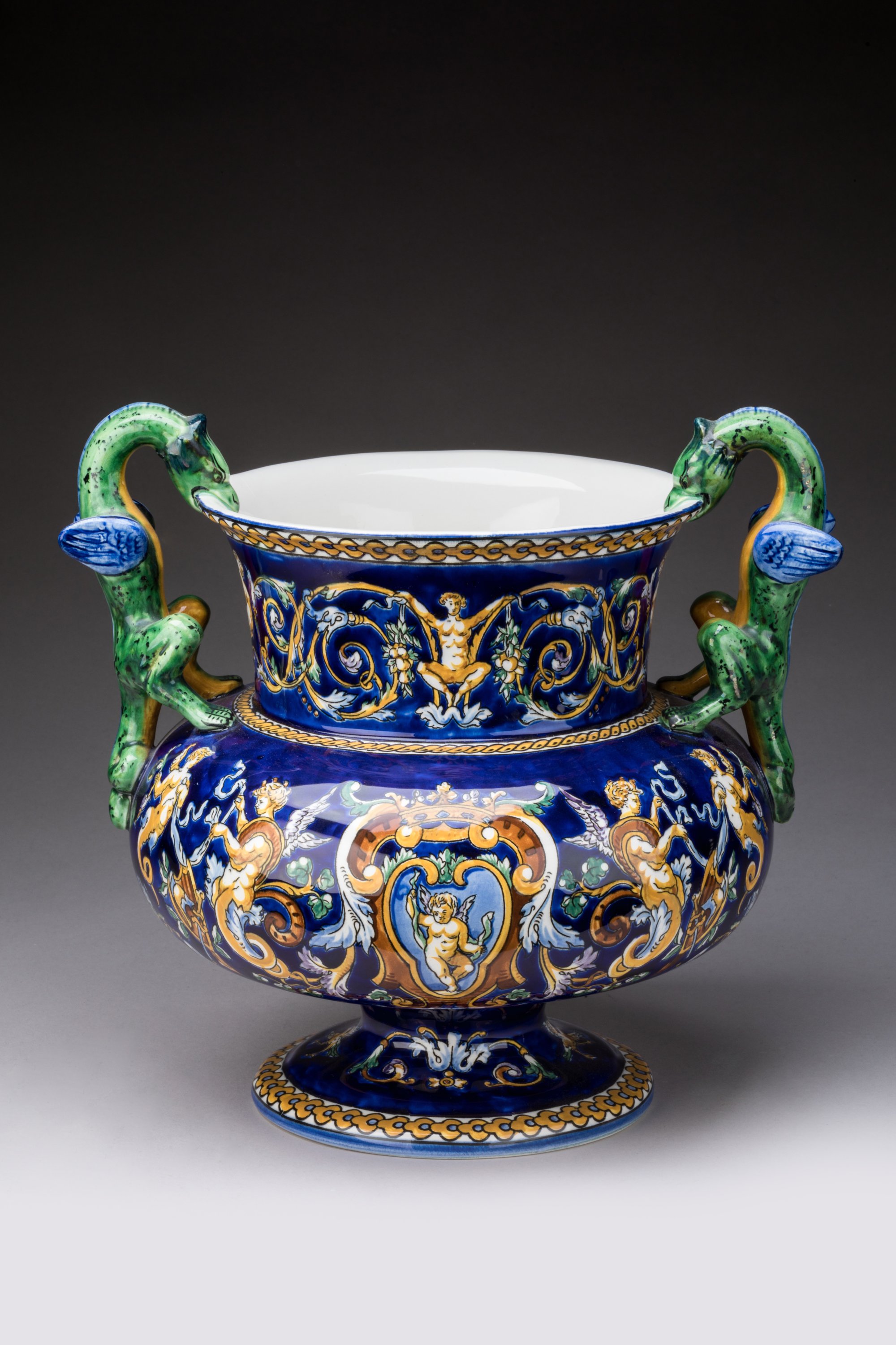 en céramique à décor de la Renaissance italienne sur fond bleu.