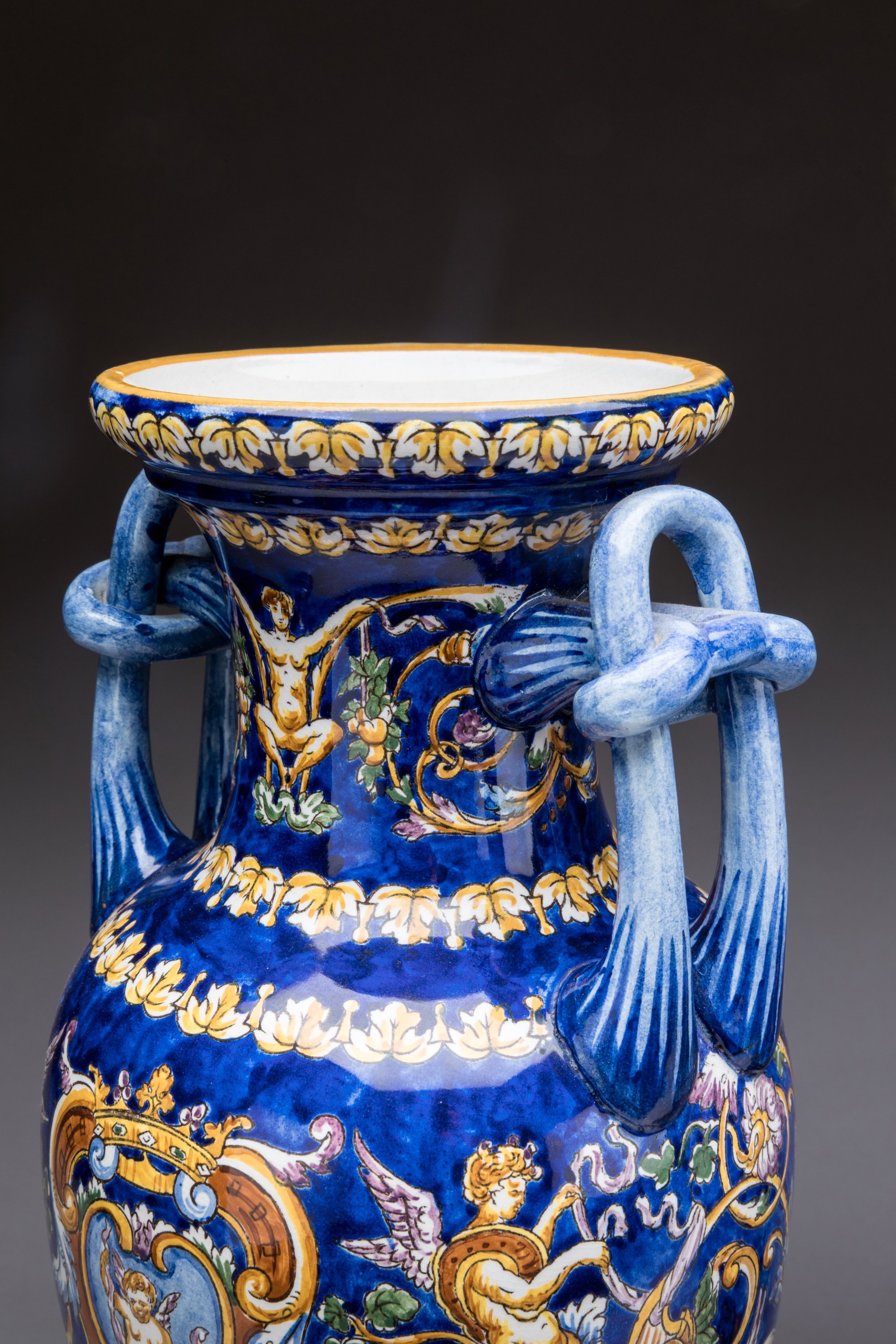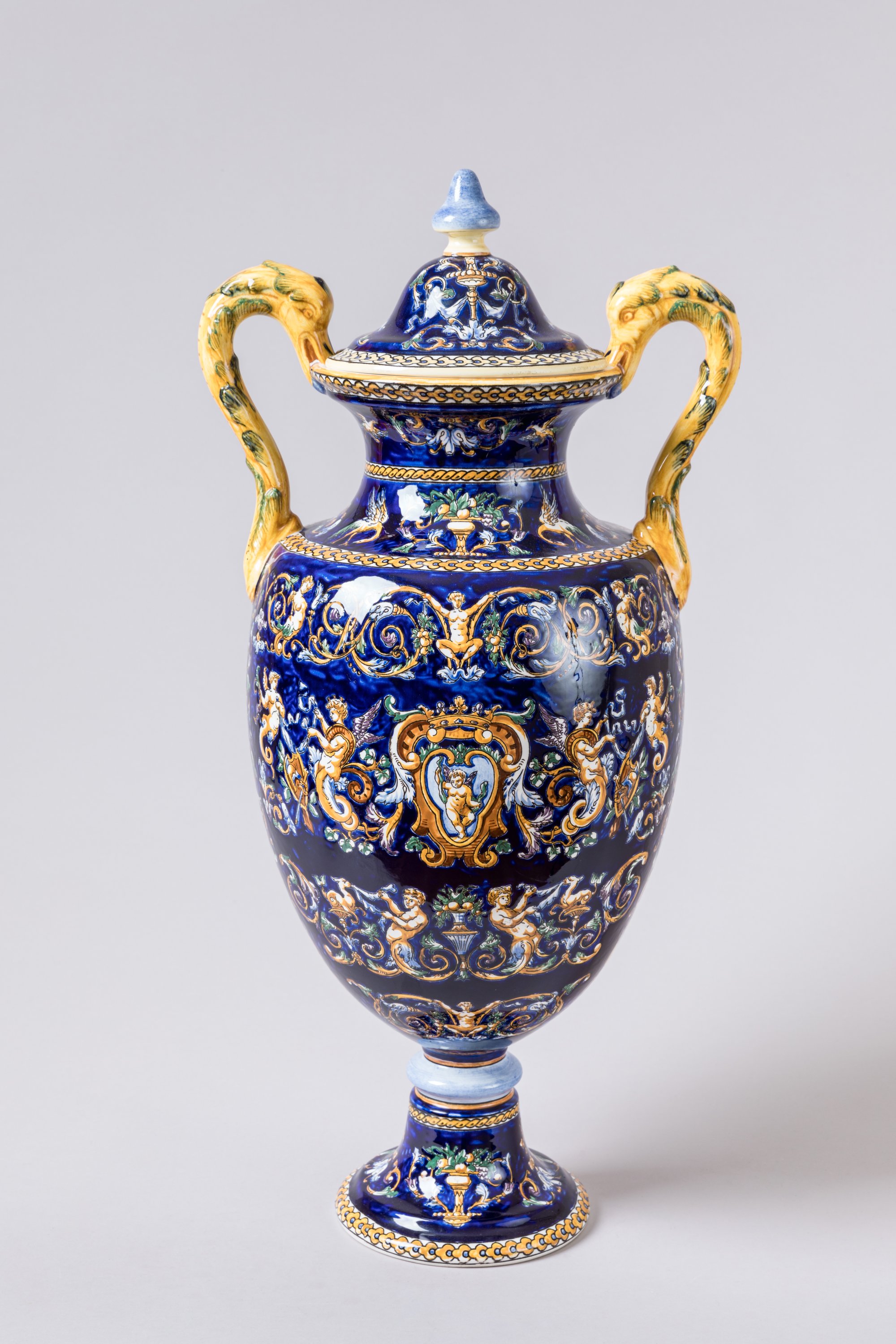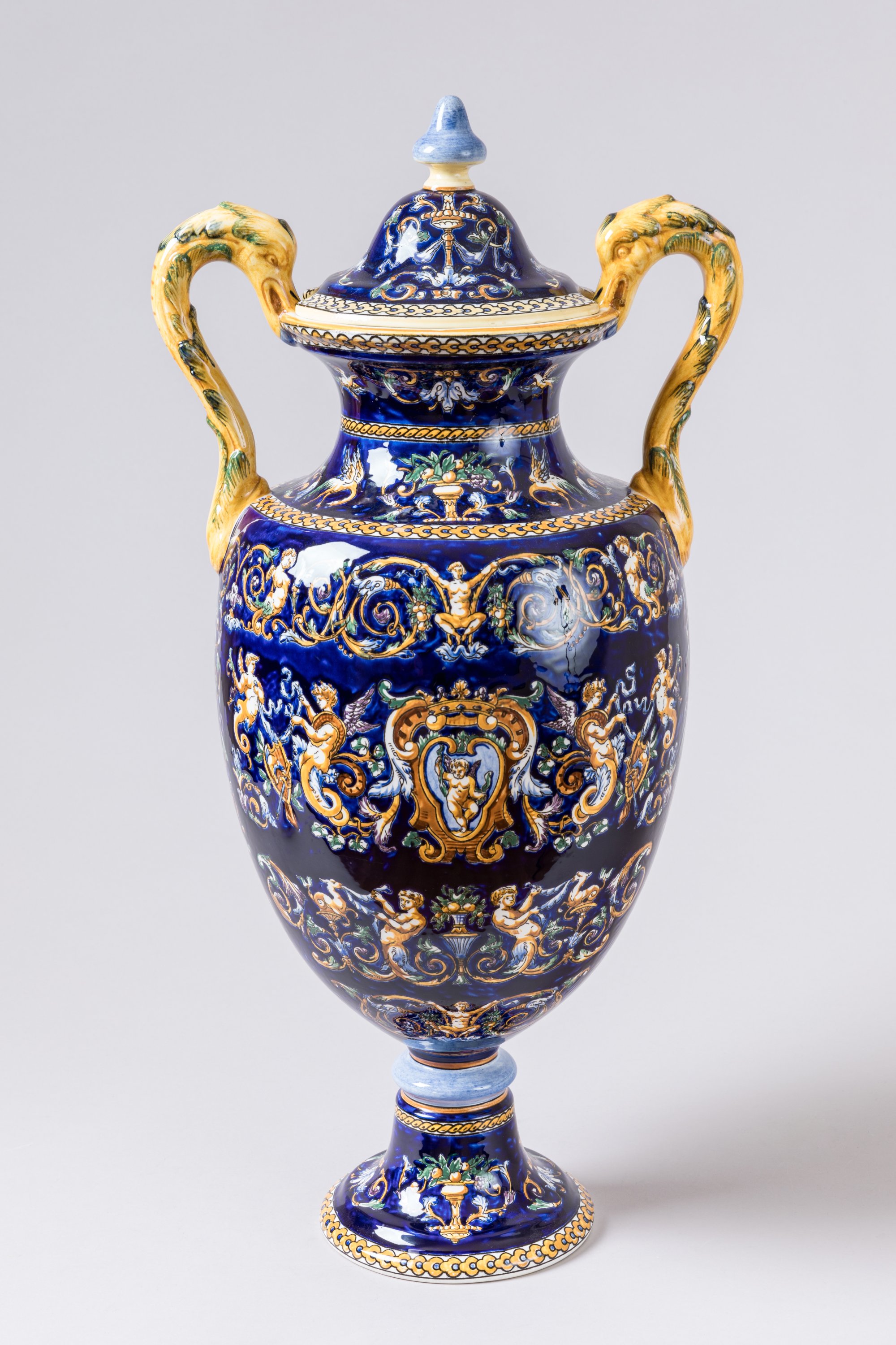 en céramique émaillée de la Renaissance italienne sur fond bleu.