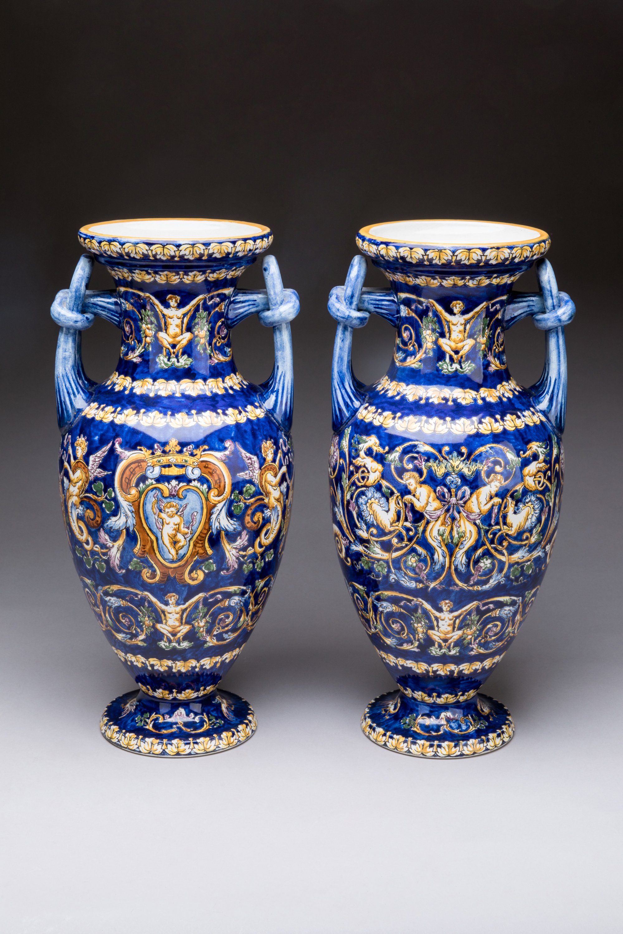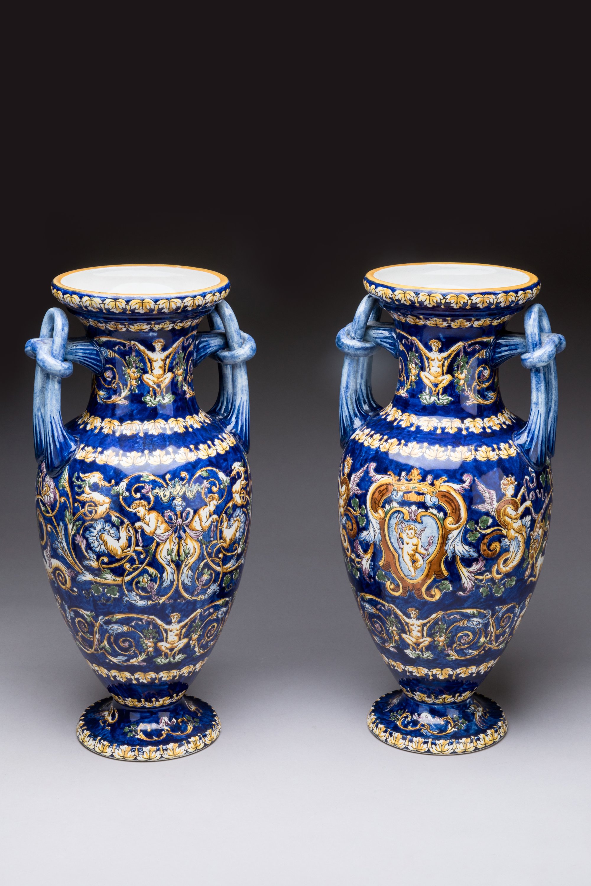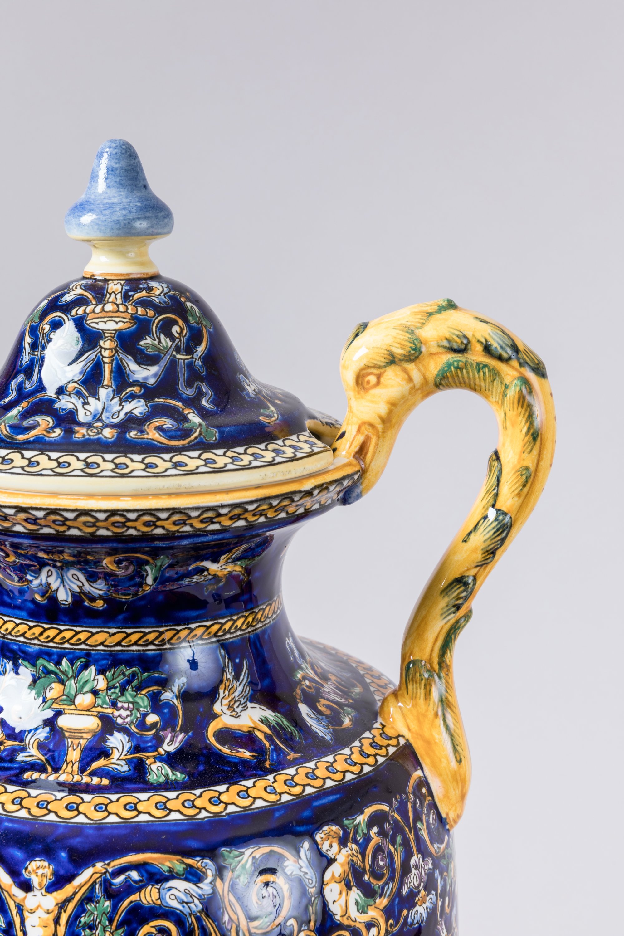 en céramique émaillée de la Renaissance italienne sur fond bleu.