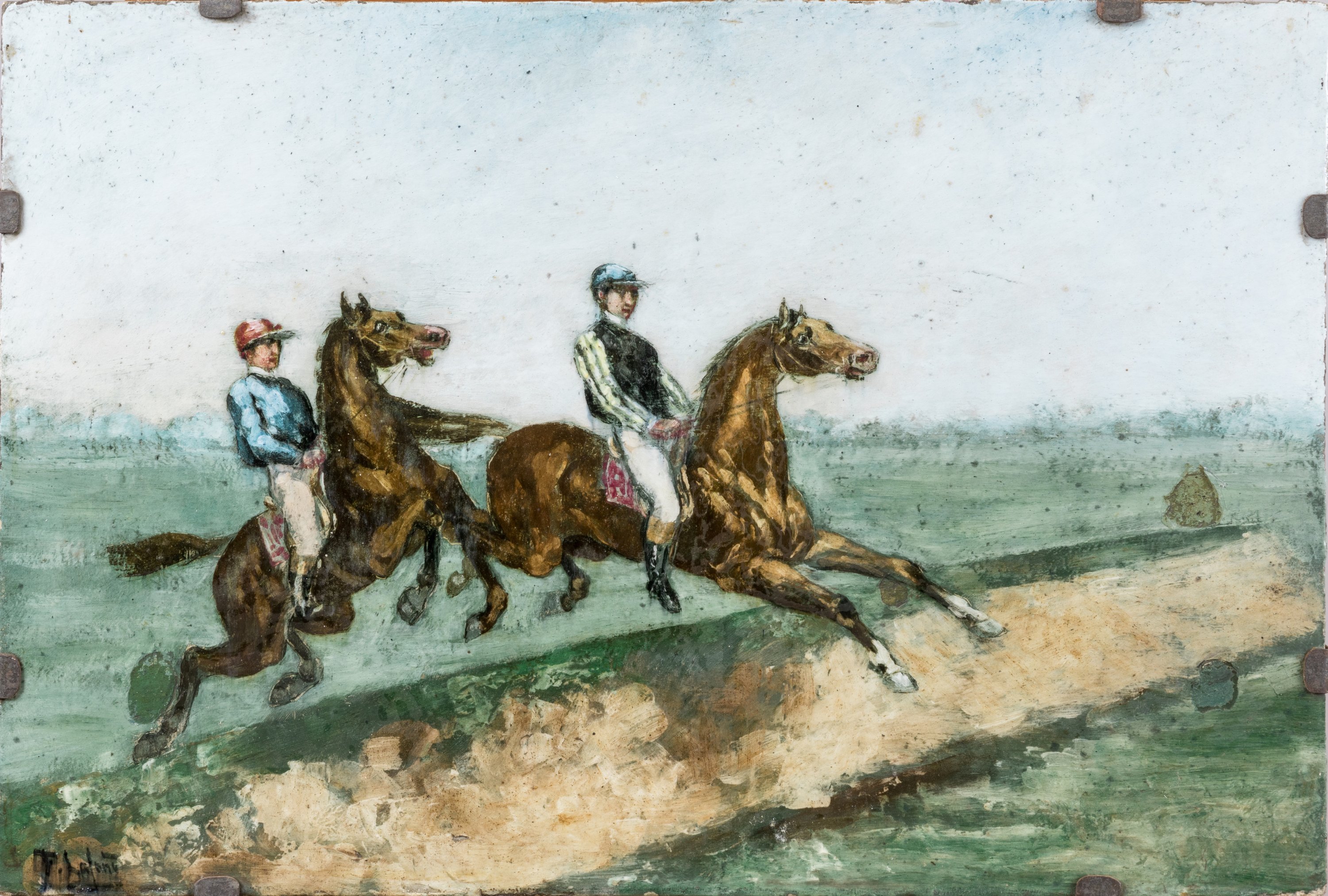 Plaque en terre chamottée peinte à l'émail polychrome d'une scène d'après Degas. Signée dans le décor.