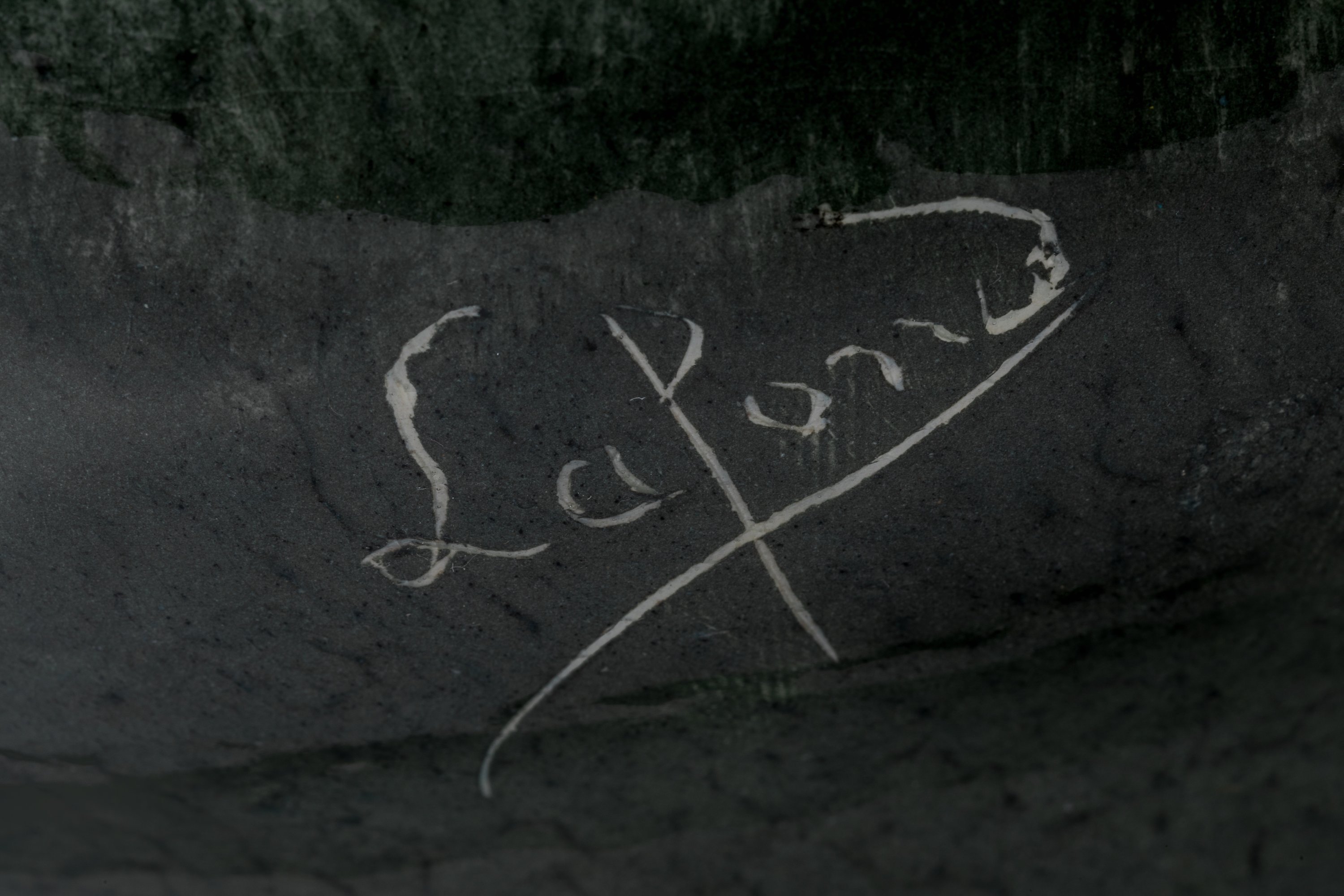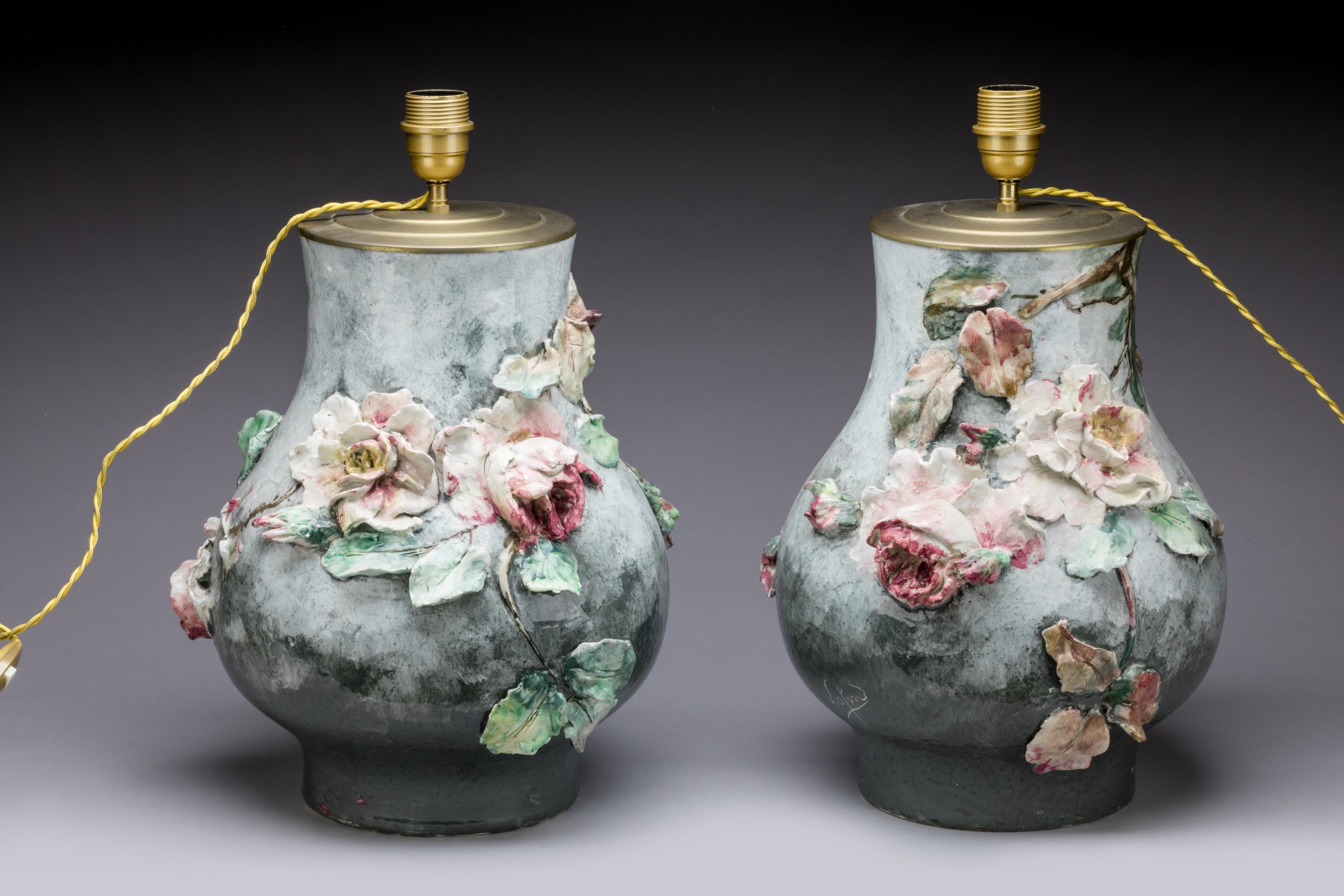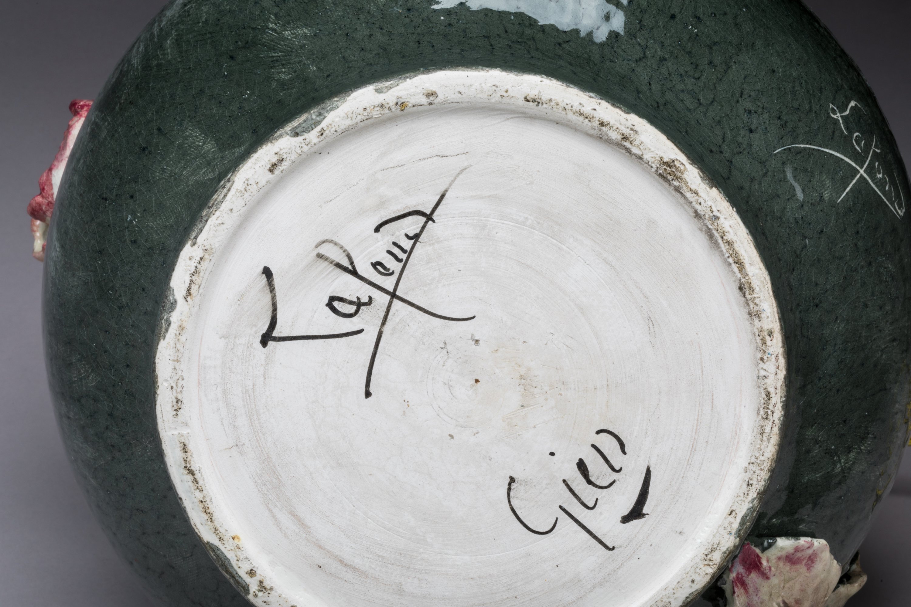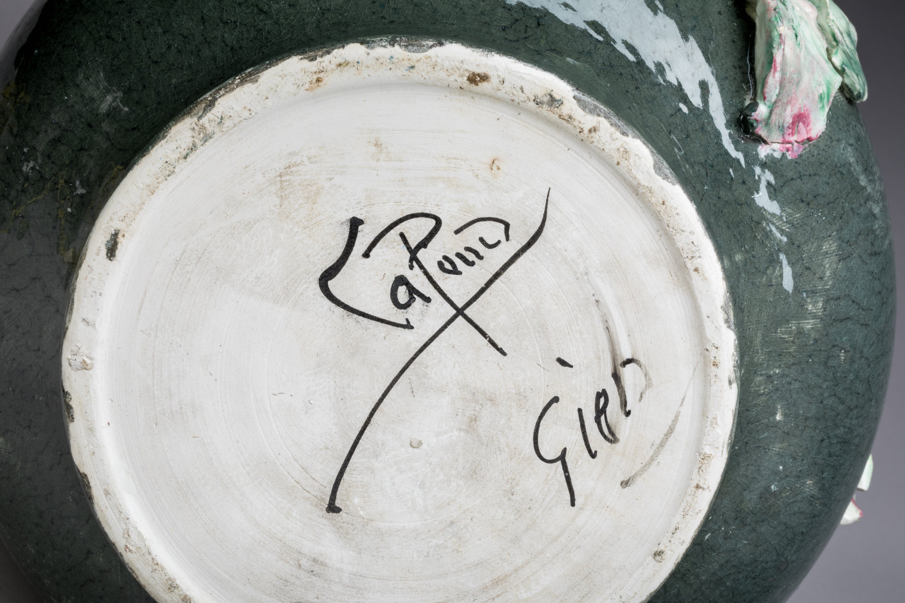 en barbotine impressionniste à décor de roses en applique sur fond gris, une signée dans le décor.