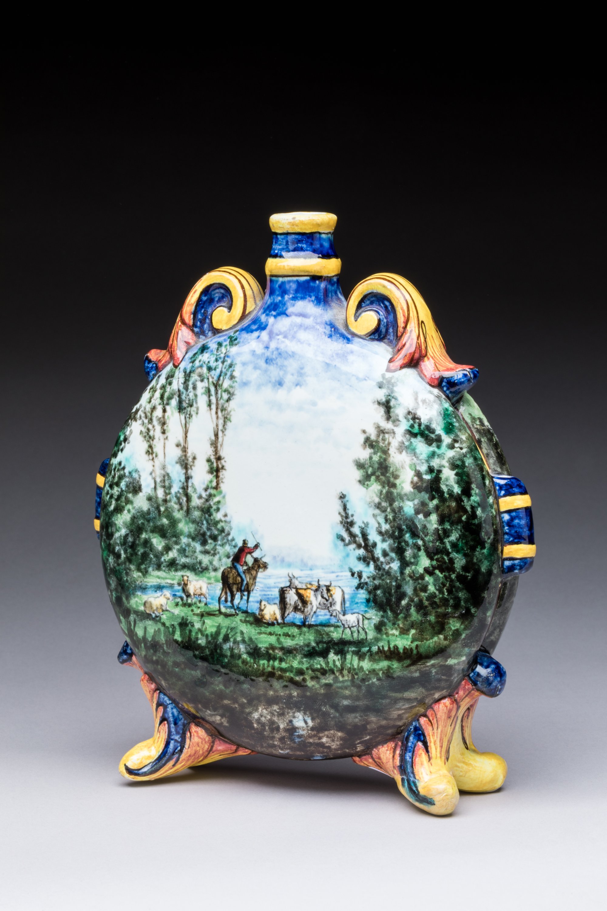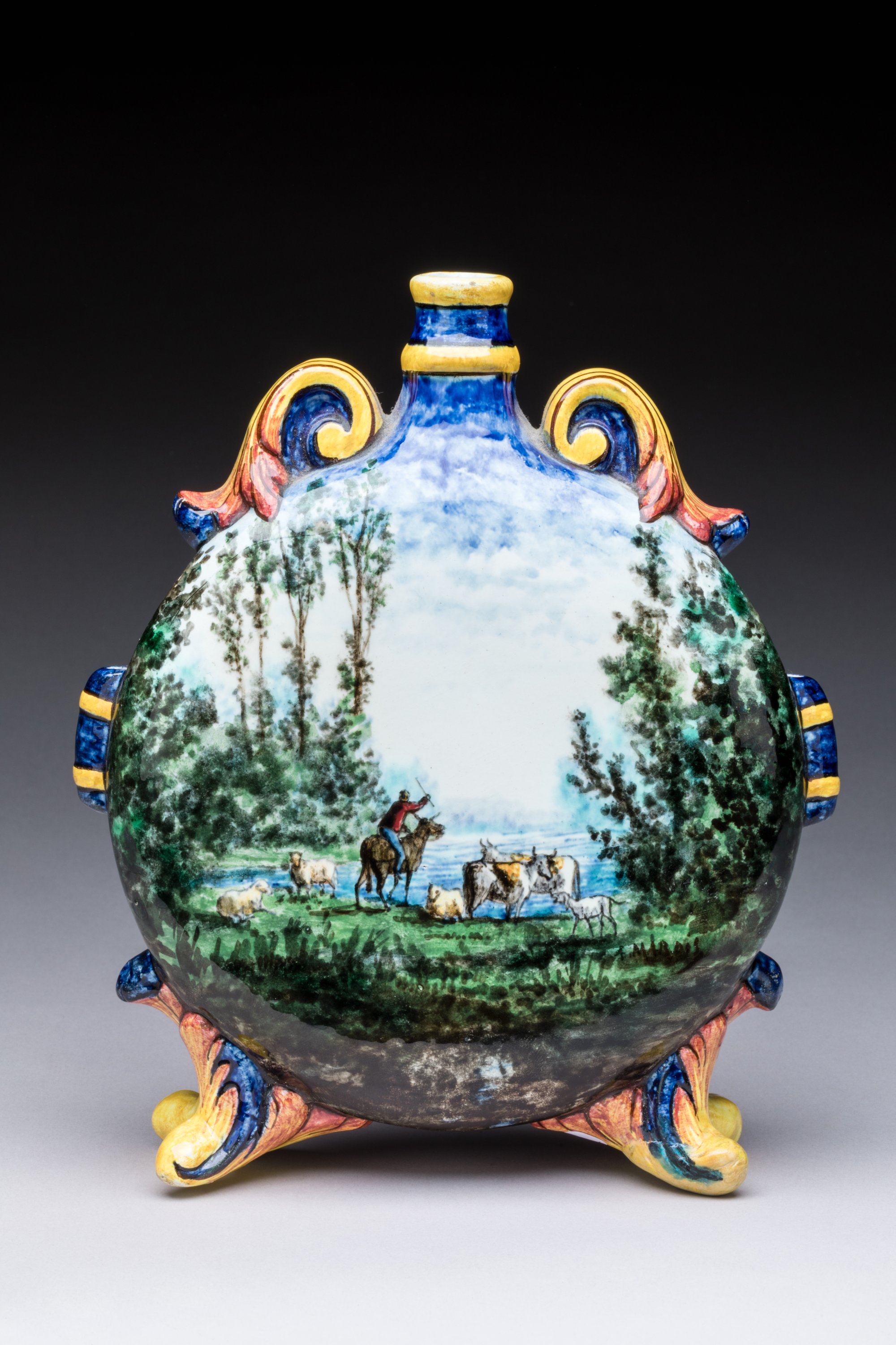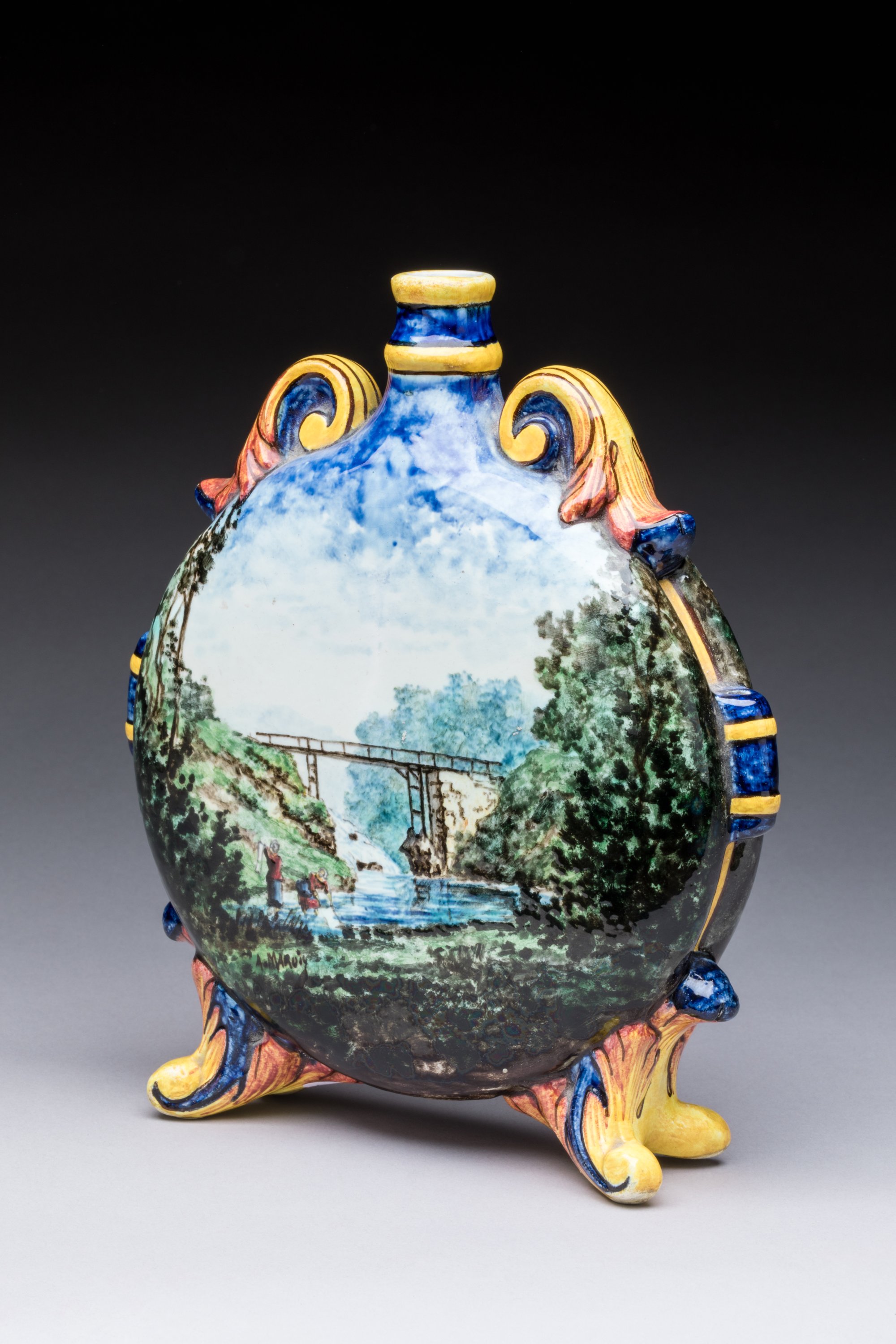 en céramique émaillée à décor peint d'un berger au bord d'un lac d'une part et de lavandières au bord d'un lac d'autre part. Signée dans le décor.