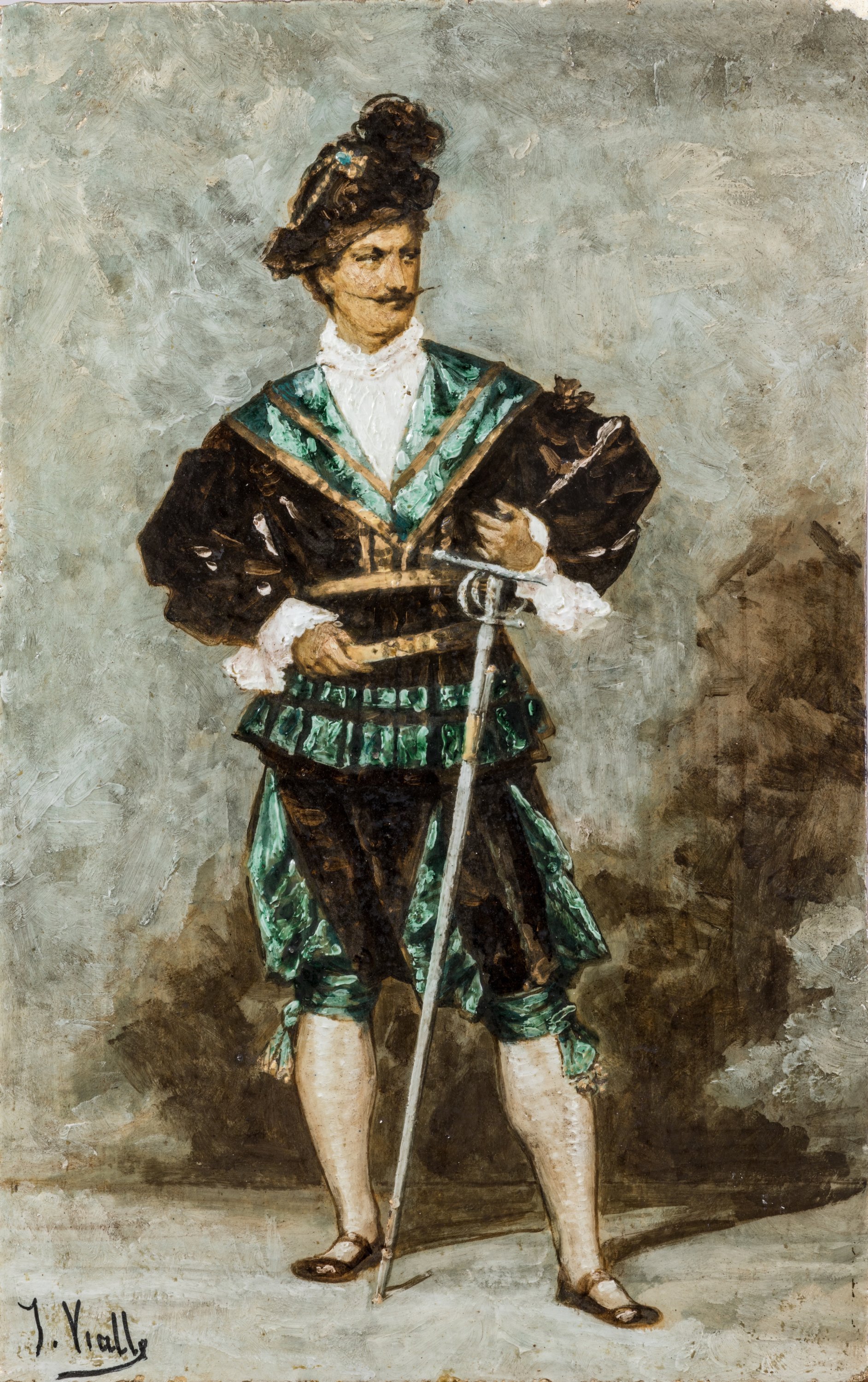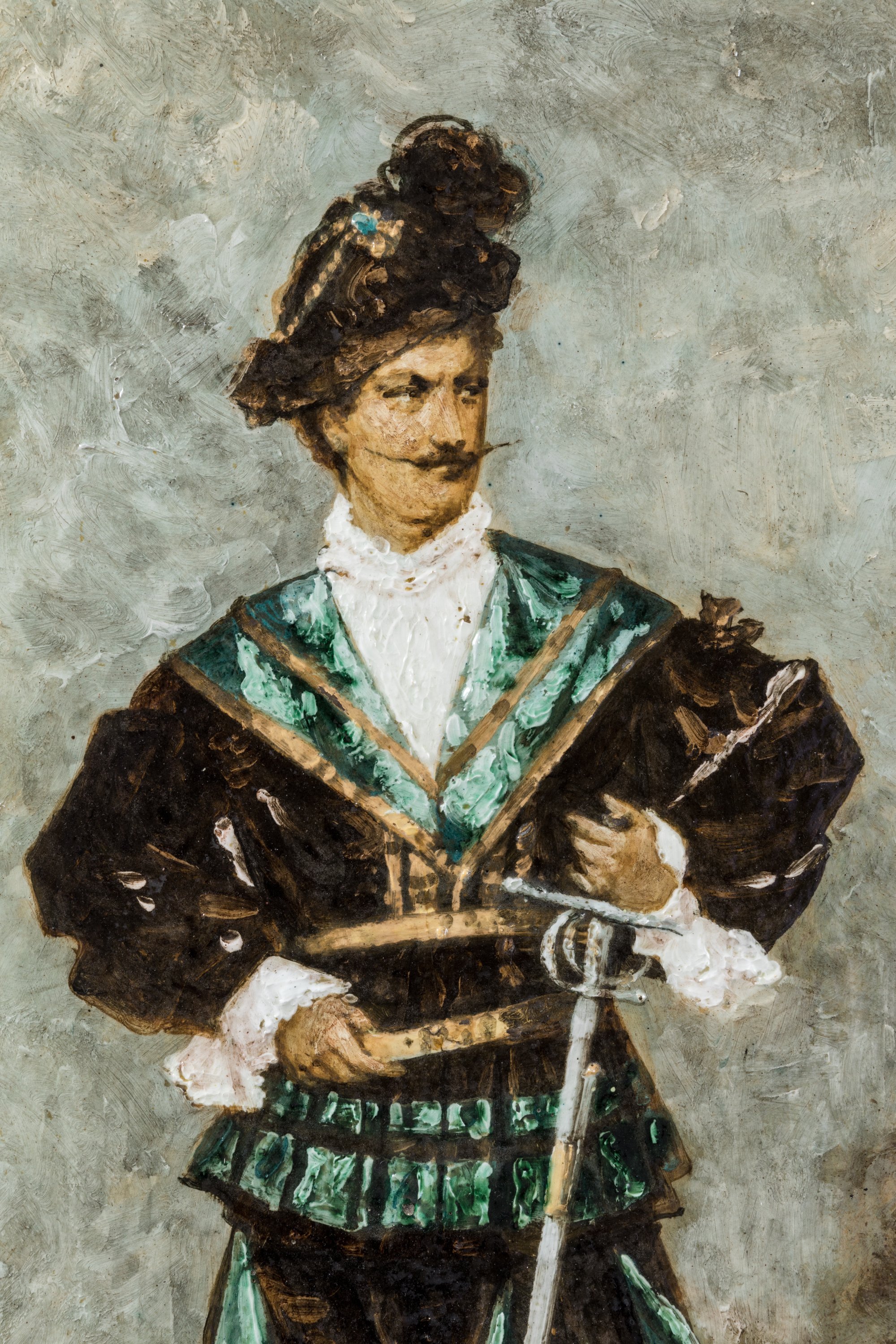 Exceptionnelle plaque en terre chamottée émaillée polychrome représentant d'Estrées en tenue d'apparat avec son épée.