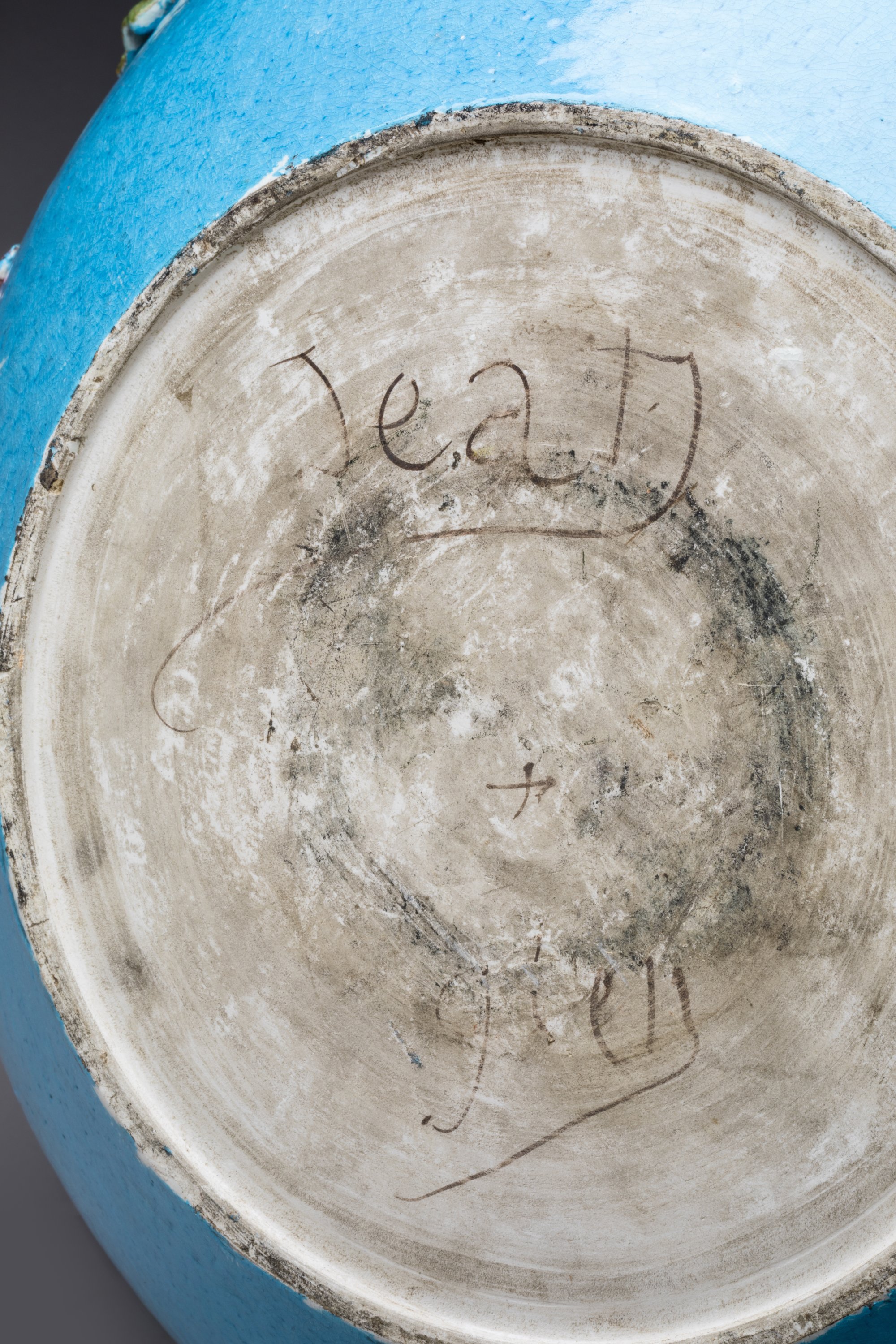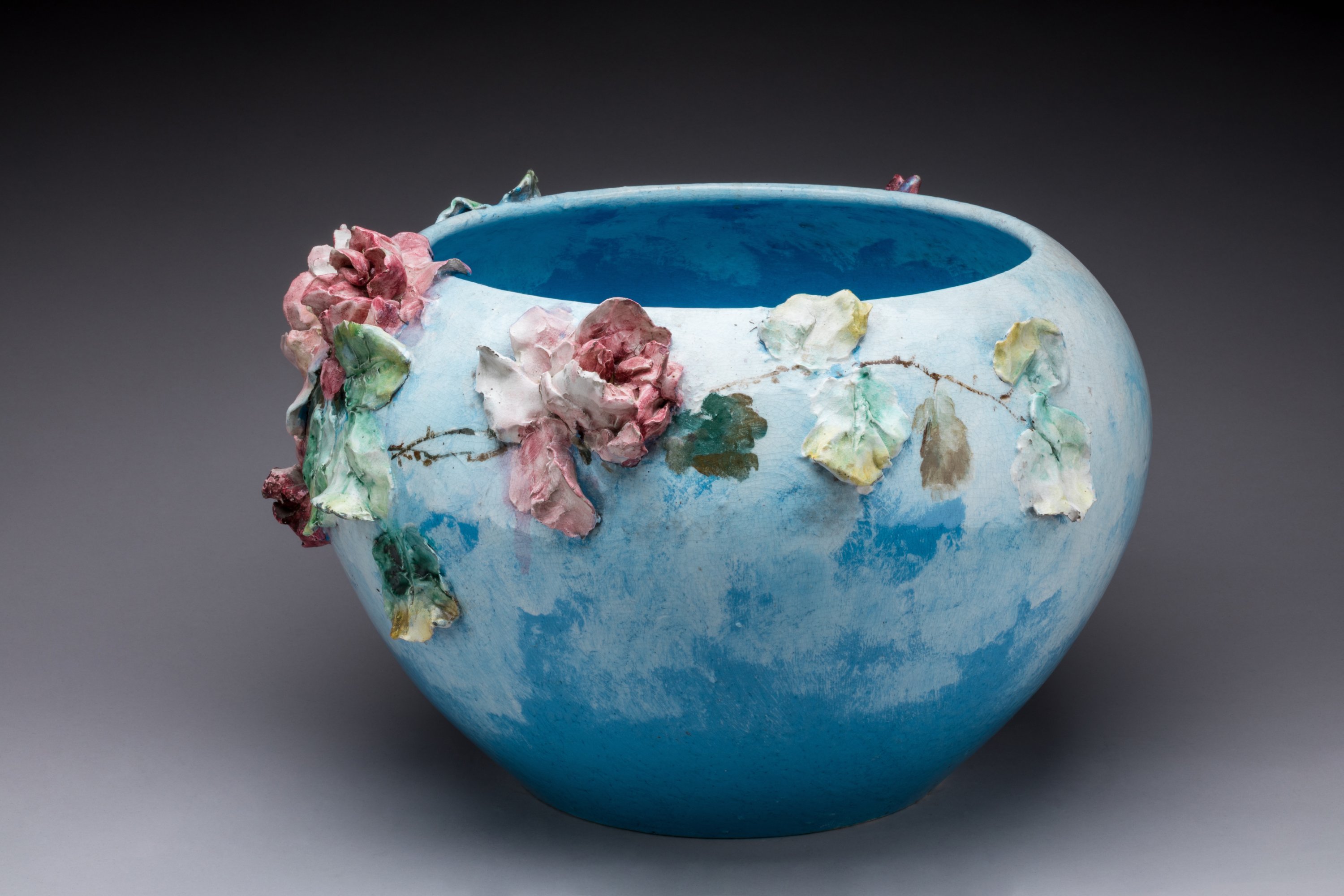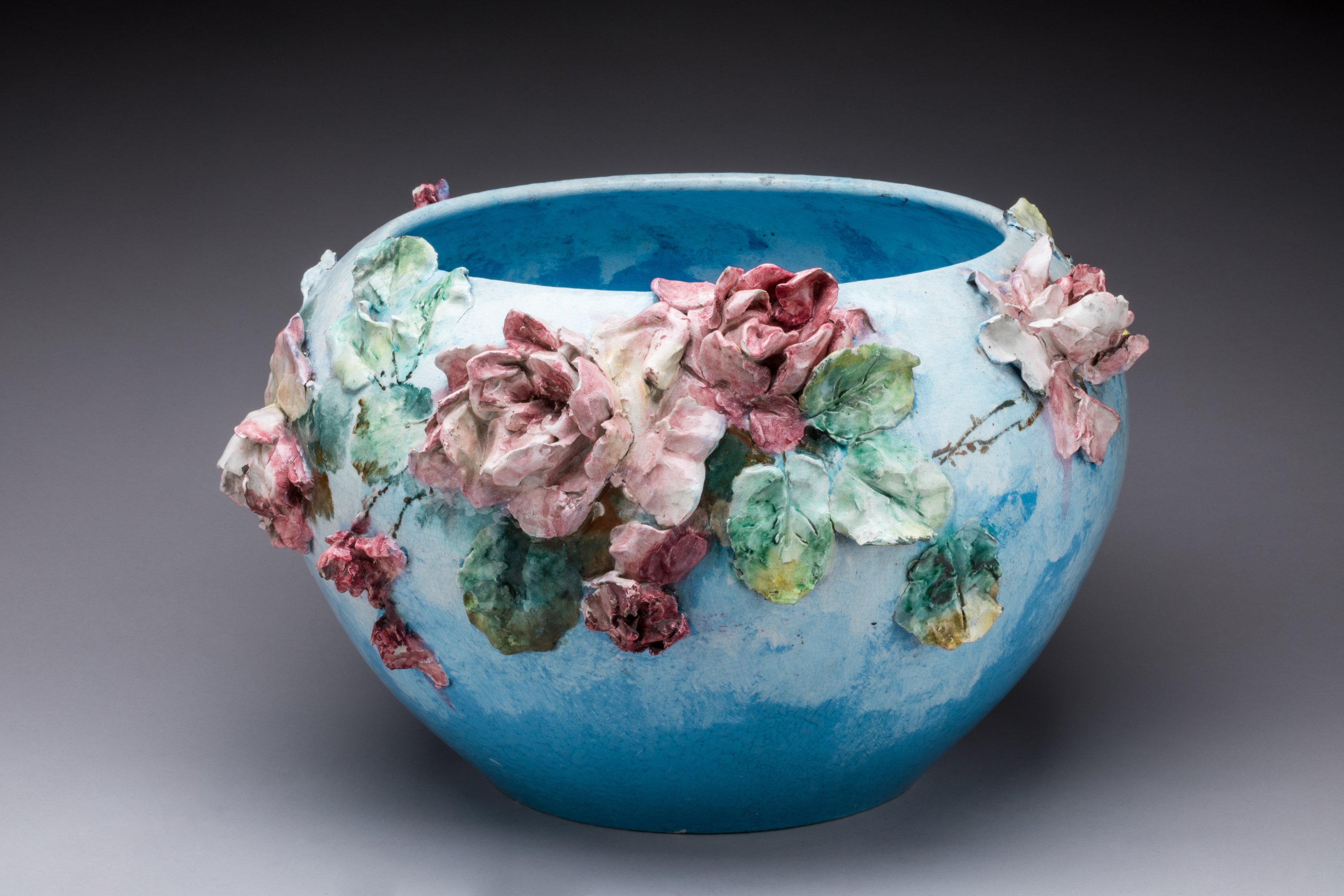 en céramique émaillée sur fond bleu ciel avec des roses en appliques.