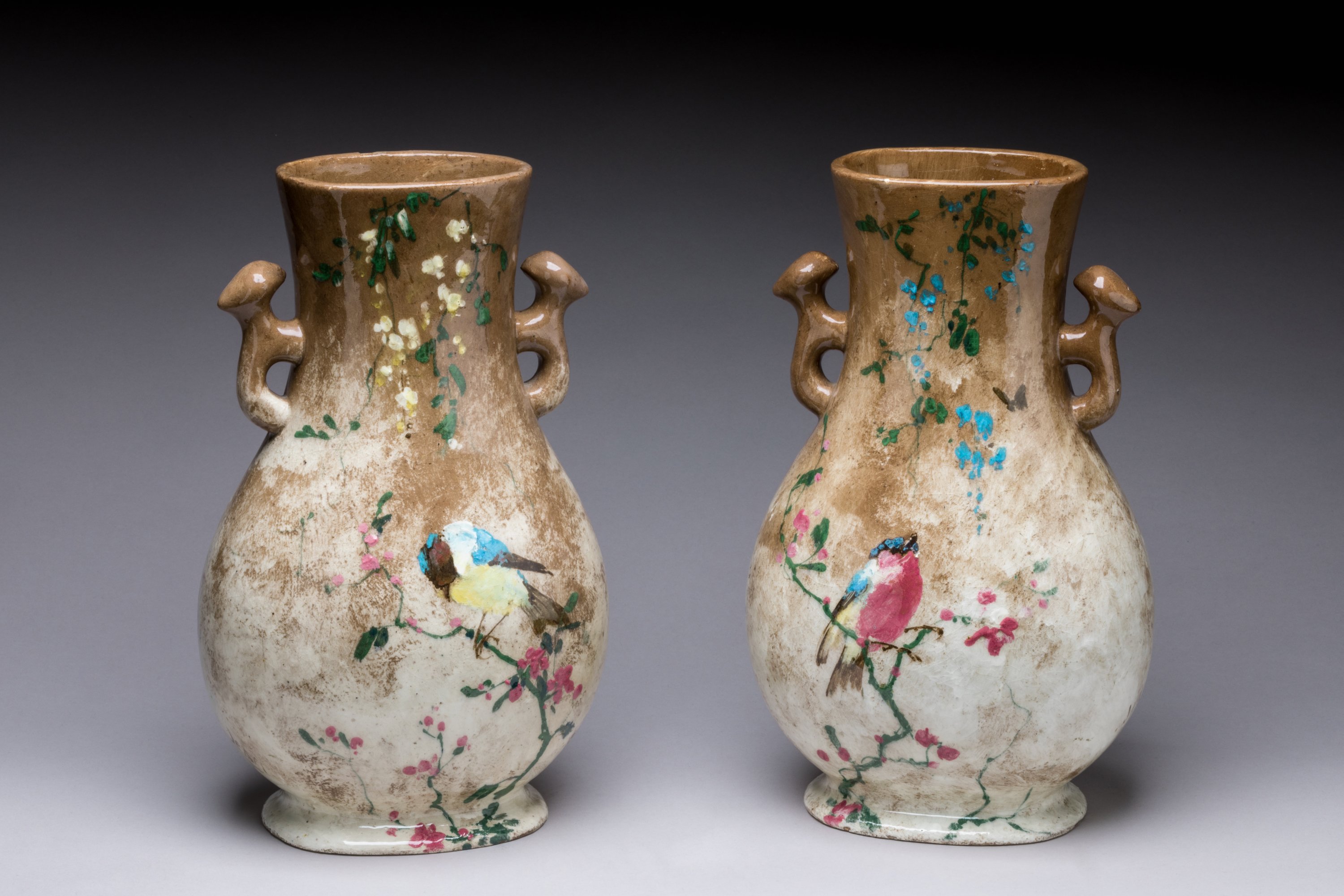 en barbotine émaillée à décor de rouges-gorges et de mésanges perchés sur fond marron dégradé signé JeAn.
