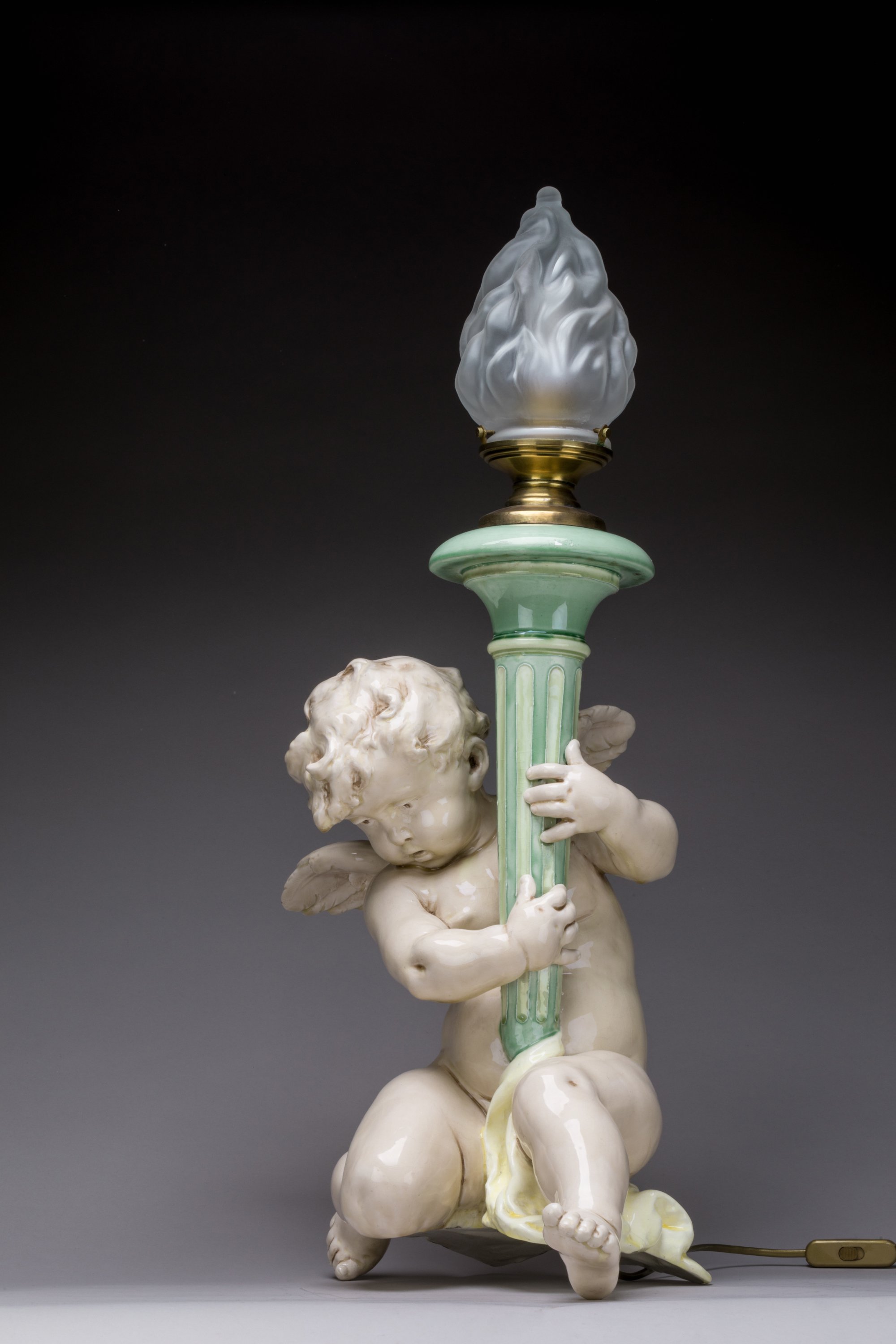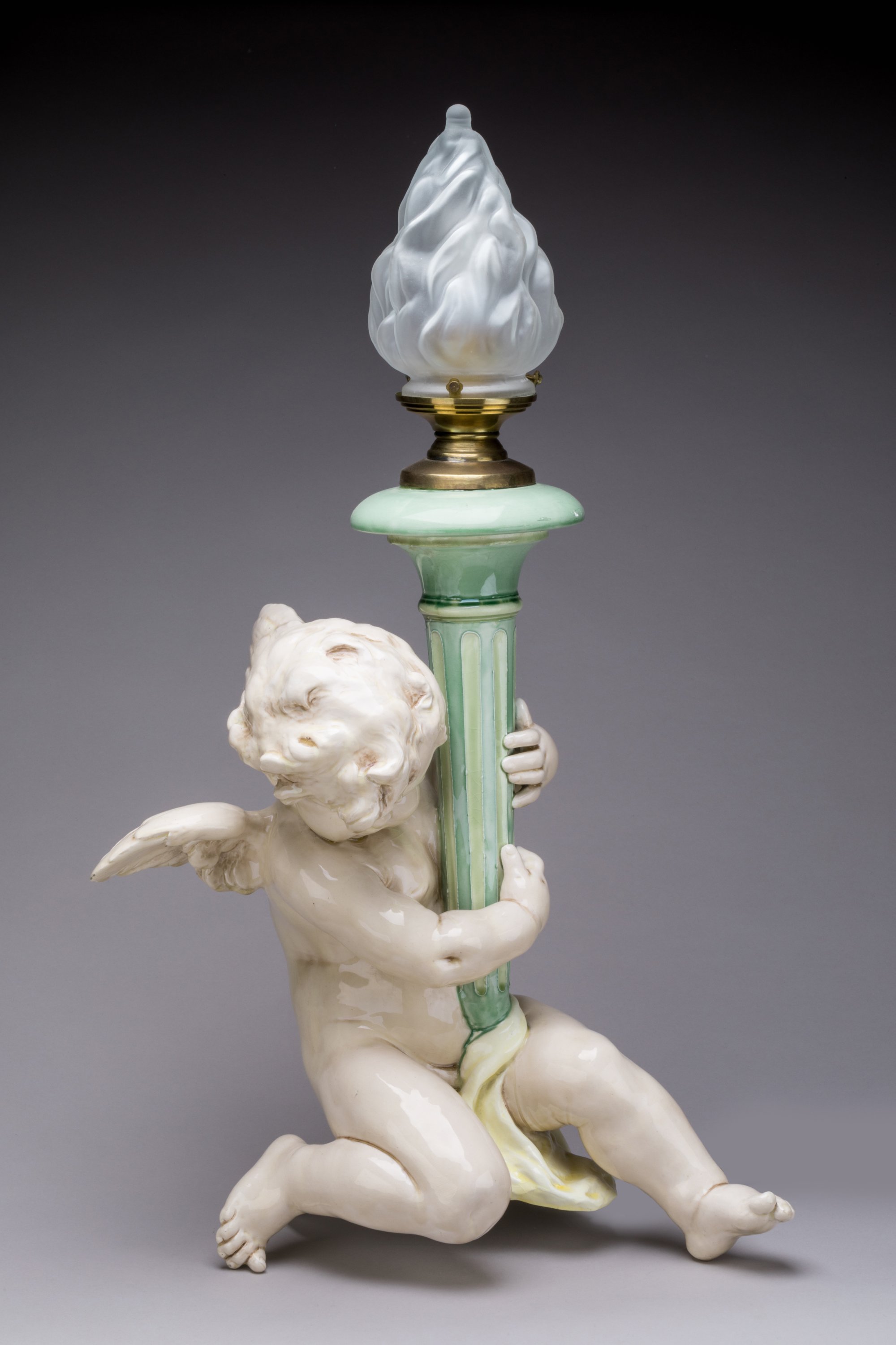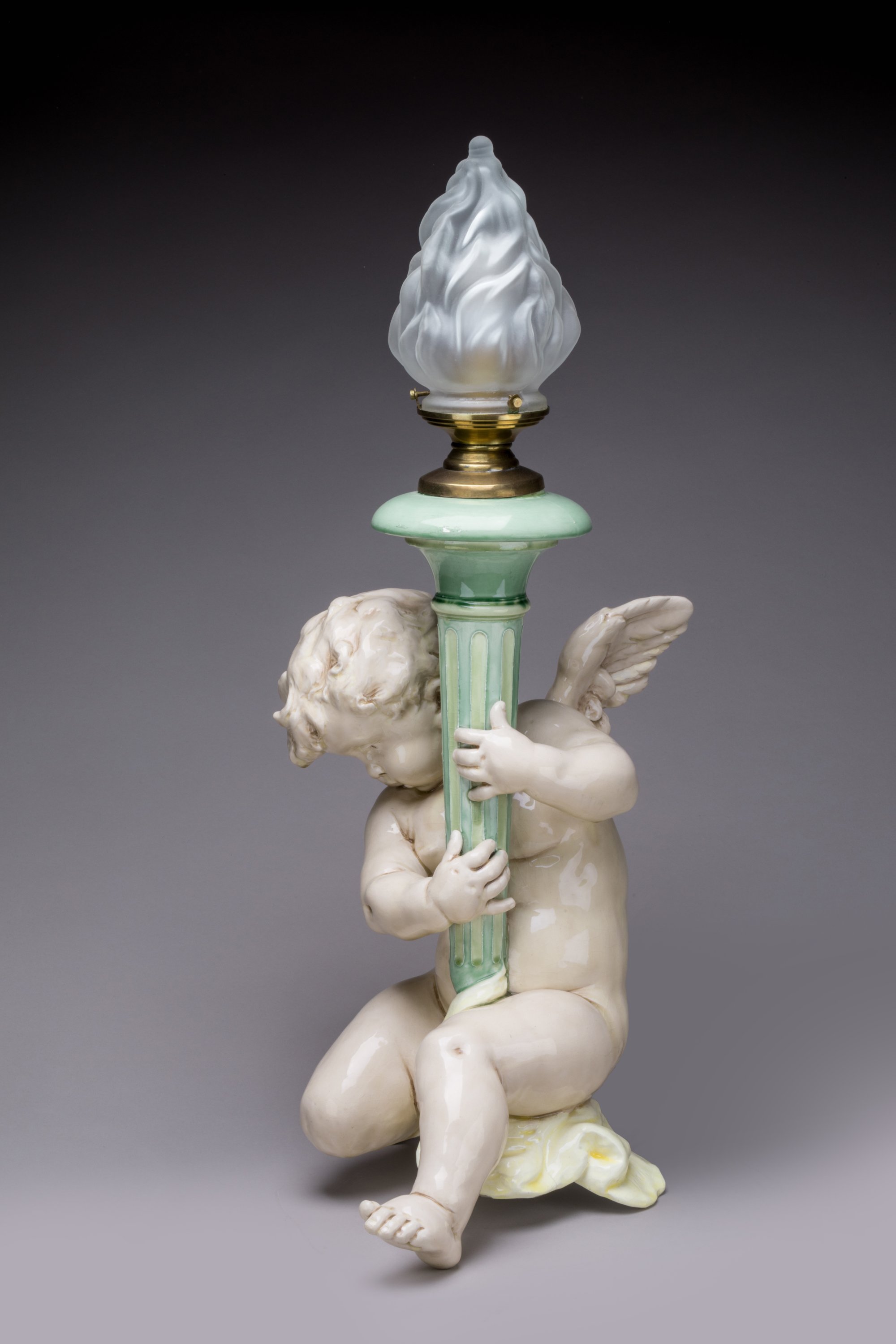 Ce modèle de putto à la torchère surmontait lexceptionnelle horloge en gaine présentée lors de lExposition universelle de 1900 à Paris. Lensemble complet est exposé au Musée de Gien.