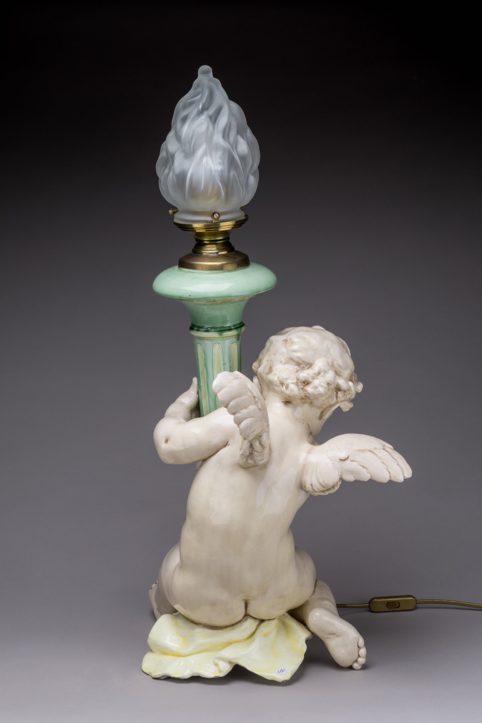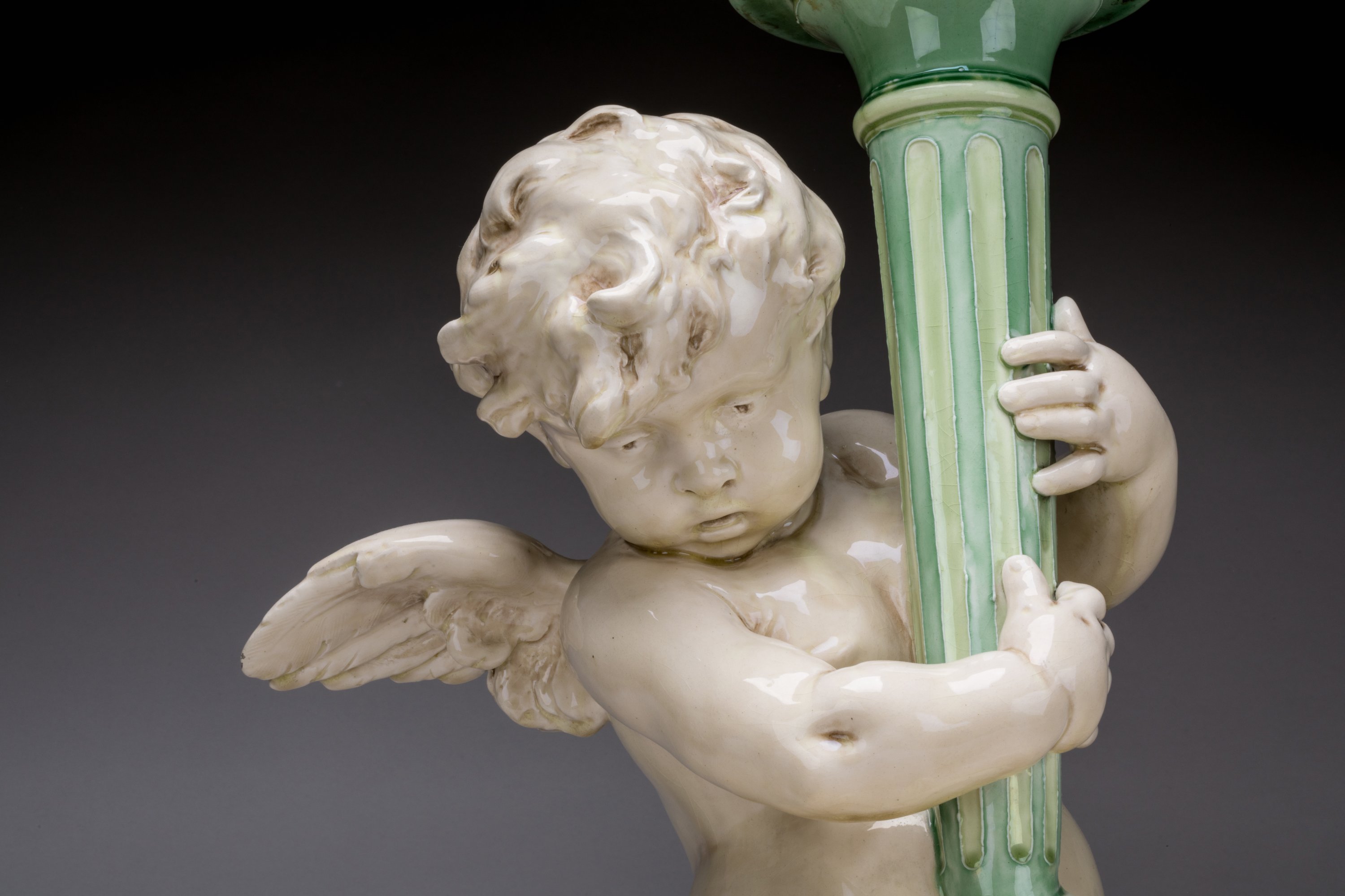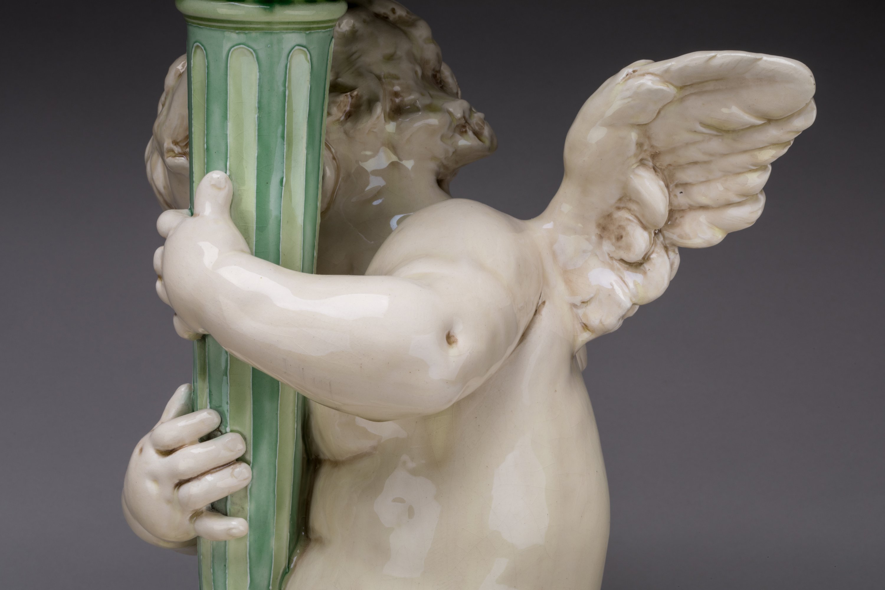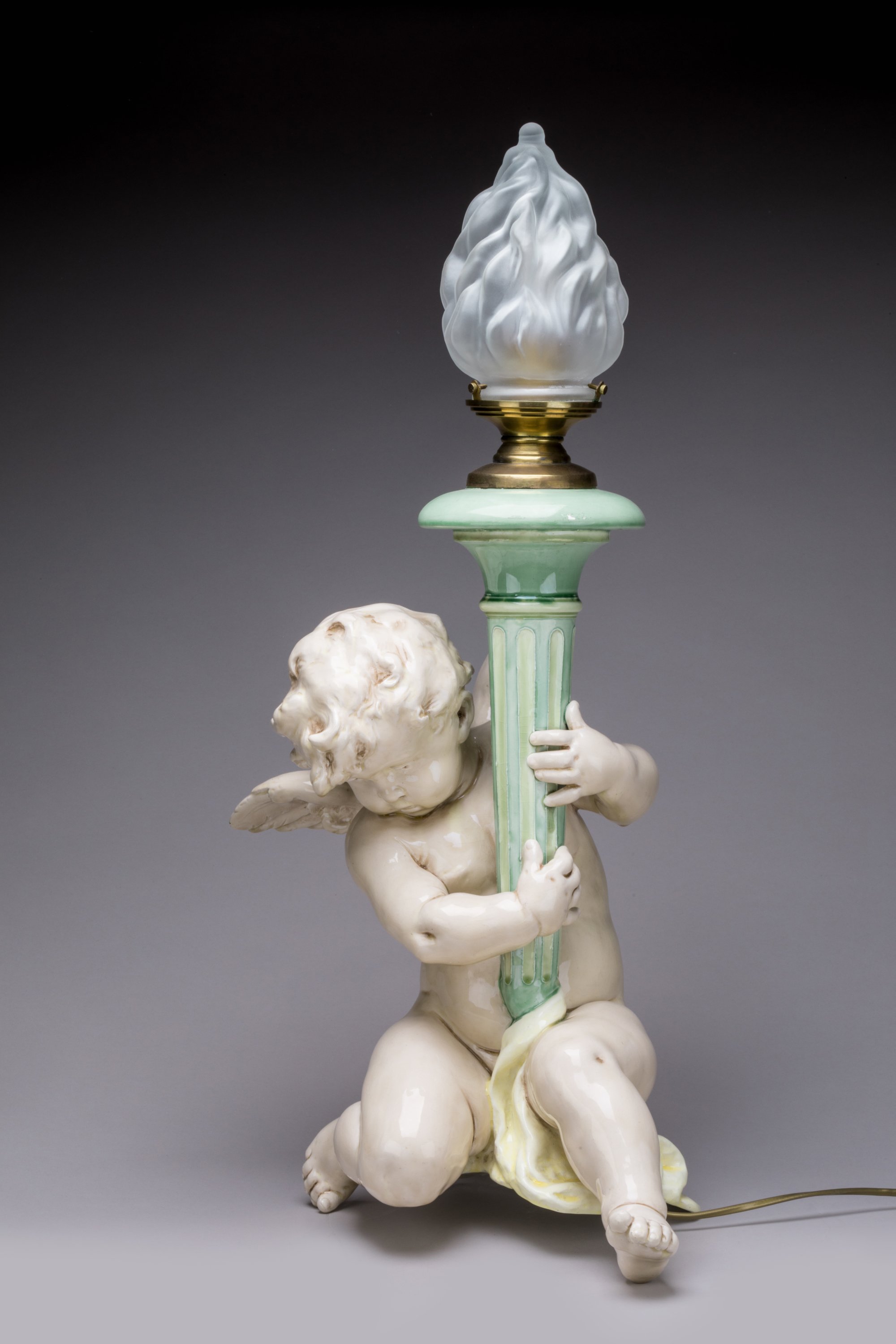 Ce modèle de putto à la torchère surmontait lexceptionnelle horloge en gaine présentée lors de lExposition universelle de 1900 à Paris. Lensemble complet est exposé au Musée de Gien.