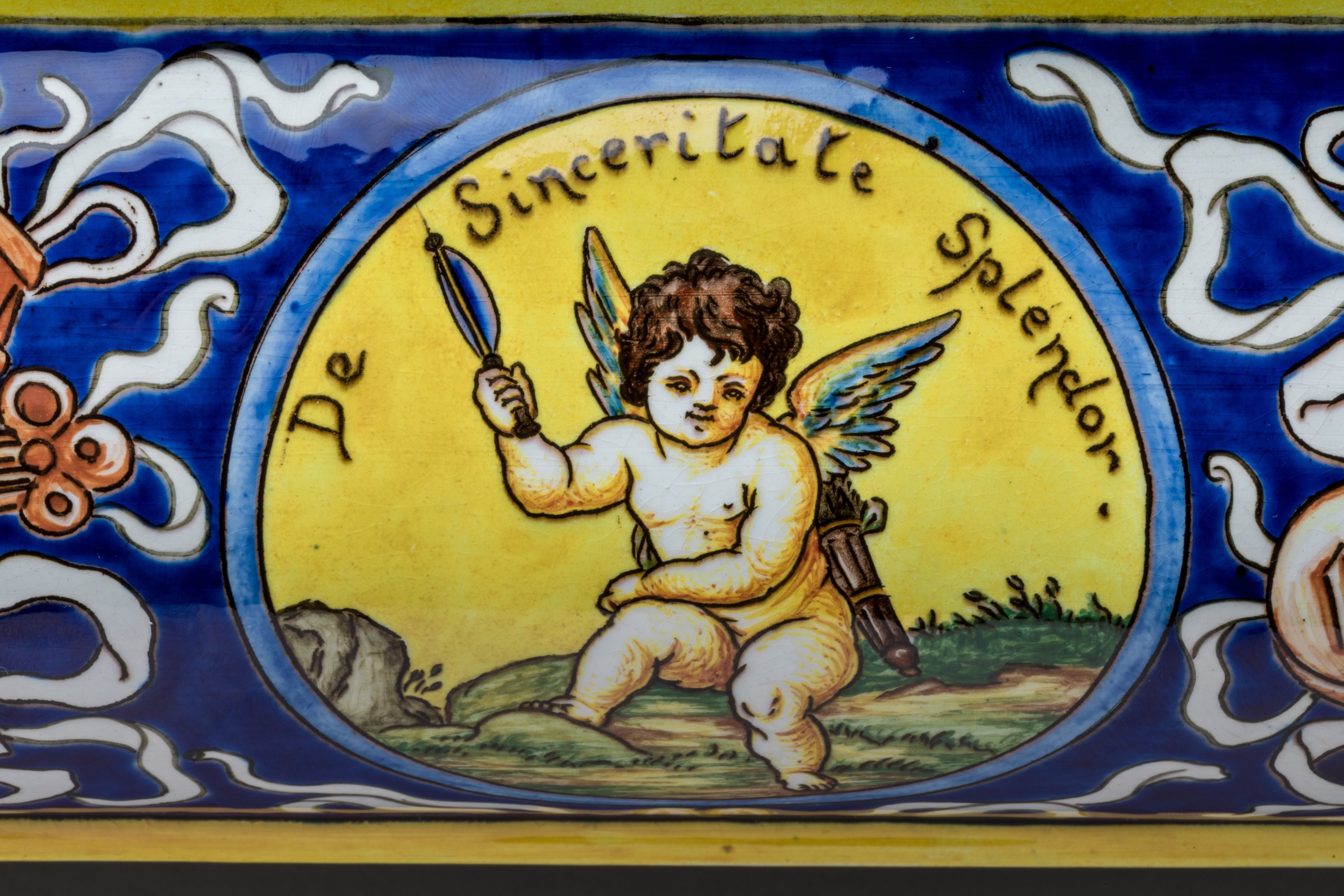en céramique émaille à décor d'attributs guerriers et attributs musicaux sur fond bleu avec deux médaillons aux angelots. Légende: "De Sinceritate Splendor".