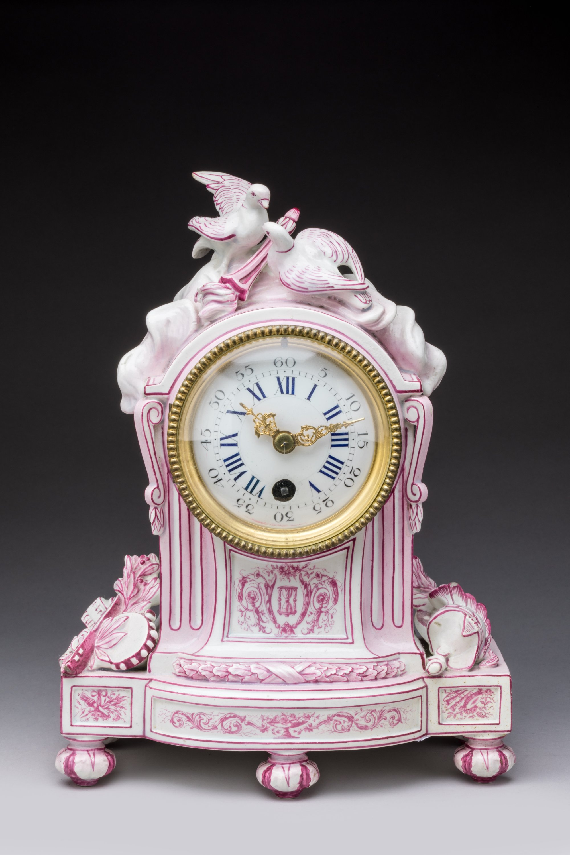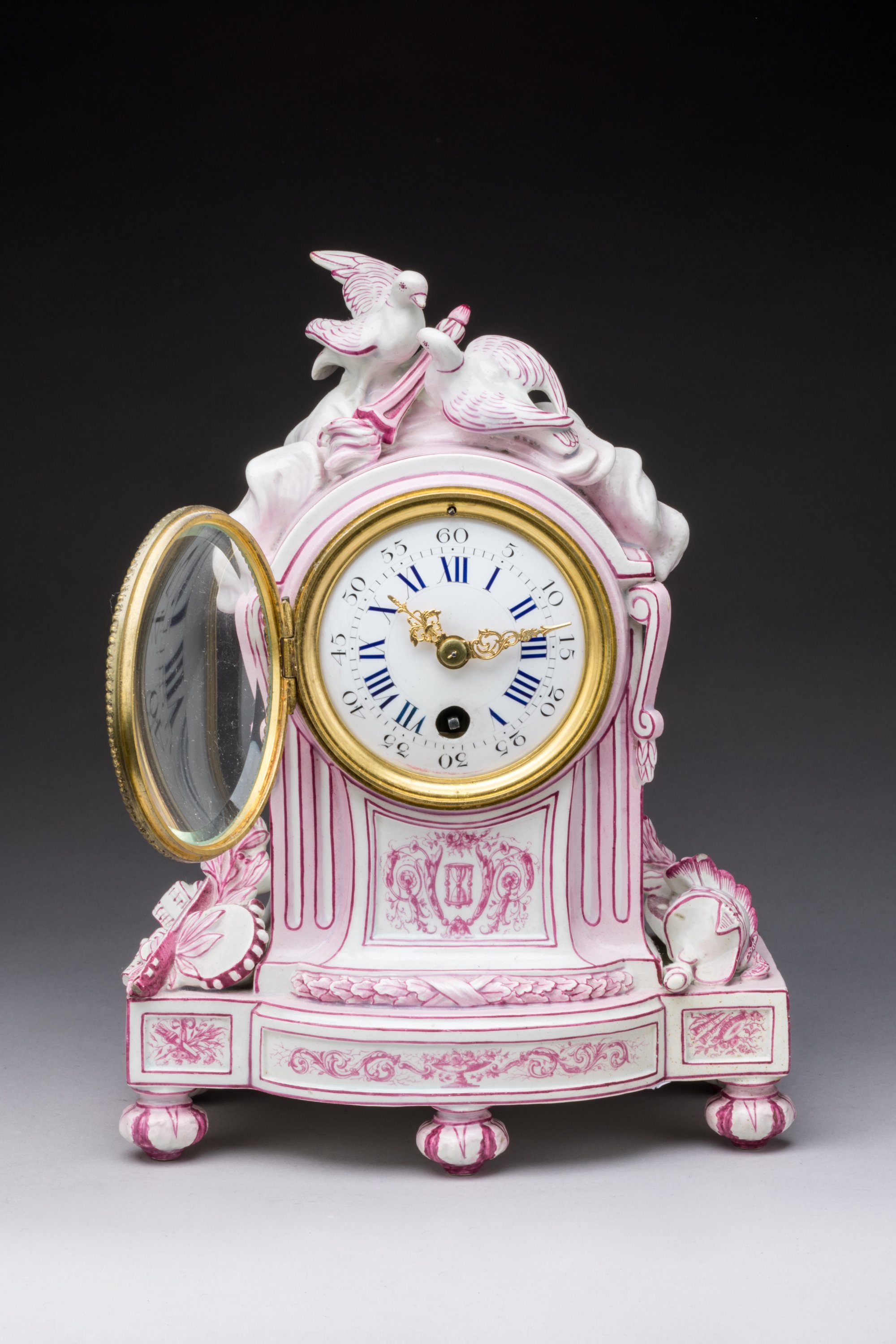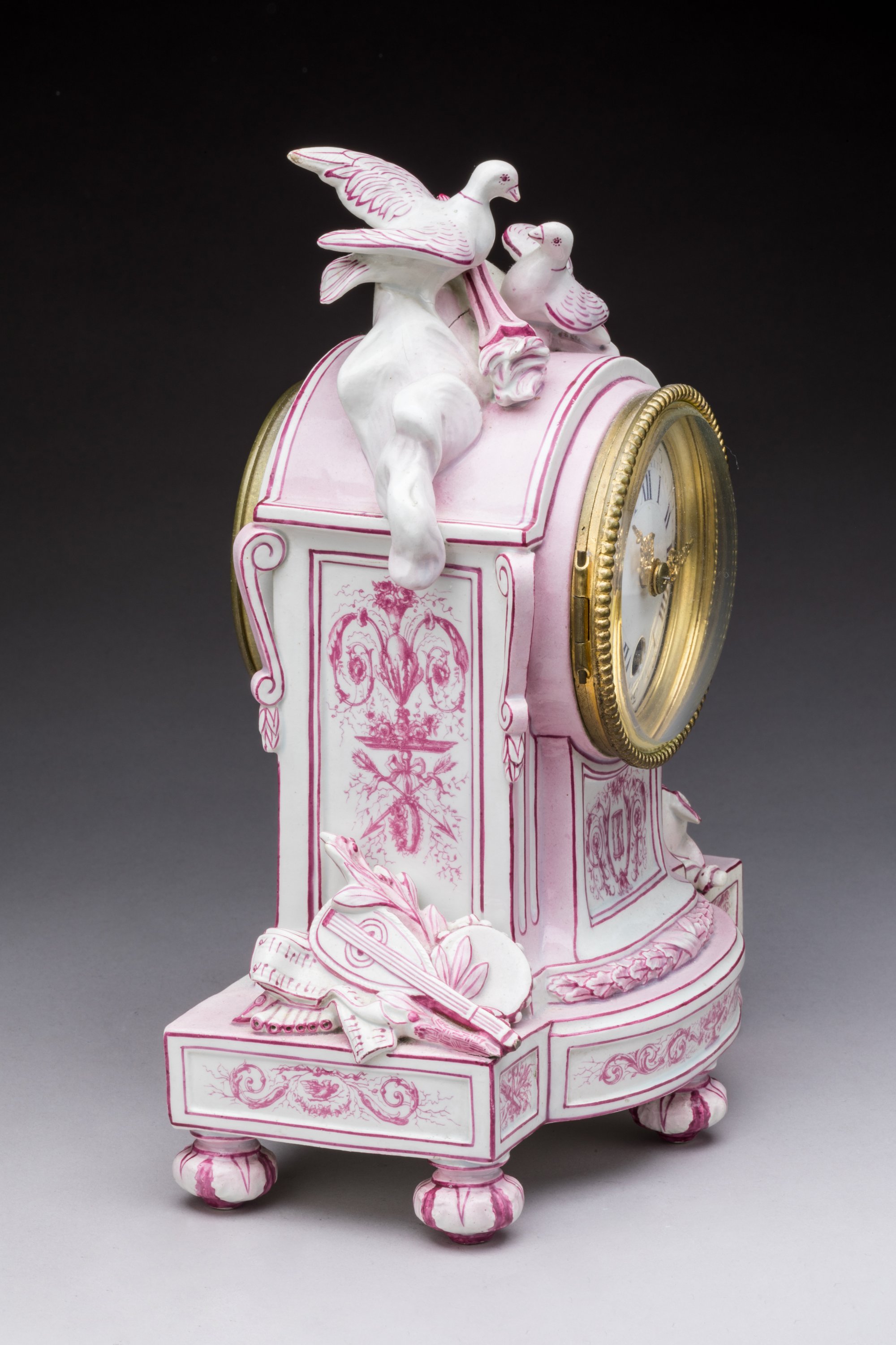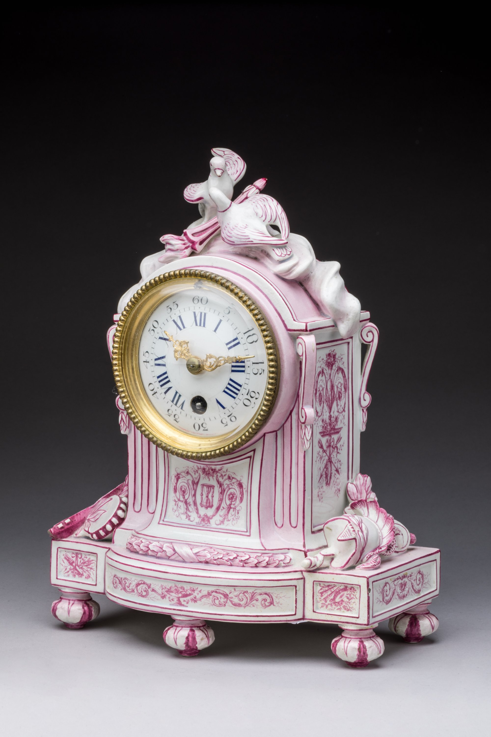 en céramique émaillée de camaïeu rose à la façon de Saxe avec les attributs de la musique et attributs guerriers.