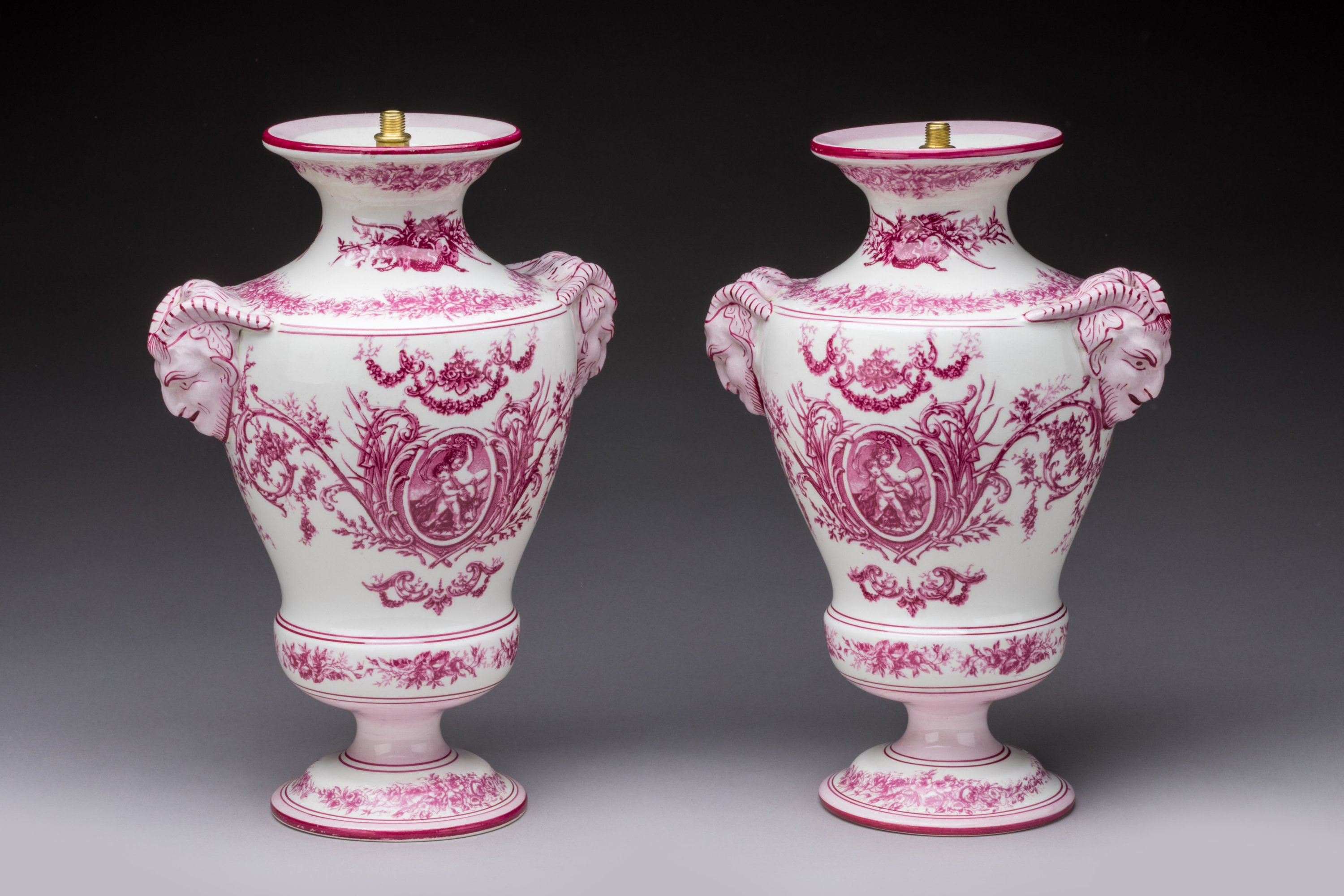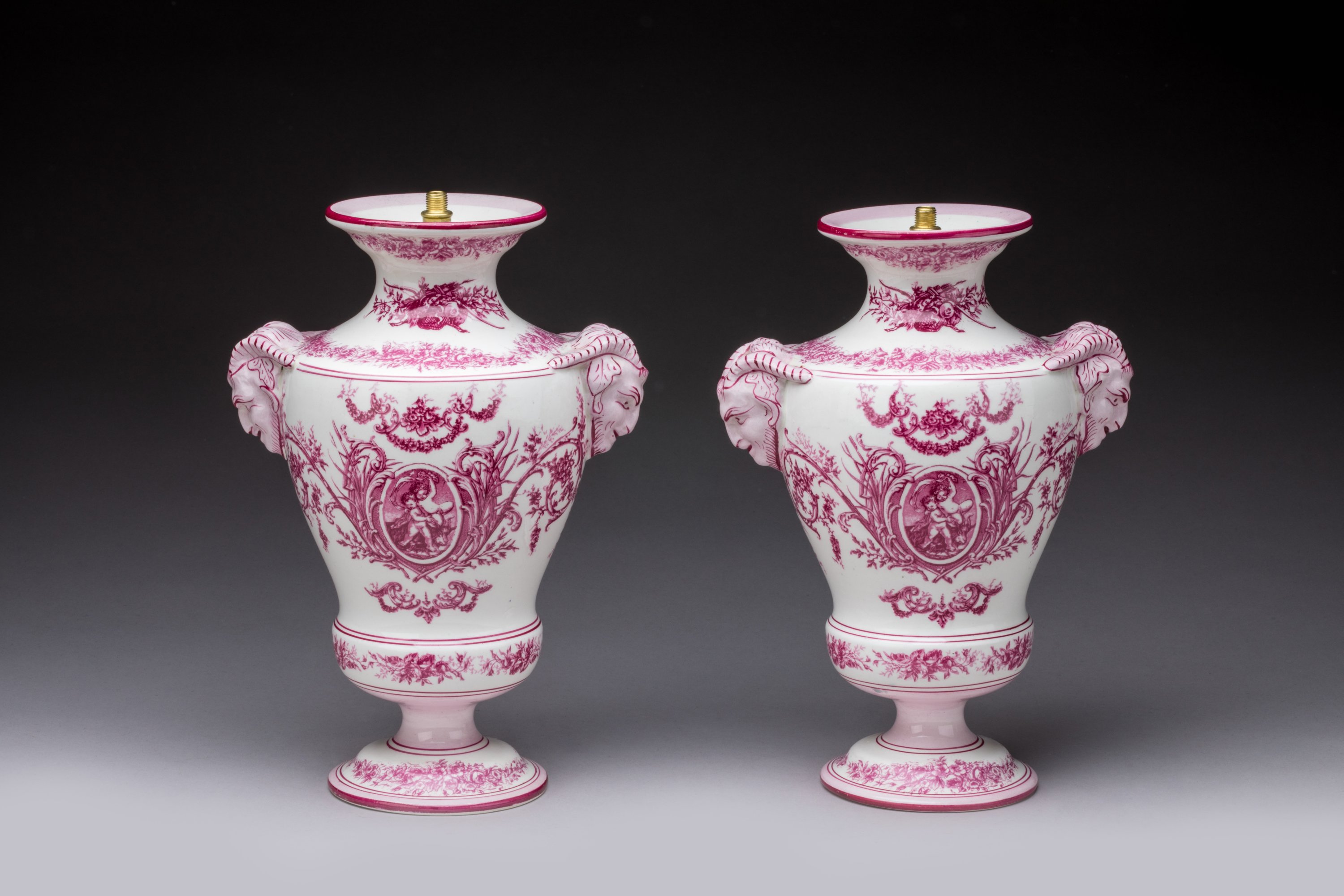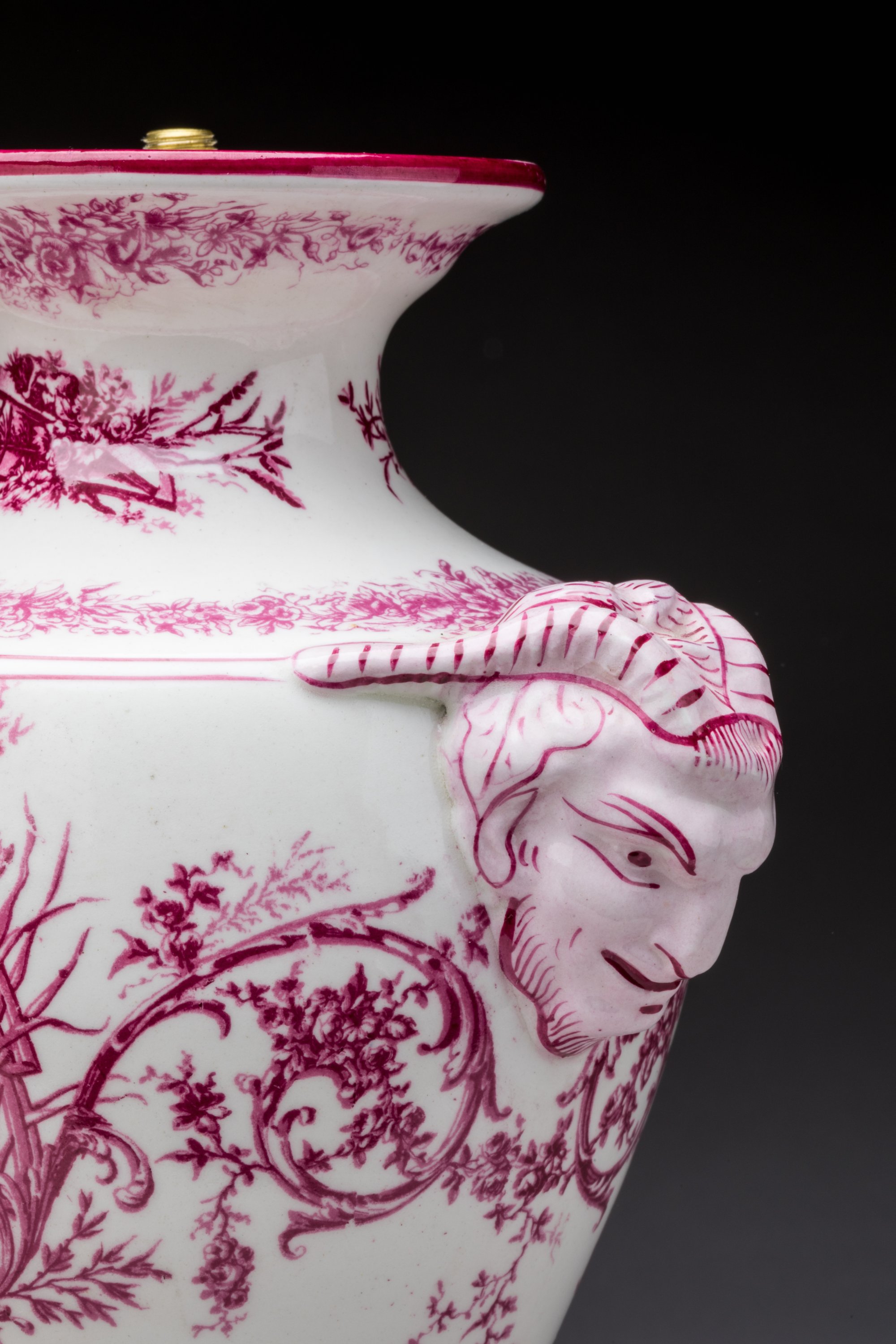 en céramique émaillée à camaïeu de rose, anses à têtes de satyre, avec des putti joueurs dans le goût de Duquesnoy.