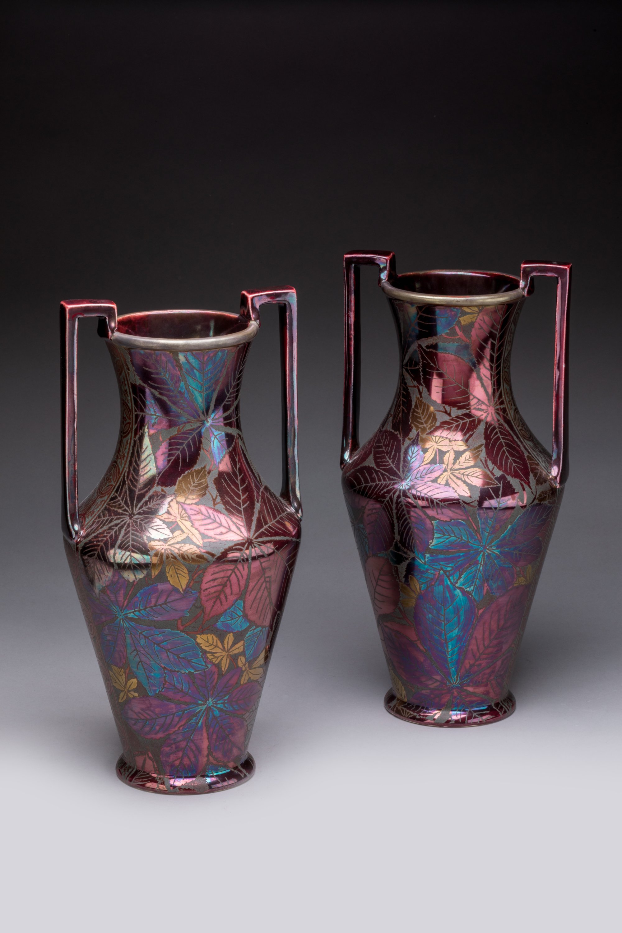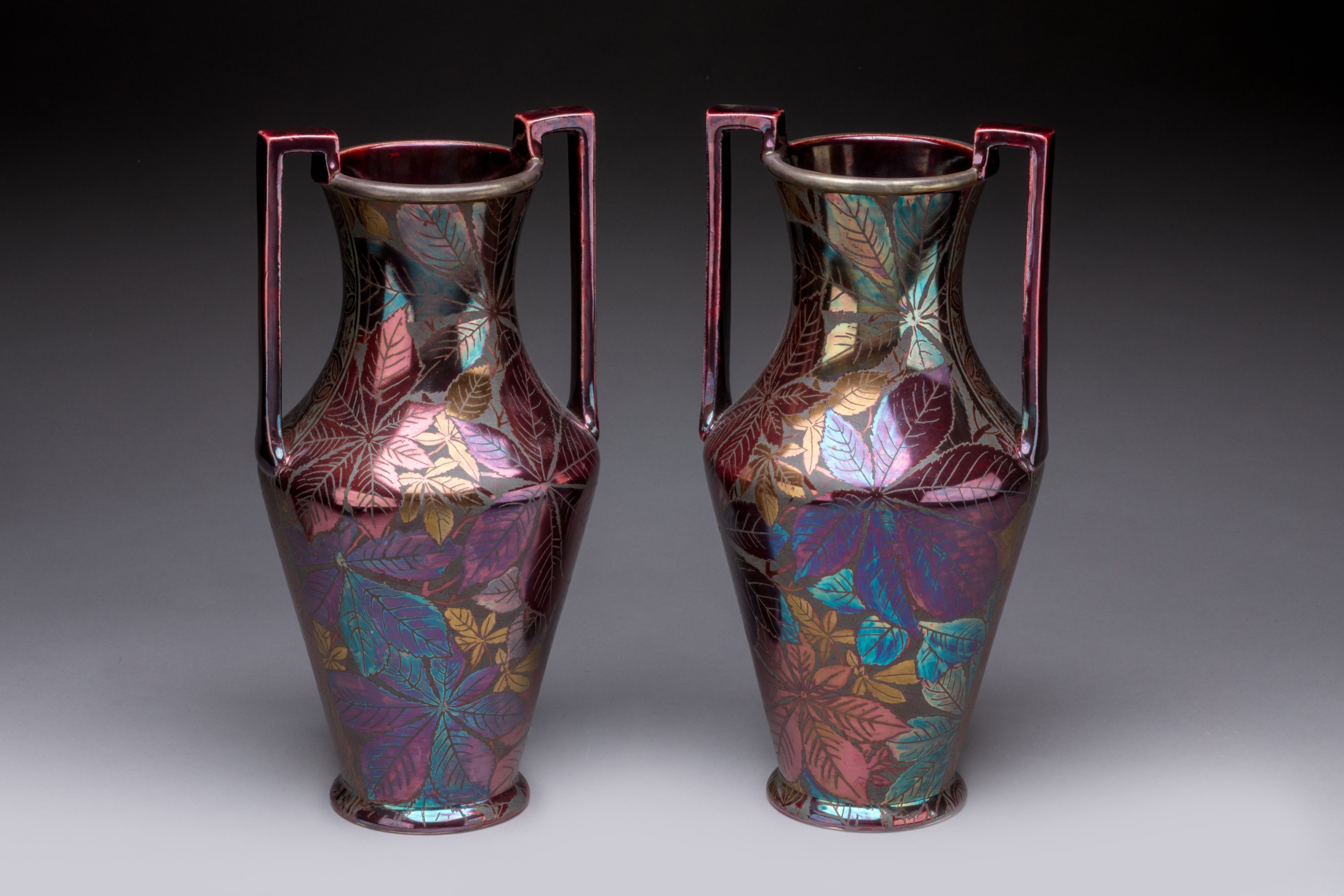 en céramique à lustre métallique à décor de feuilles de marronnier.
