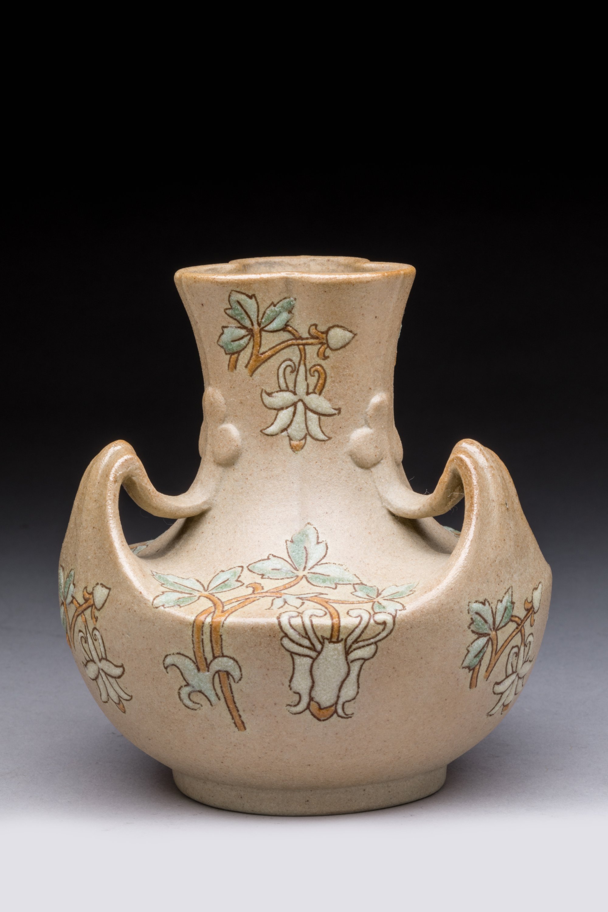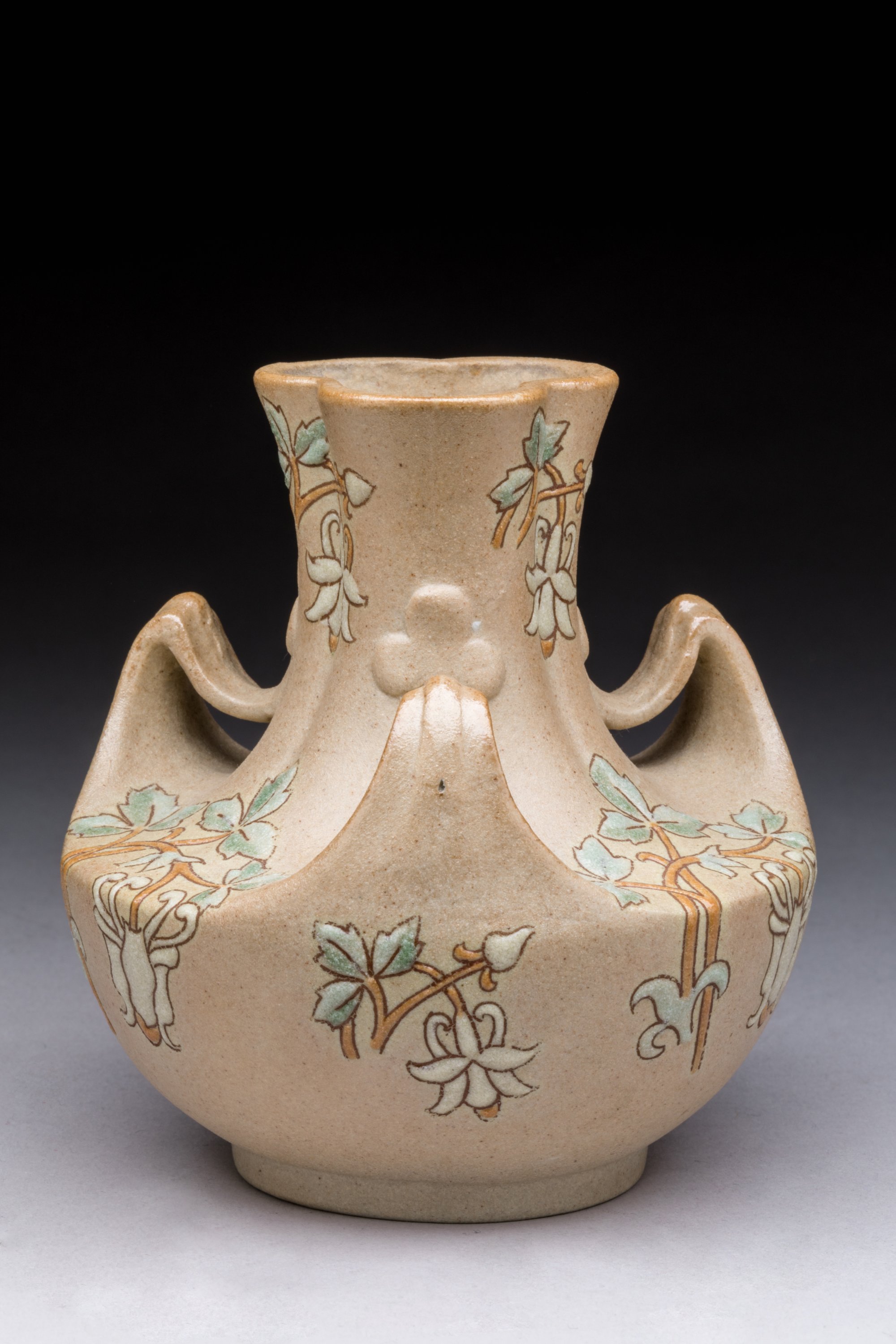en grès à fond beige et décor de petites fleurs, le col en forme de trèfle.