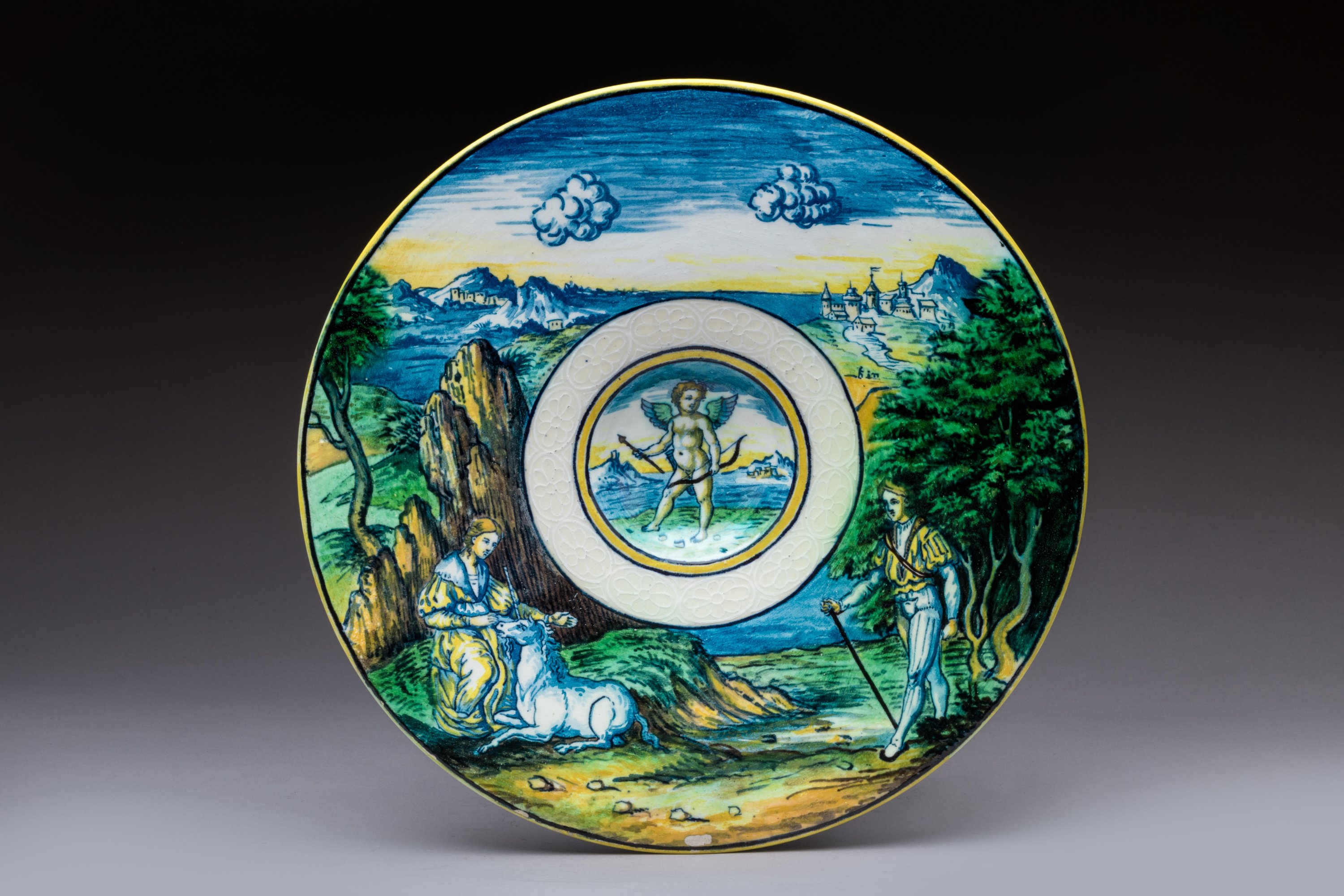 Très rare assiette en céramique émaillée à décor à historieto dans le goût de la Renaissance.