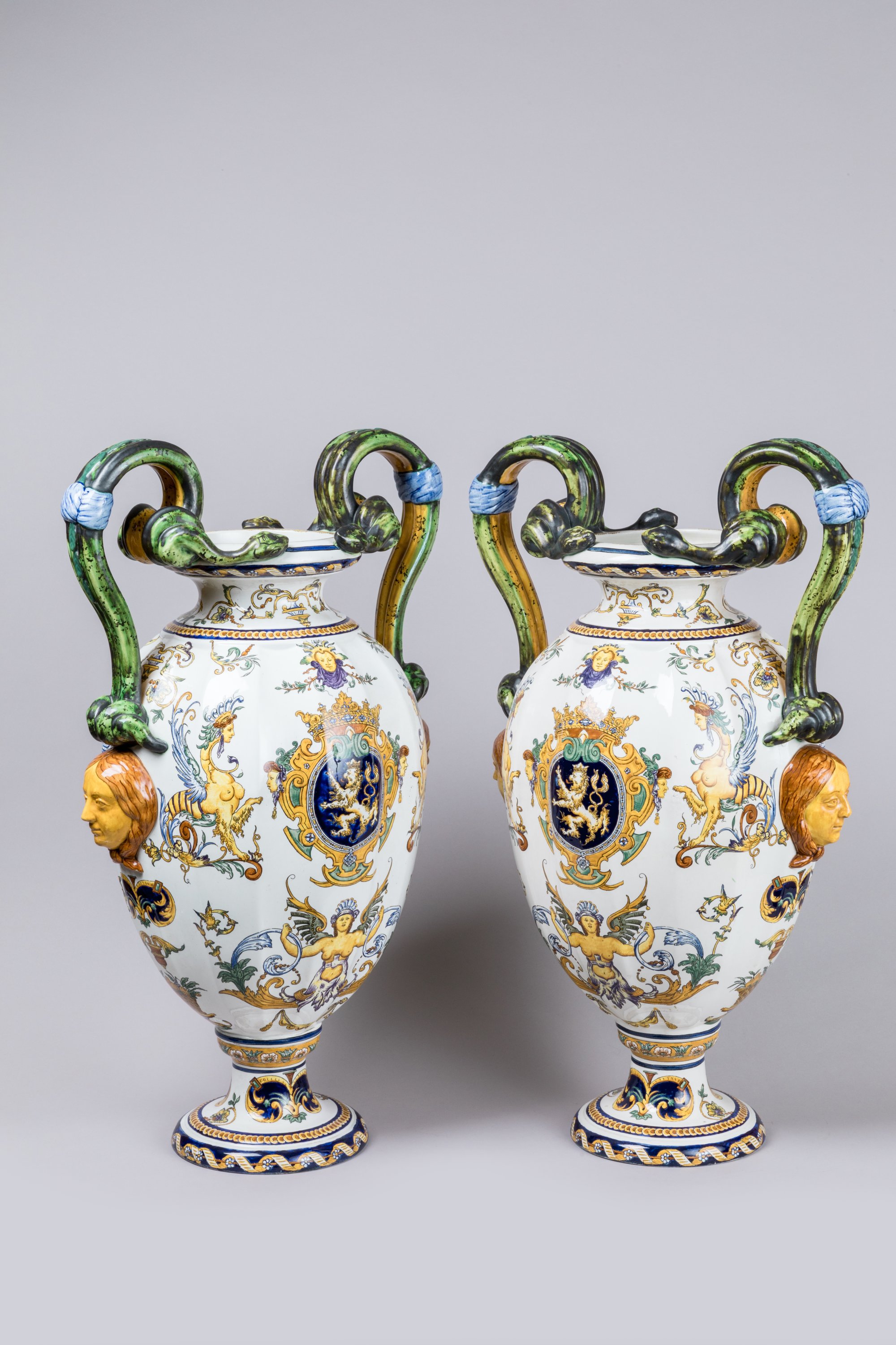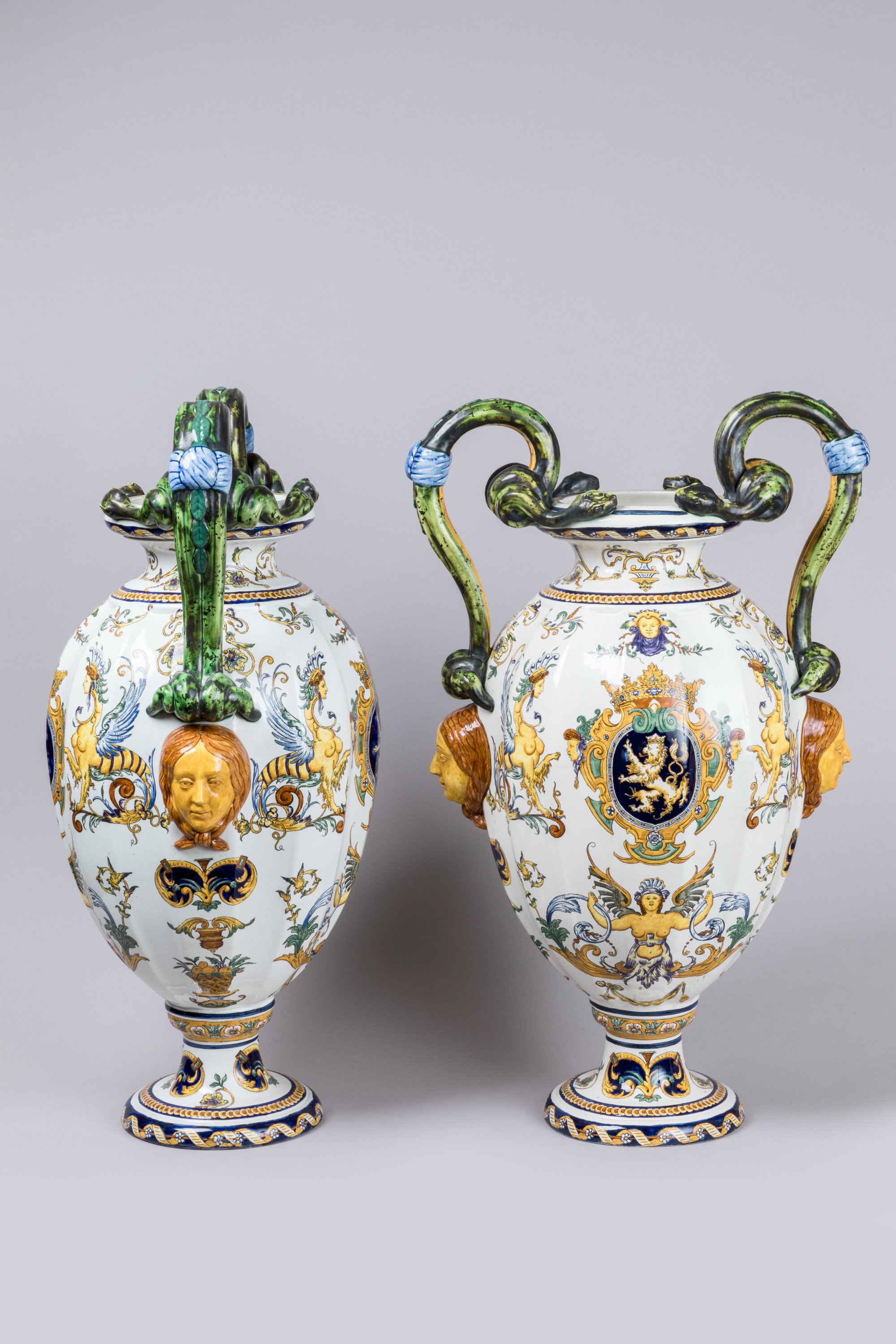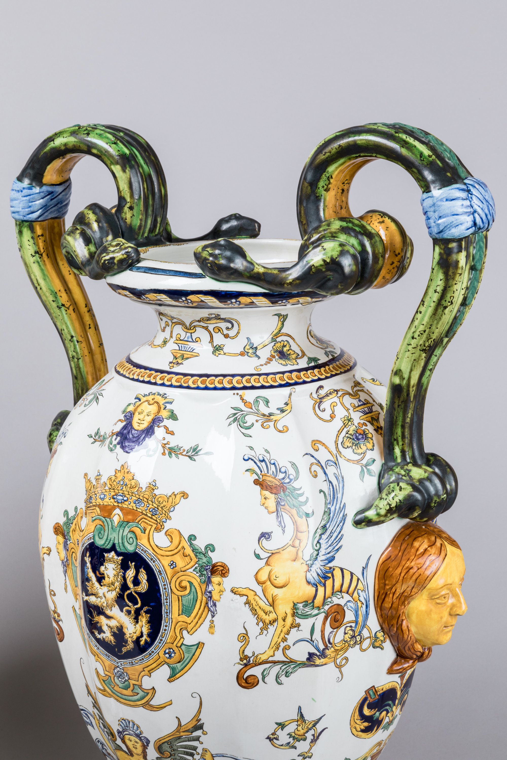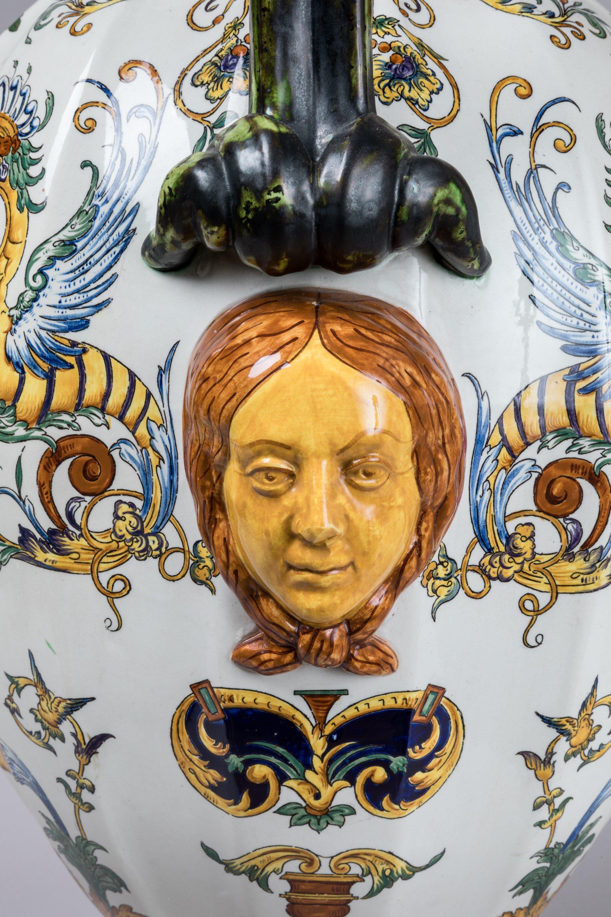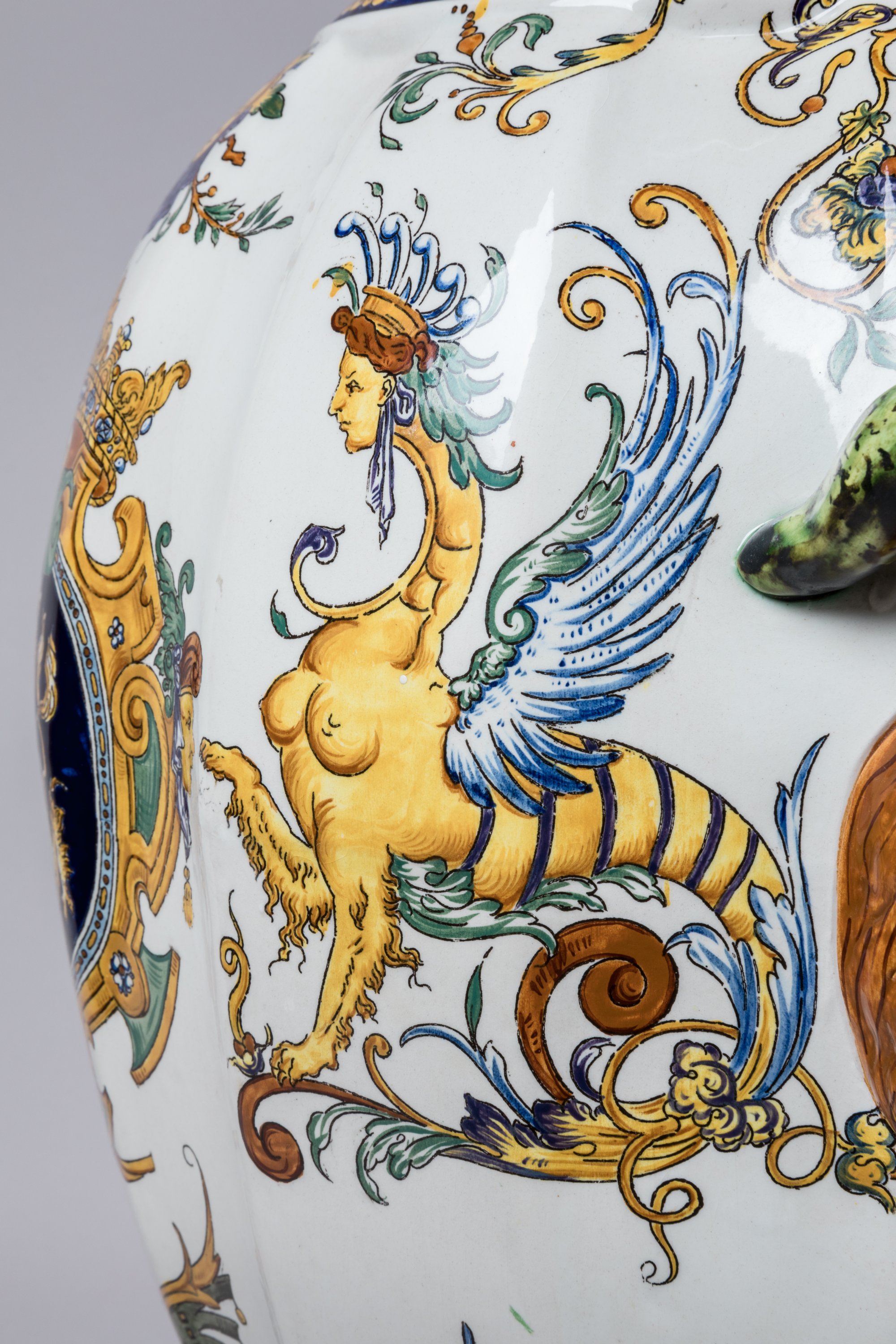 en céramique émaillée à décor de la Renaissance italienne sur fond blanc à décor de chimères. Les anses à motifs de serpent enroulé prenant appui sur des mascarons de femmes en relief. Cartouche orné d'un lion héraldique sous une couronne de marquis.