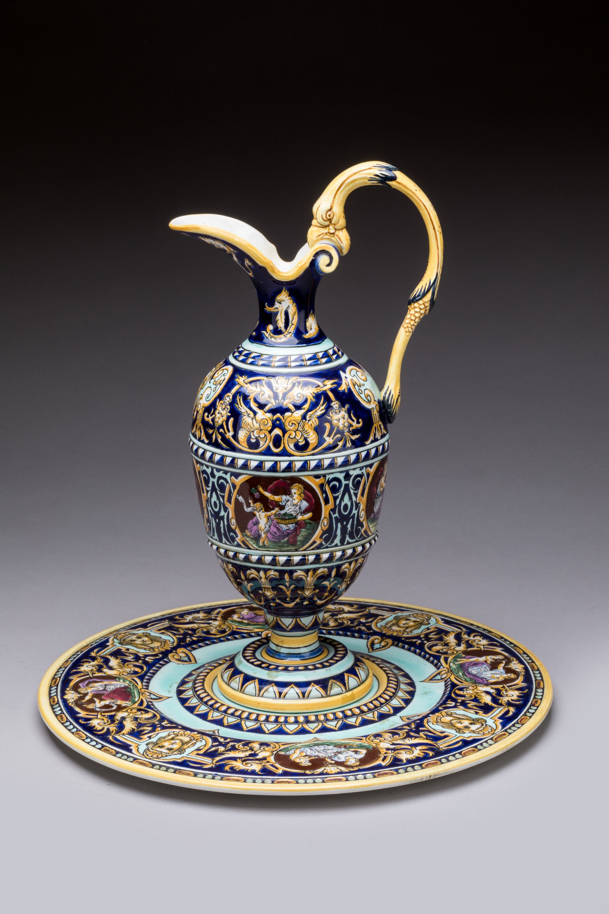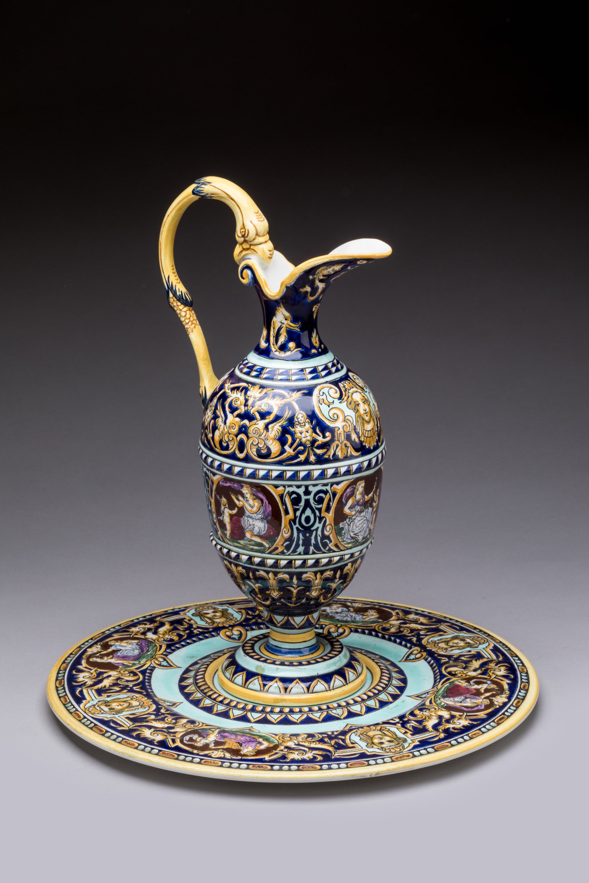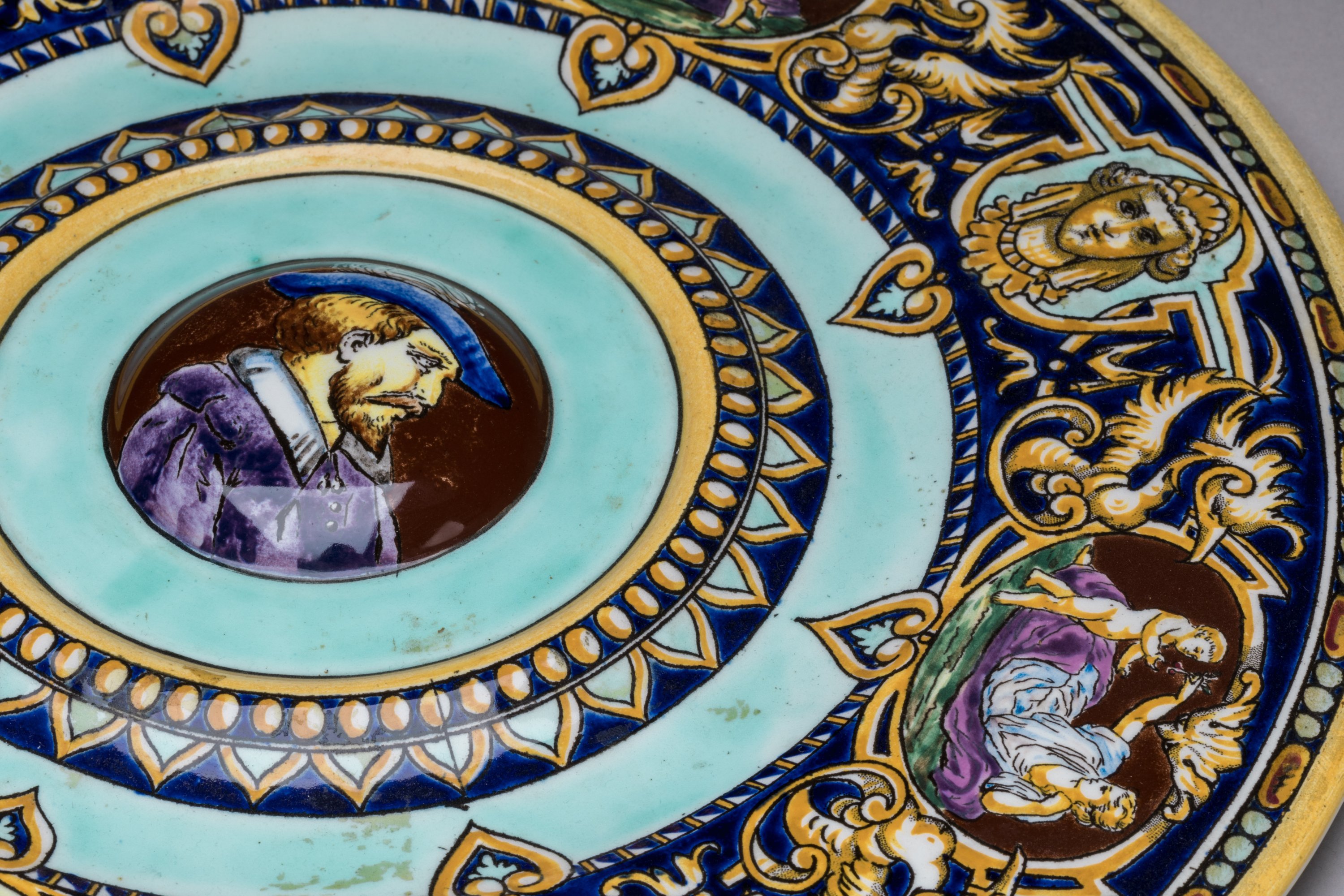 en céramique émaillée sur fond bleu à décor de la Renaissance.