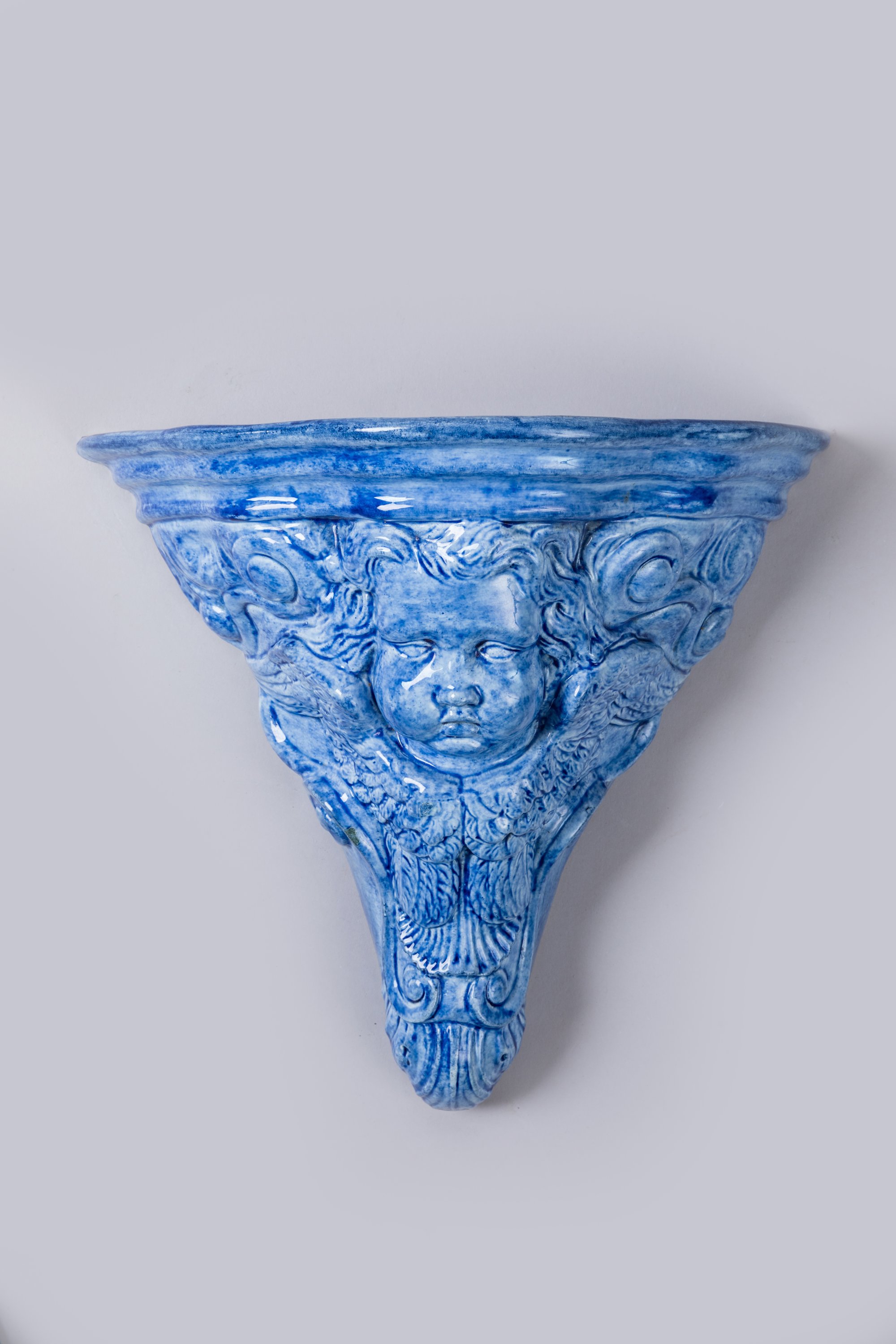 CONSOLE d'APPLIQUE  au PUTTOen céramique à fond bleu.Haut. 26,5...