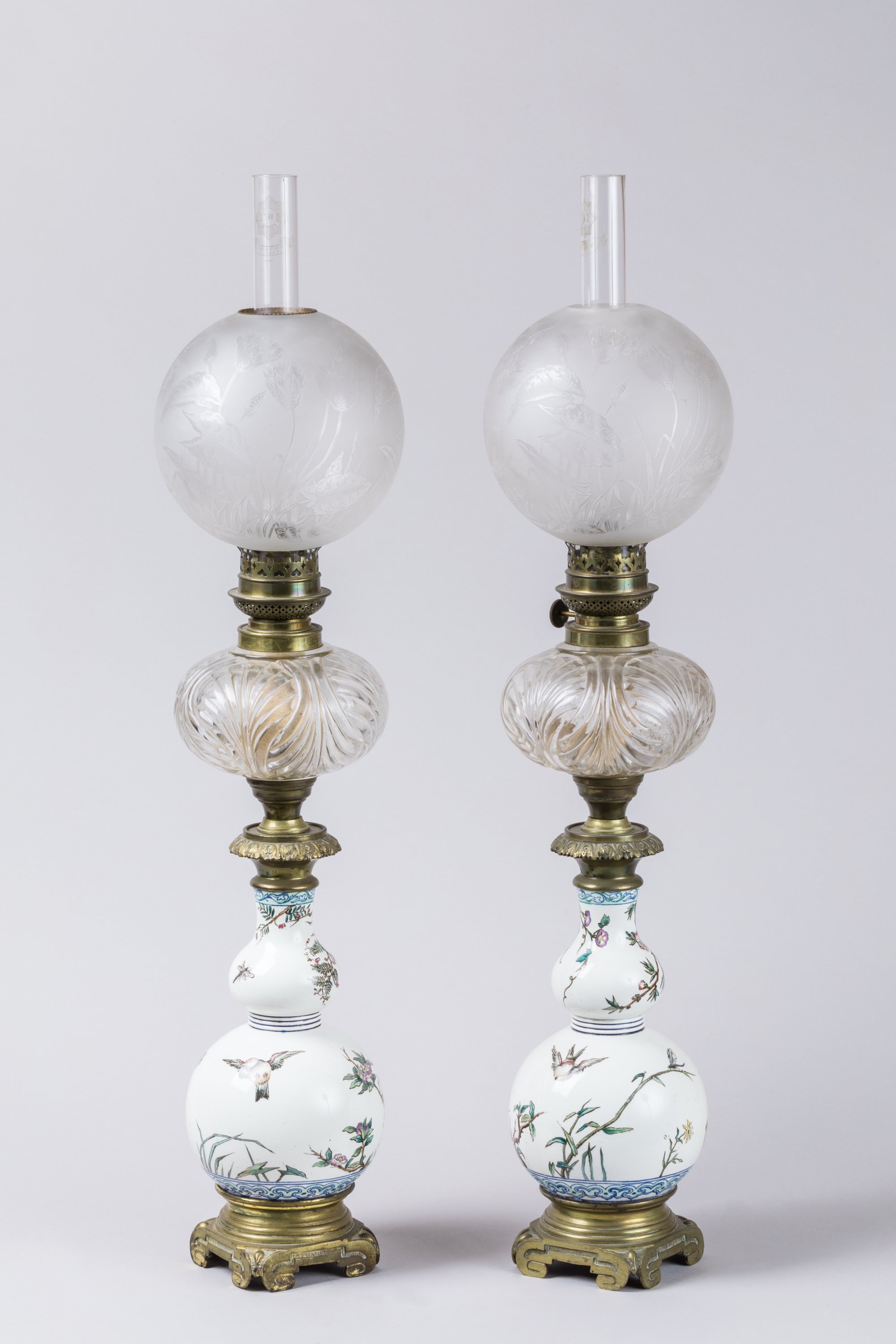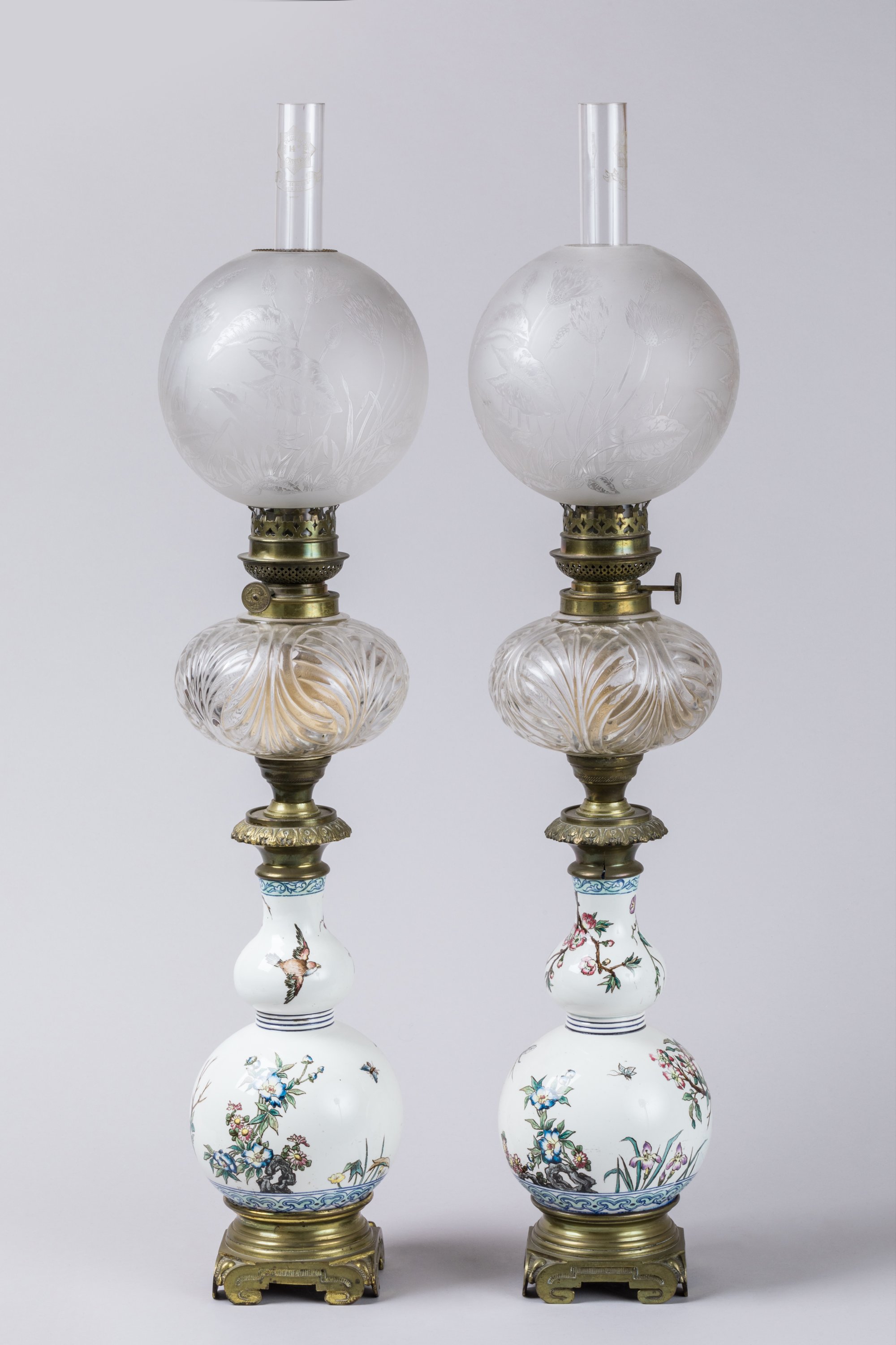 en céramique émaillée sur fond blanc, montée en laiton, les globes en cristal gravés de bouquets fleuris.
