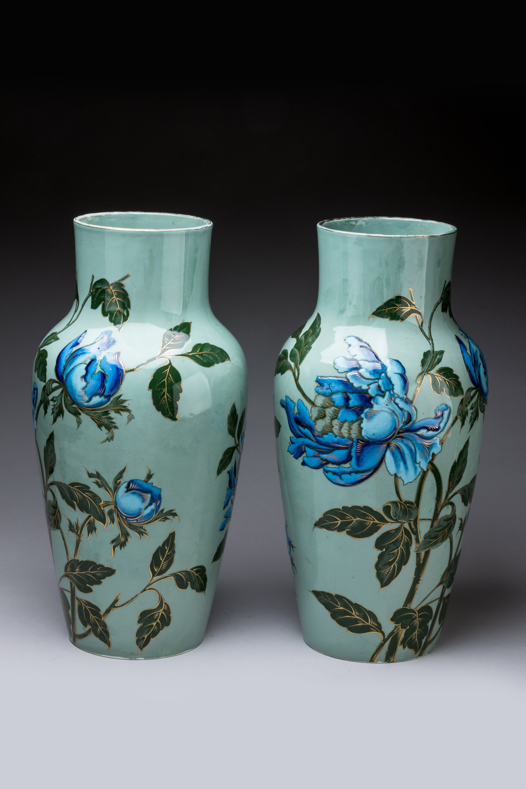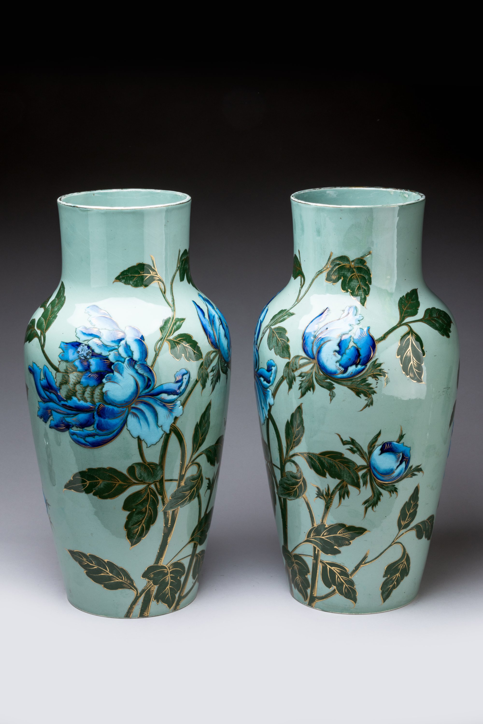 en céramique émaillée, ornés de pivoines polychromes avec rehauts d'or sur fond vert céladon.