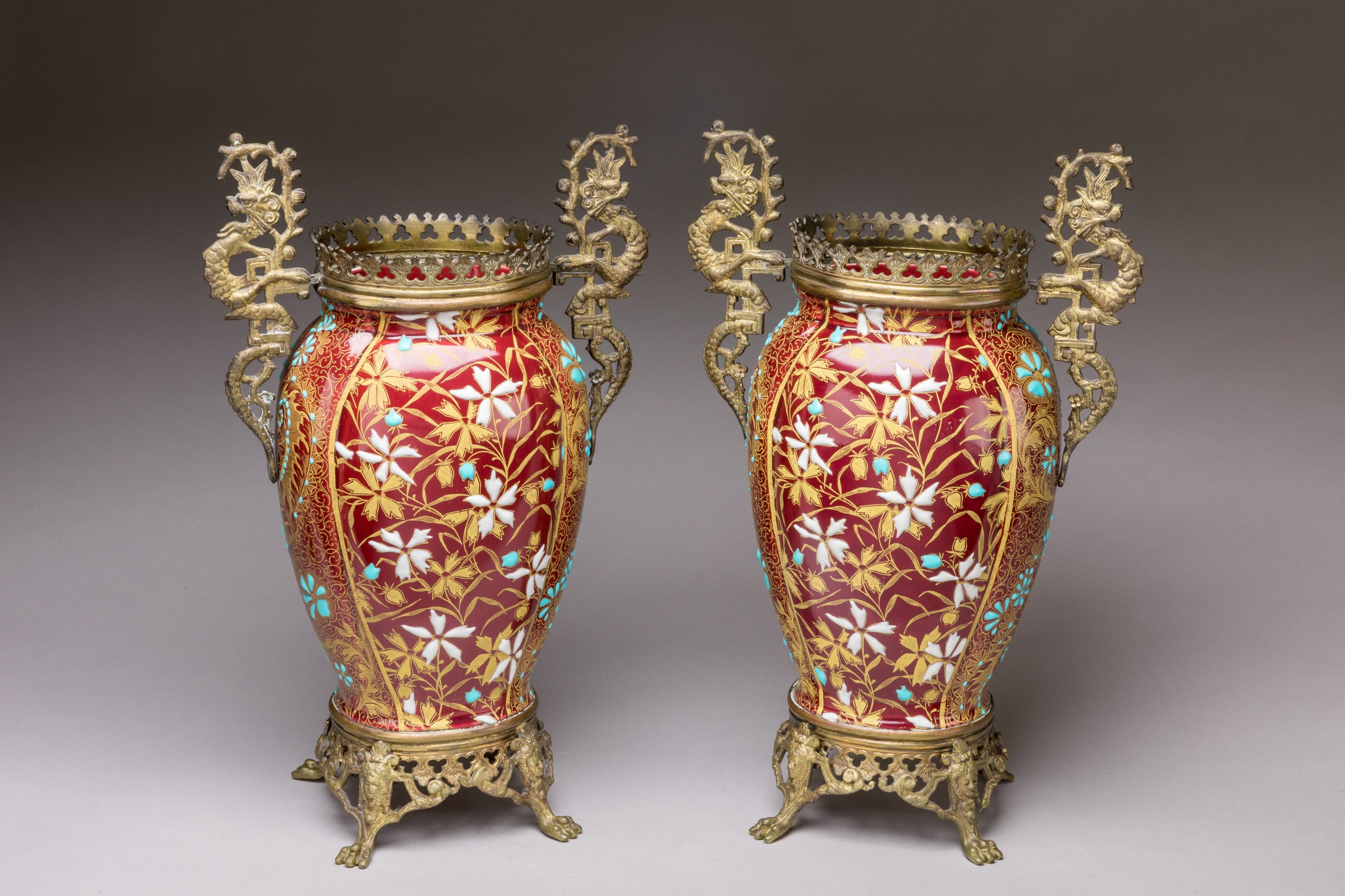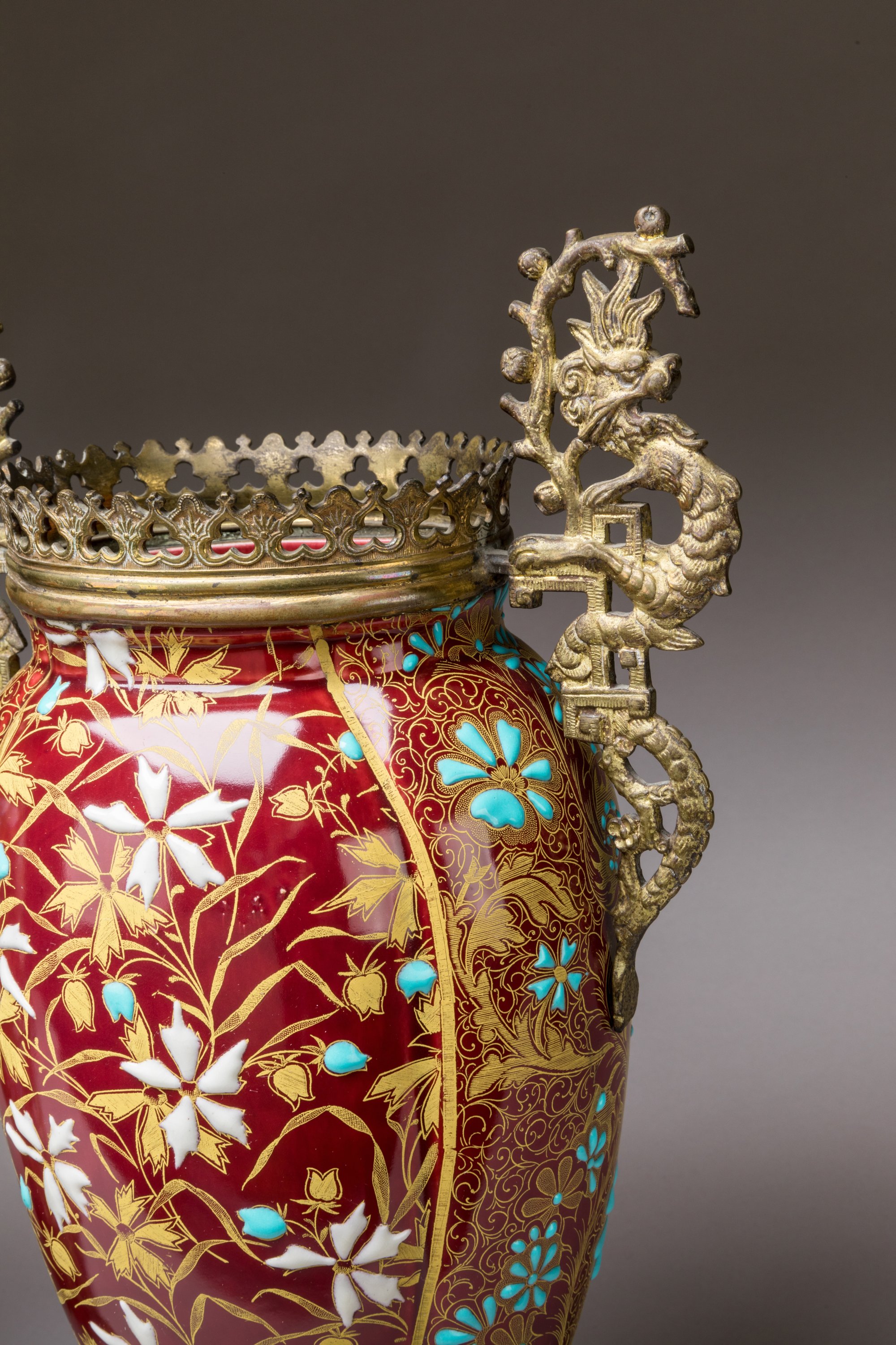 en céramique émaillée à fond "sang de buf" rehaussés d'émaux en relief de fleurs et rehauts d'or. Monture à décor de dragons.
