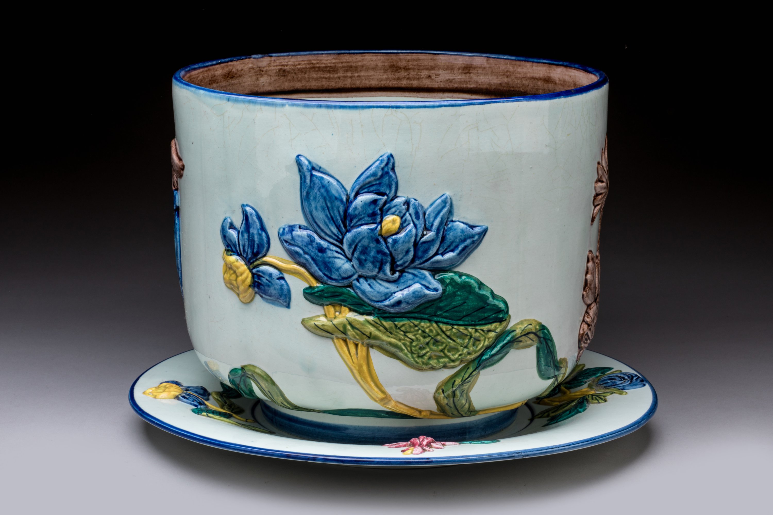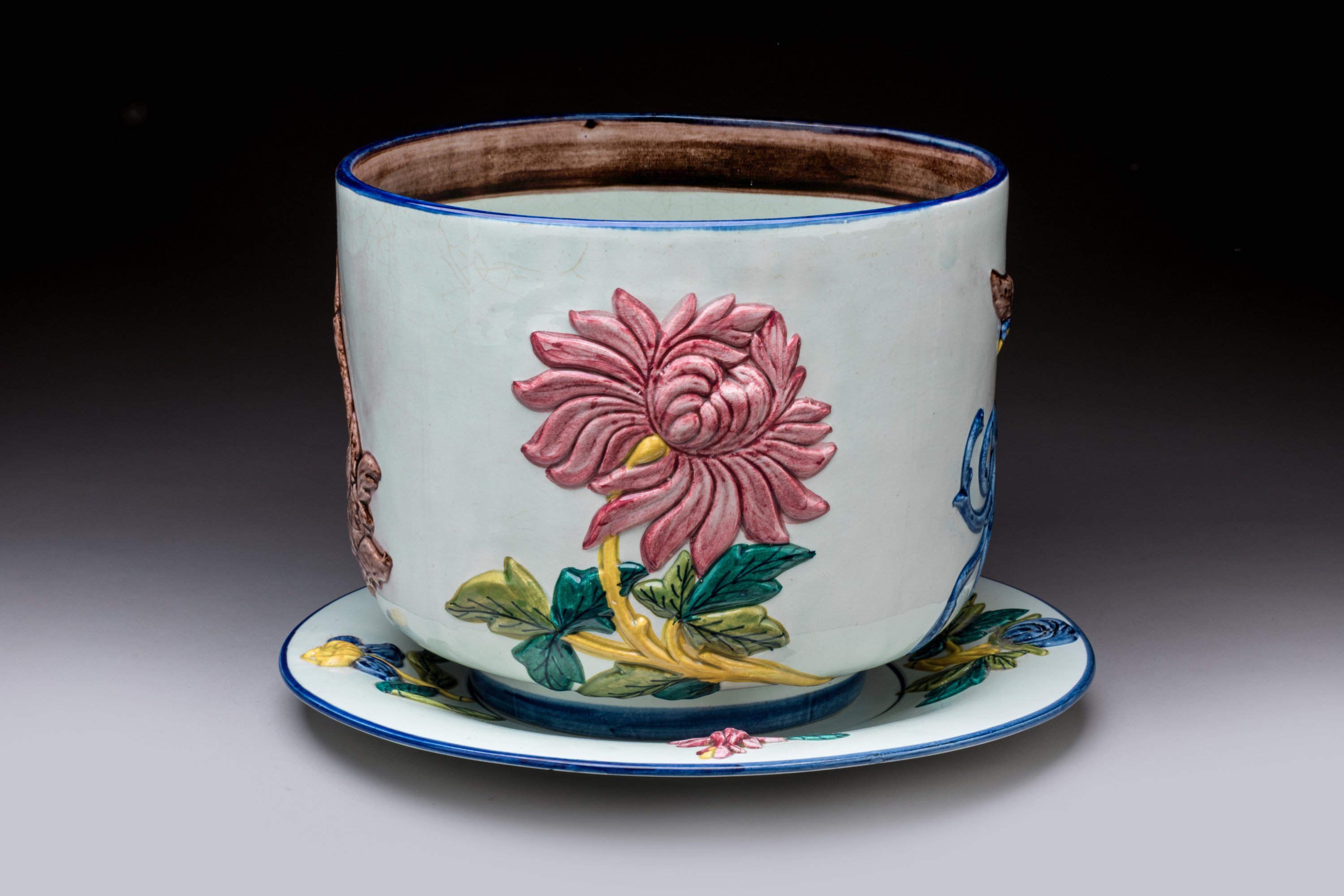en céramique émaillée à décor de fleurs et d'animaux stylisés en émaux polychromes.
