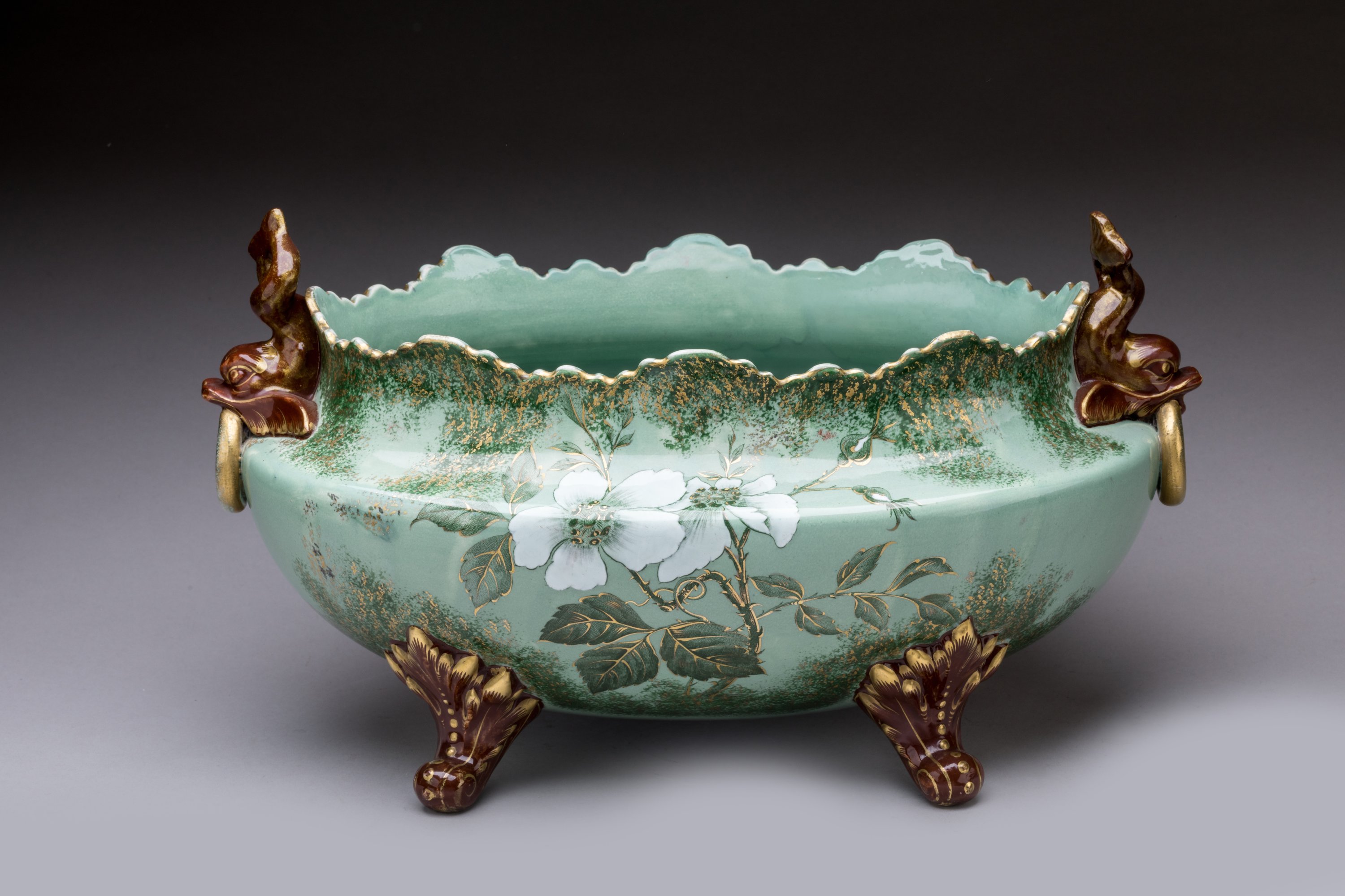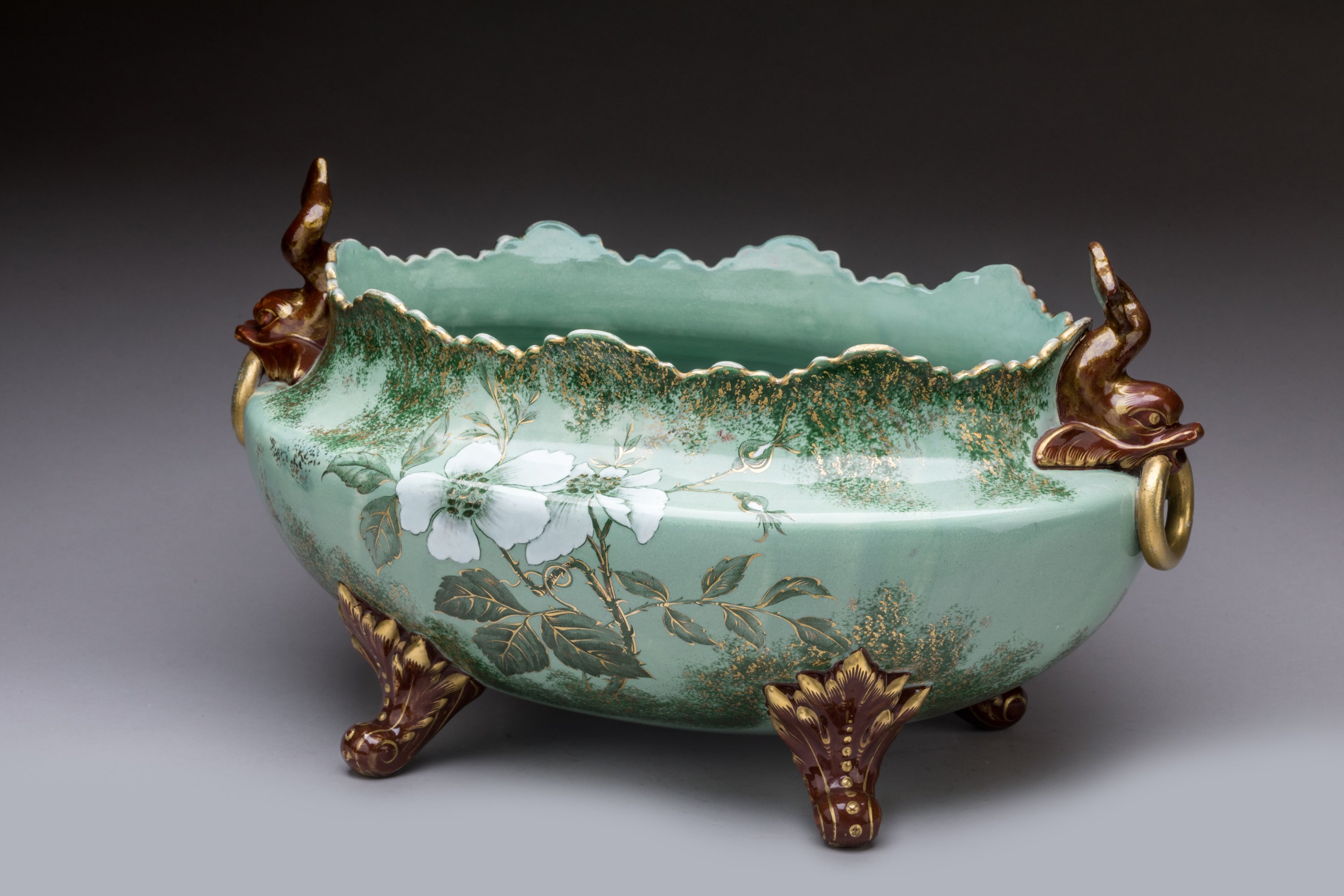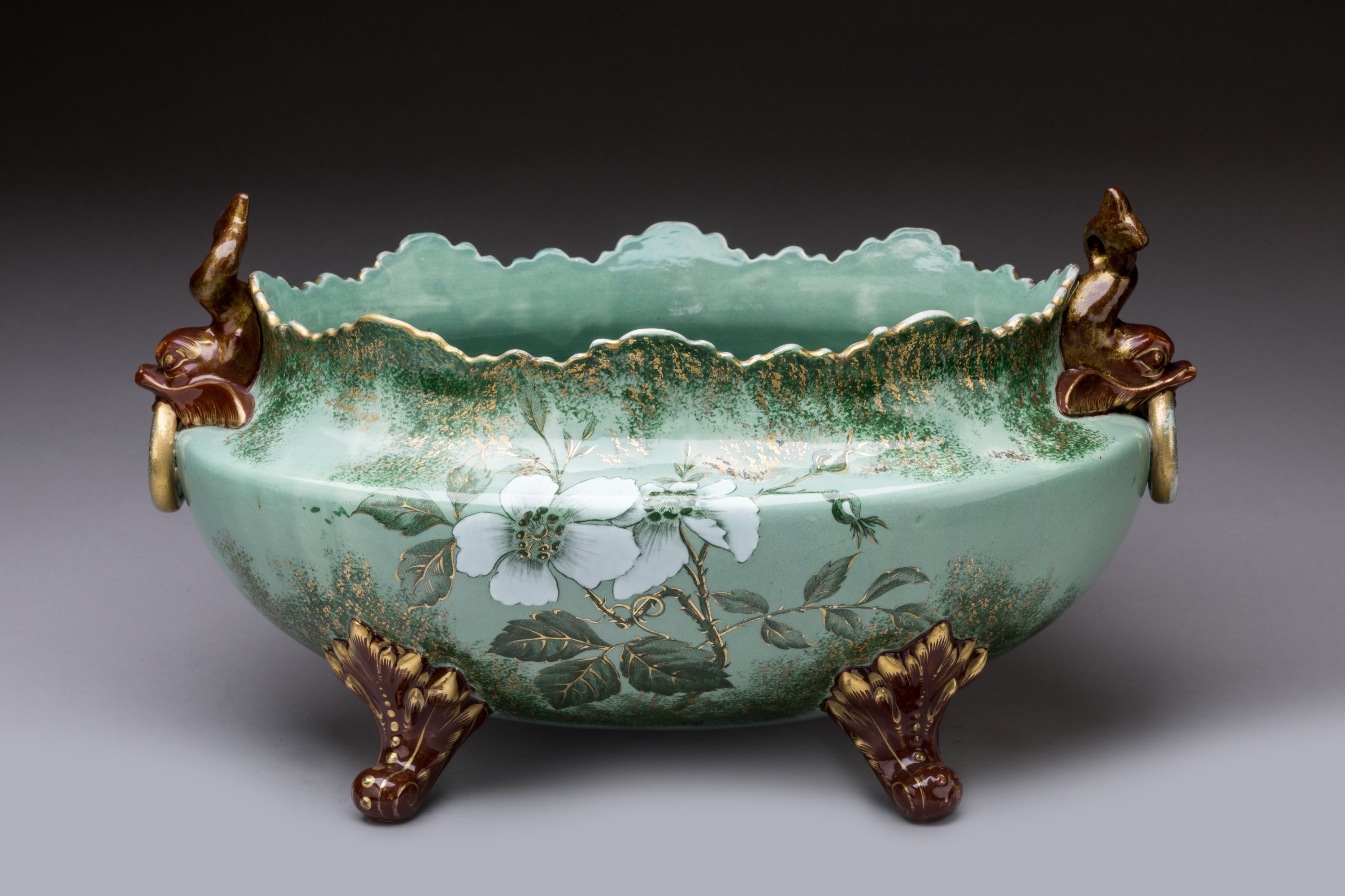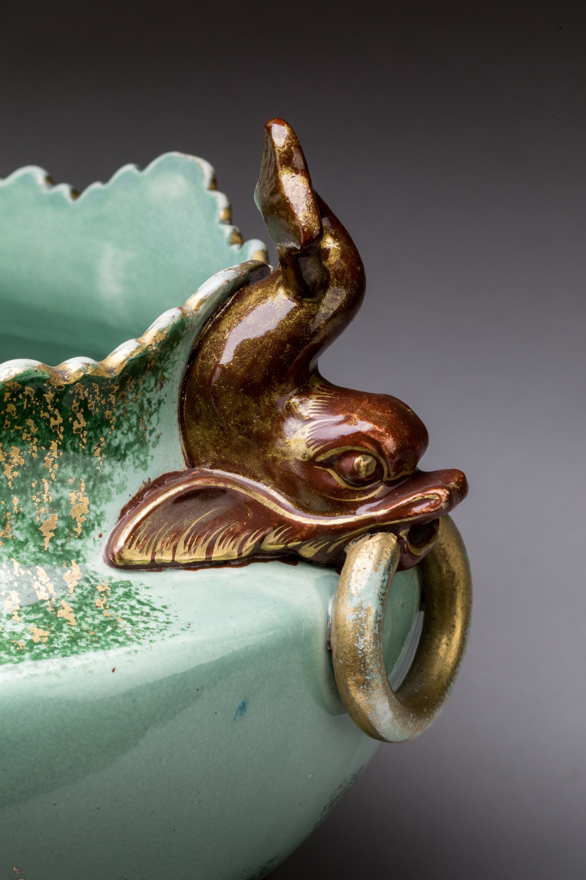 en céramique émaillée dite de Limoges sur fond céladon et rehauts d'or. Prises de dauphins.