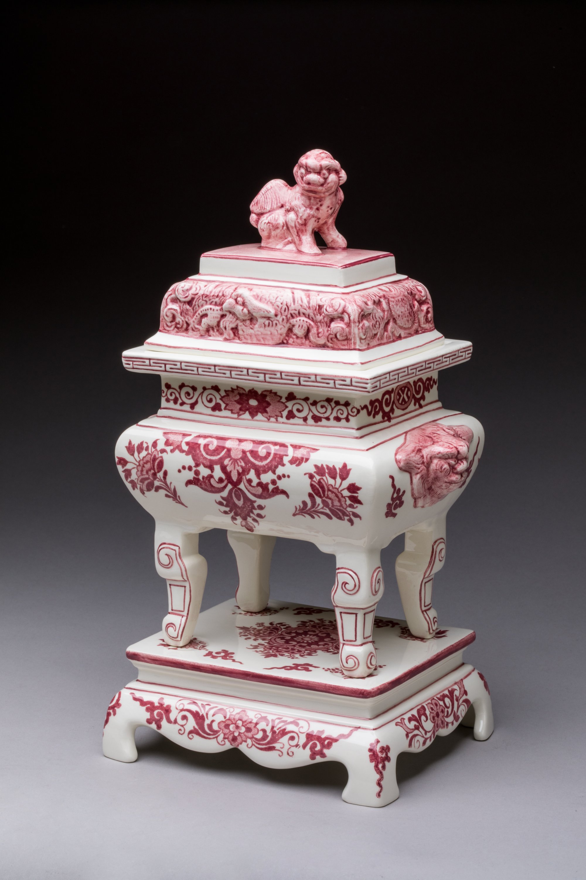 en céramique émaillée, l'un au décor bleu et blanc à la Bérain, l'autre pourpre de Cassius de Sèvres.