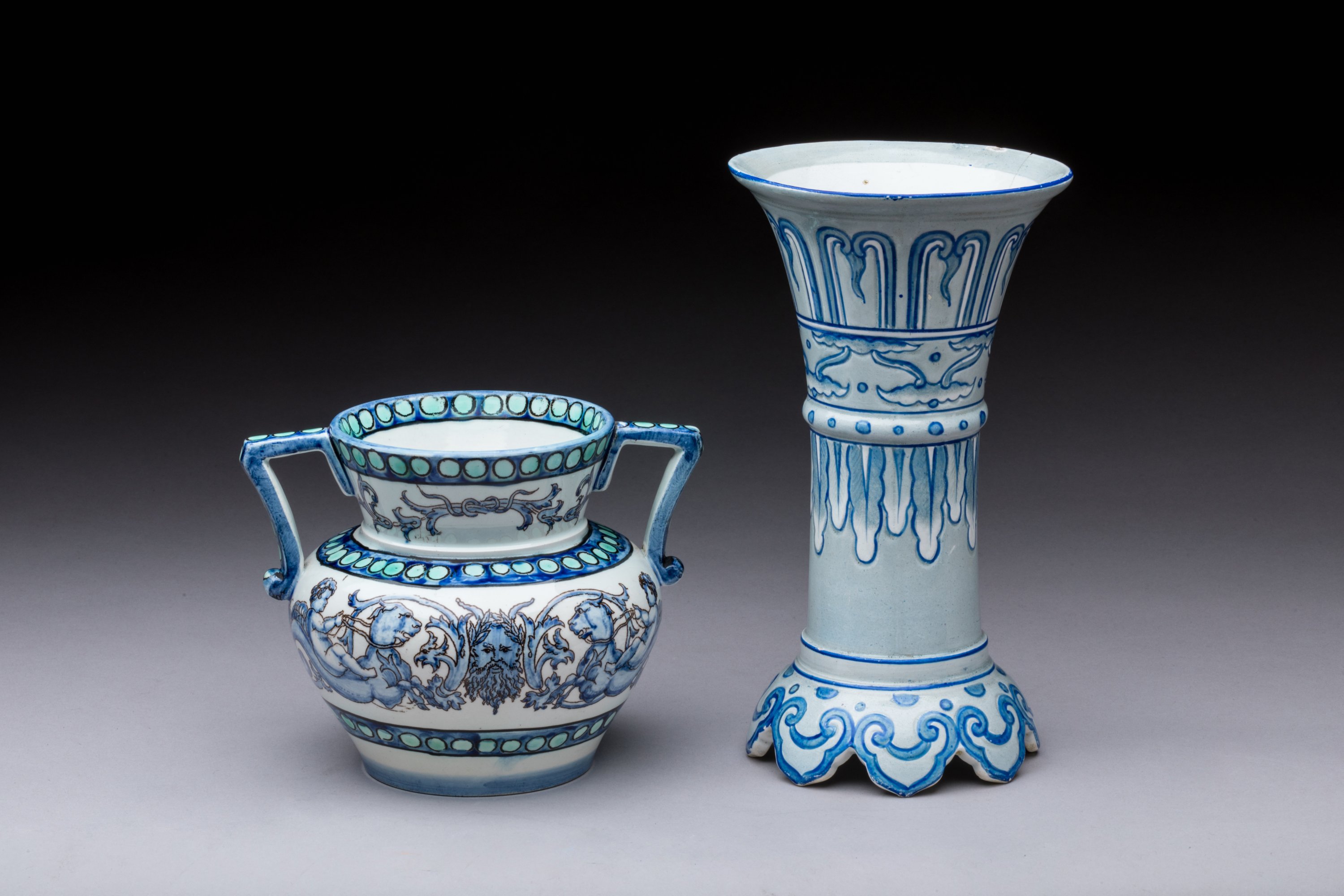 en céramique émaillée à décor en camaïeu de bleu, d'arcatures et frises géométriques et de scènes aquatiques.