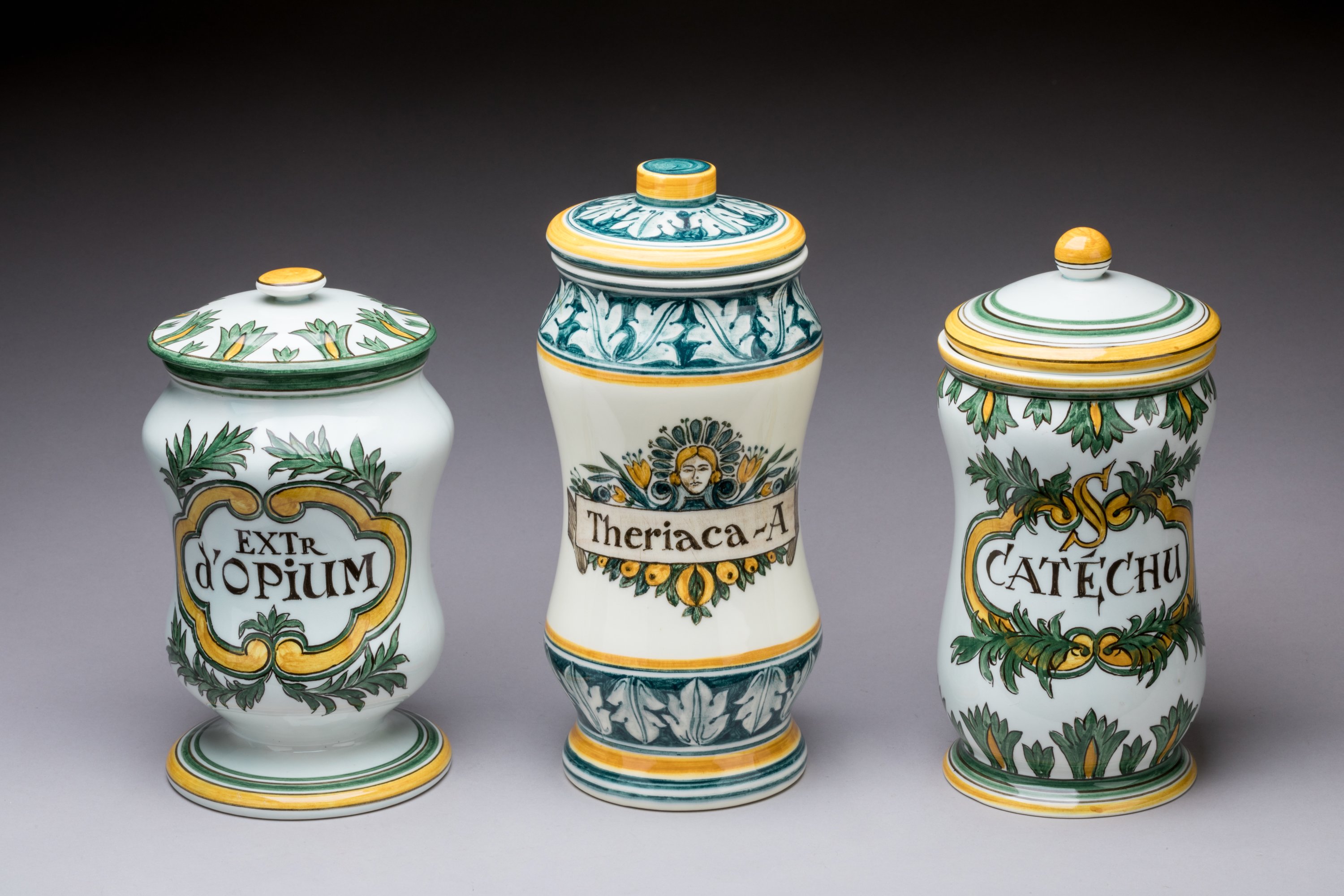 en céramique émaillée, marqués: "Extr d'opium, Catéchu et Theriaca-A".