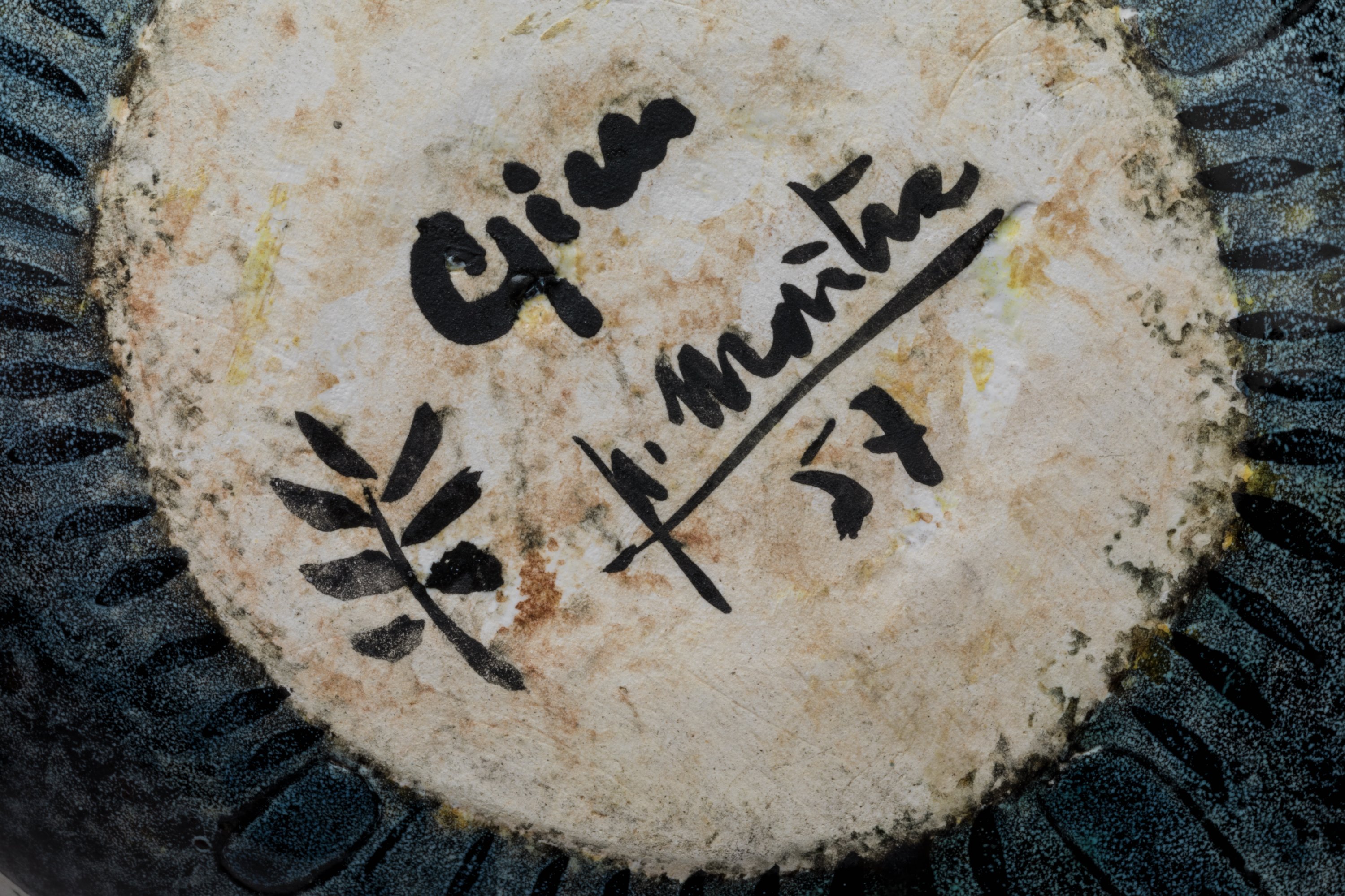 en céramique émaillée peinte à décor d'un paysage, d'attributs marin et d'une végétation stylisée. Signés.