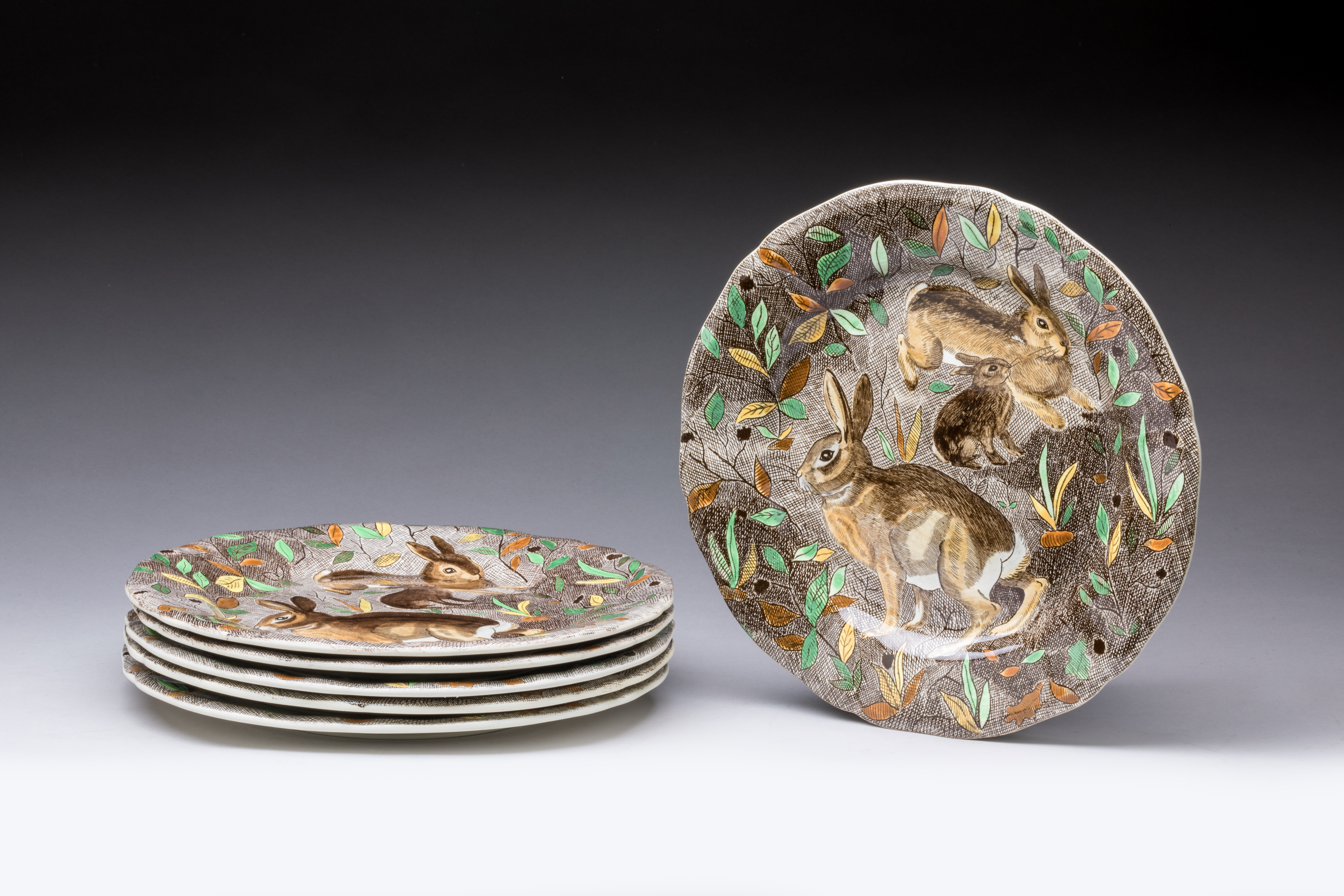 - Quarante-deux assiettes plates dont: huit canards, cinq bécasses, sept perdrix, dix faisans, six lapins et six lièvres (Diam. 26 cm).