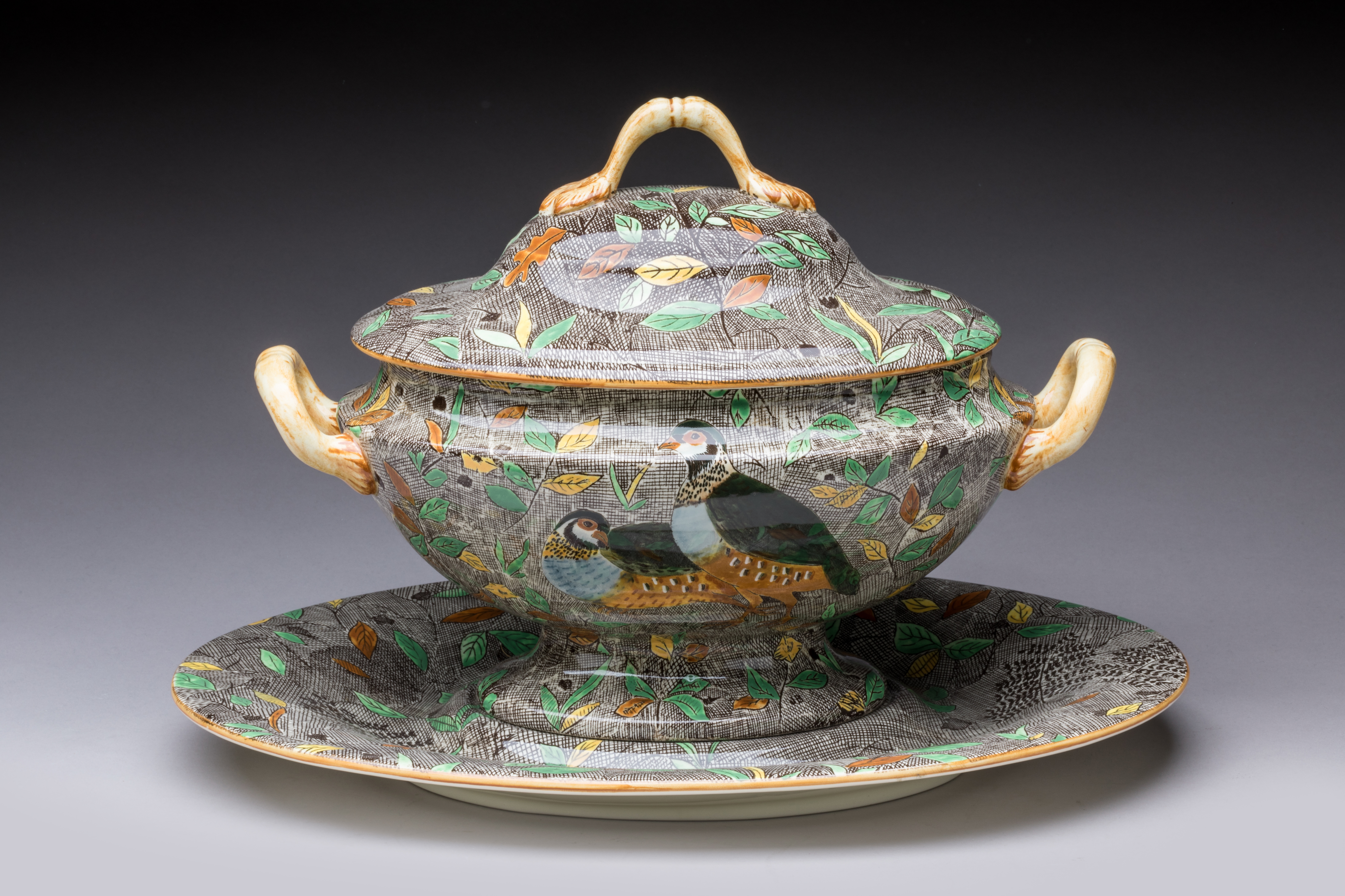 - Soupière et son présentoir aux canards (Haut. totale 24, Larg. 40 cm). Travail moderne.