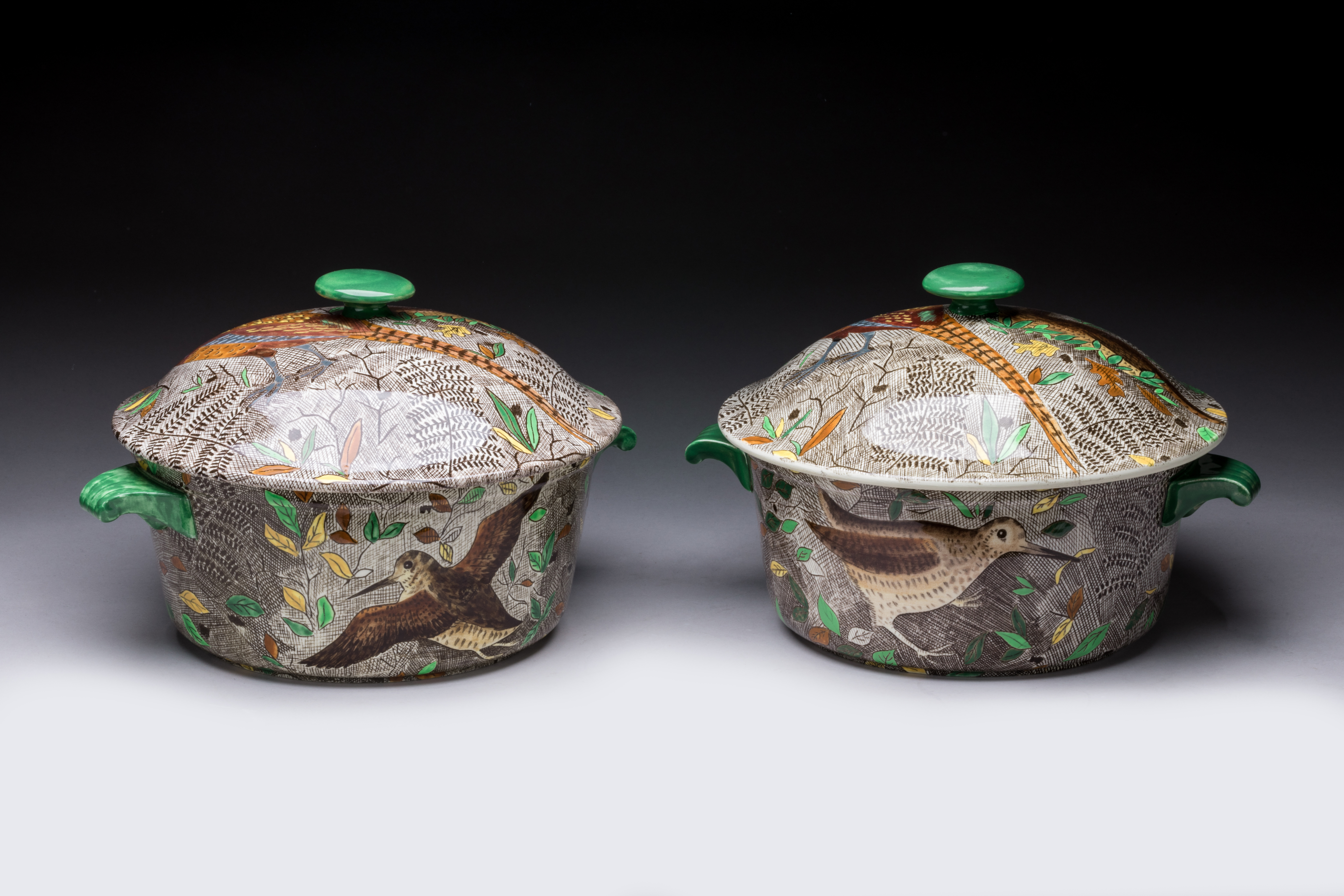 - Quatre terrines couvertes en terre vernissée par A. Jacques pour Gien: deux à hures de sanglier (Long. 44,5 cm), une de lièvre (Long. 27,5 cm) et une de canard (Long. 29,5 cm).