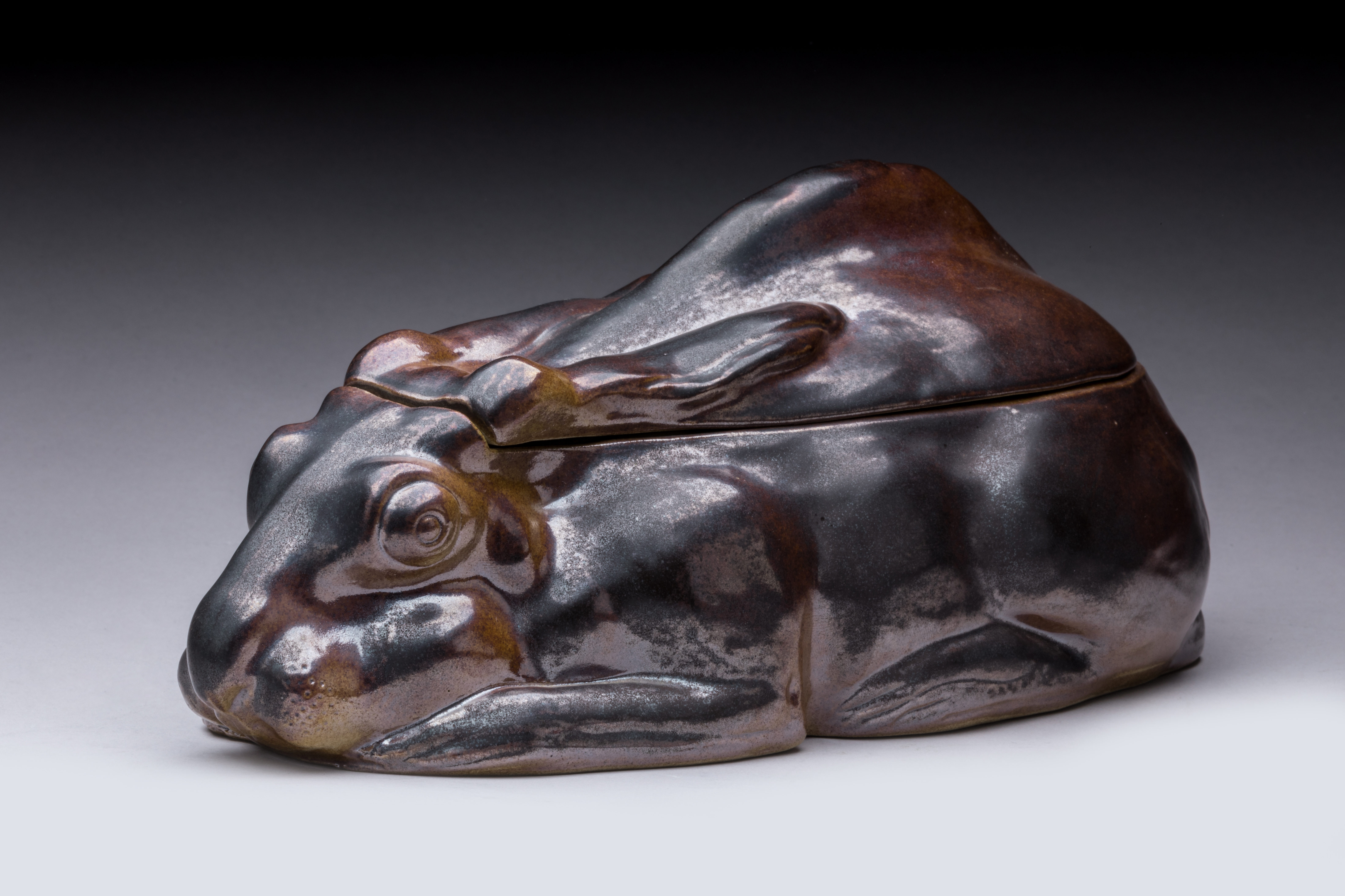 - paire de terrines couvertes au chevreuil en barbotine par Michel Caugant pour une autre manufacture (Long. 25,5 cm).
