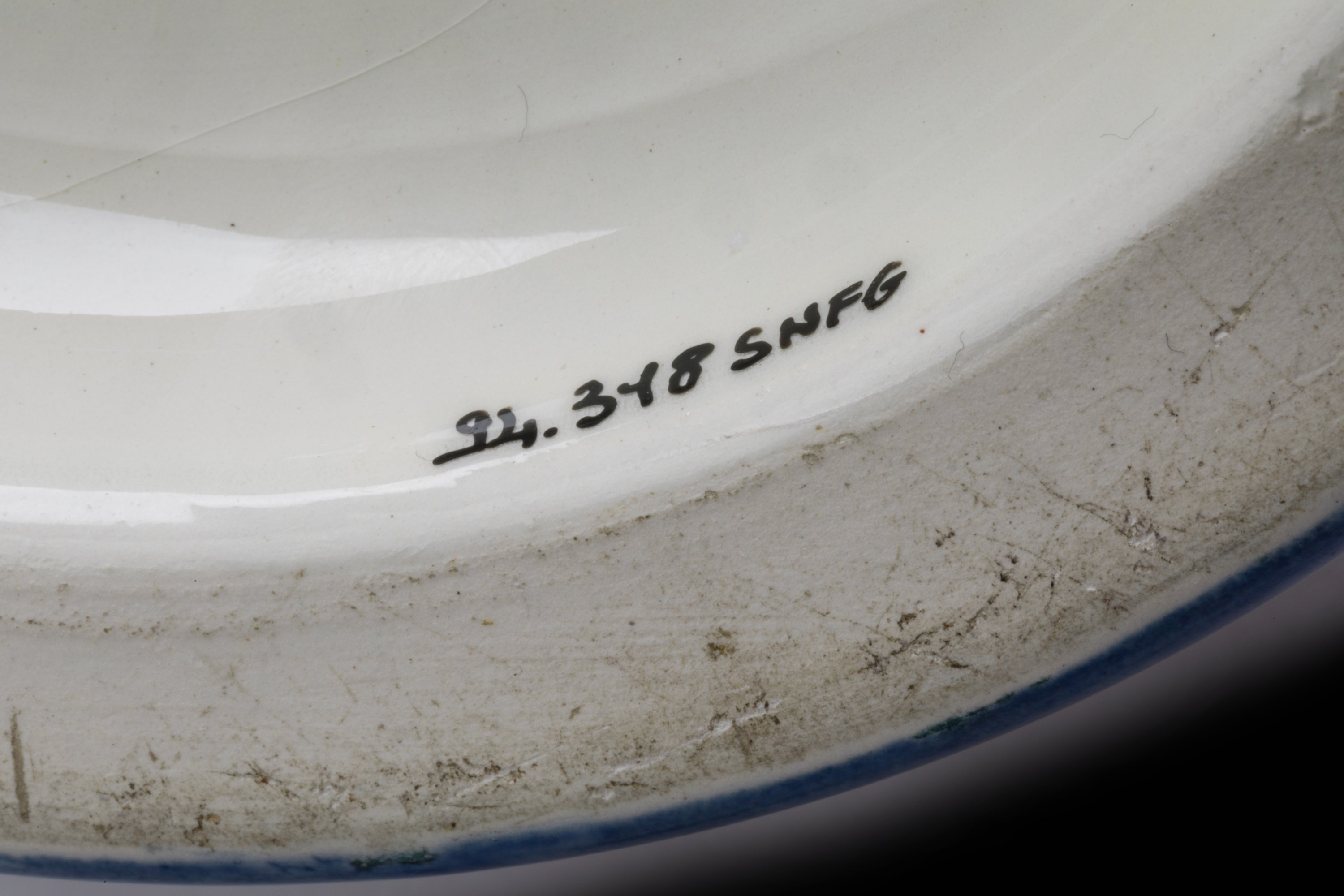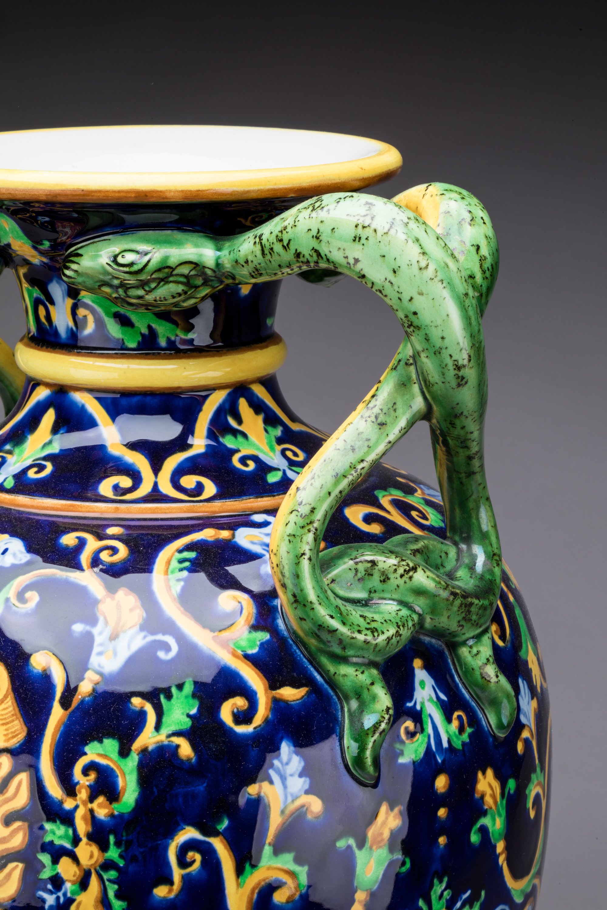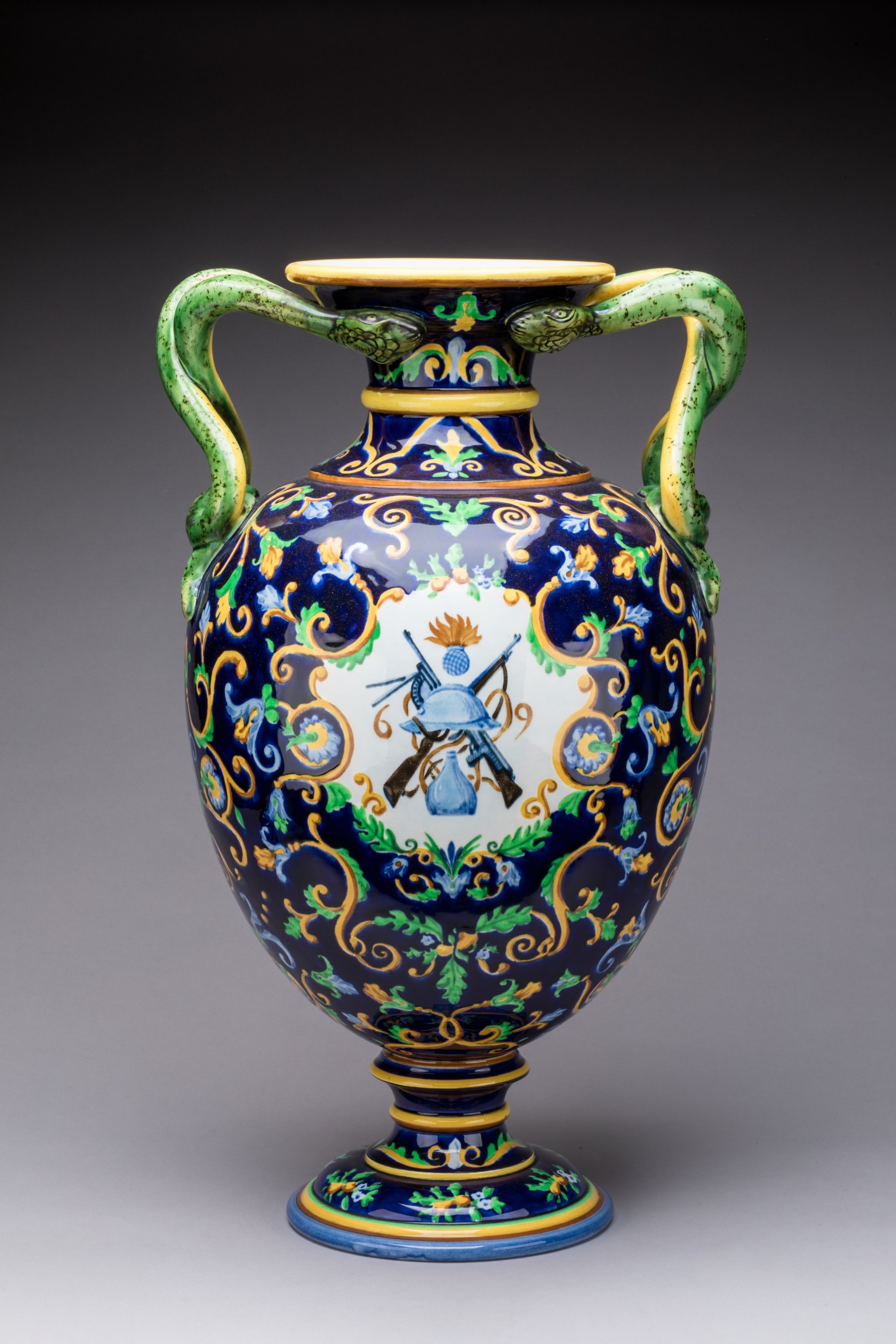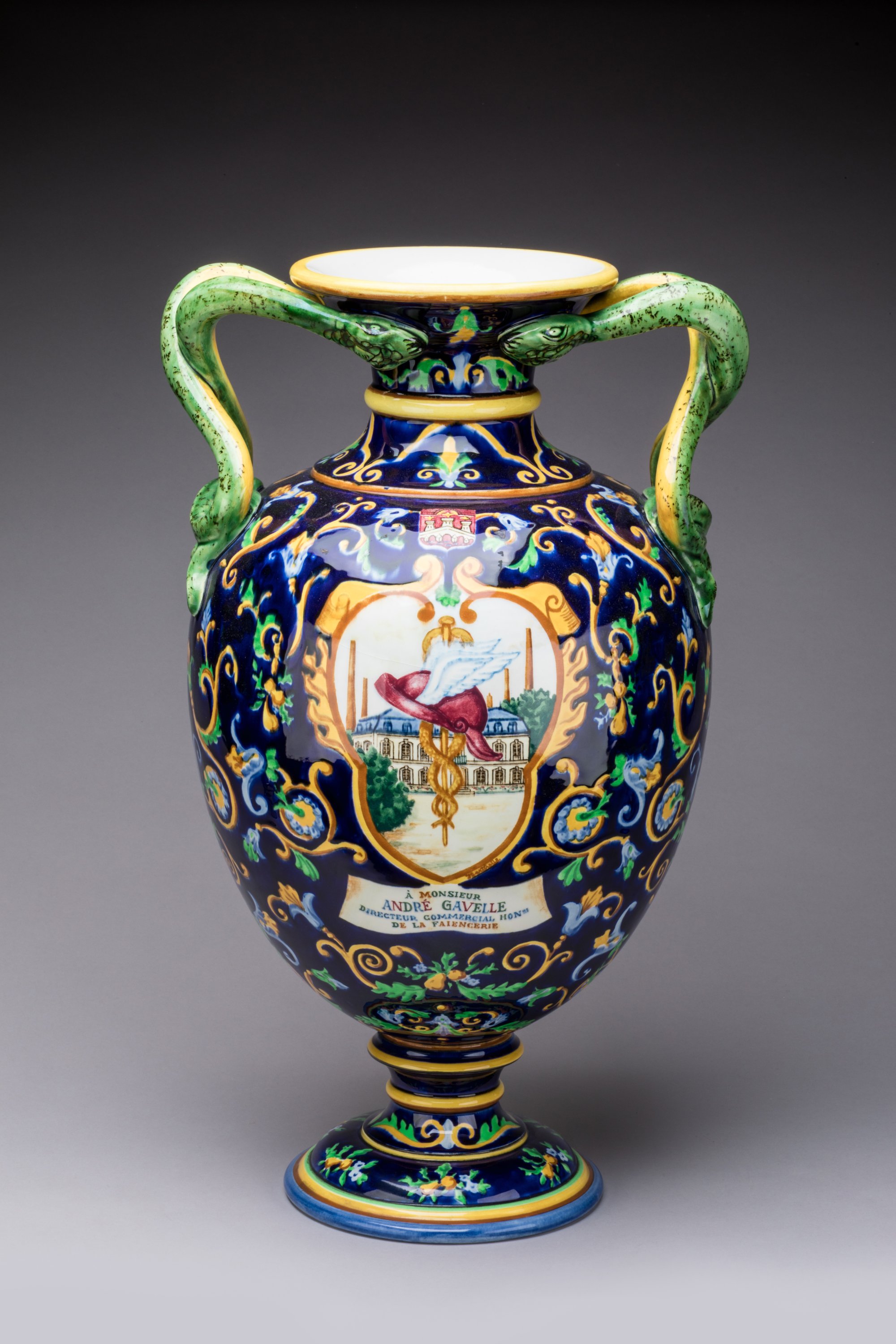 en céramique émaillée à décor de la Renaissance italienne sur fond bleu, dans un cartouche peint des attributs de Mercure sur fond de la faïencerie, dédicacé: "à Monsieur André Gavelle directeur commercial honoraire de la faïencerie".