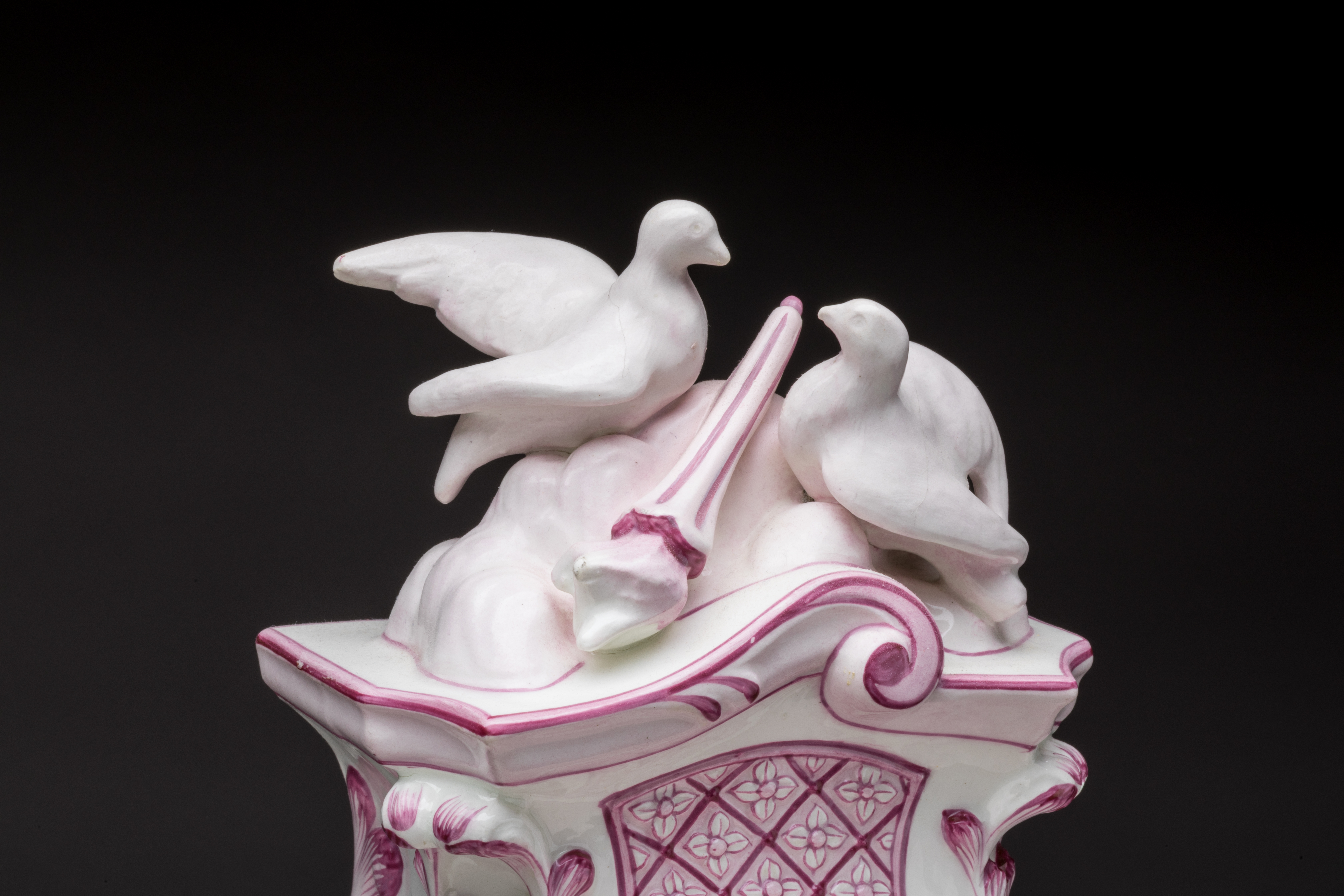 en céramique émaillée en camaïeu rose à la façon de Saxe avec des roses en applique.