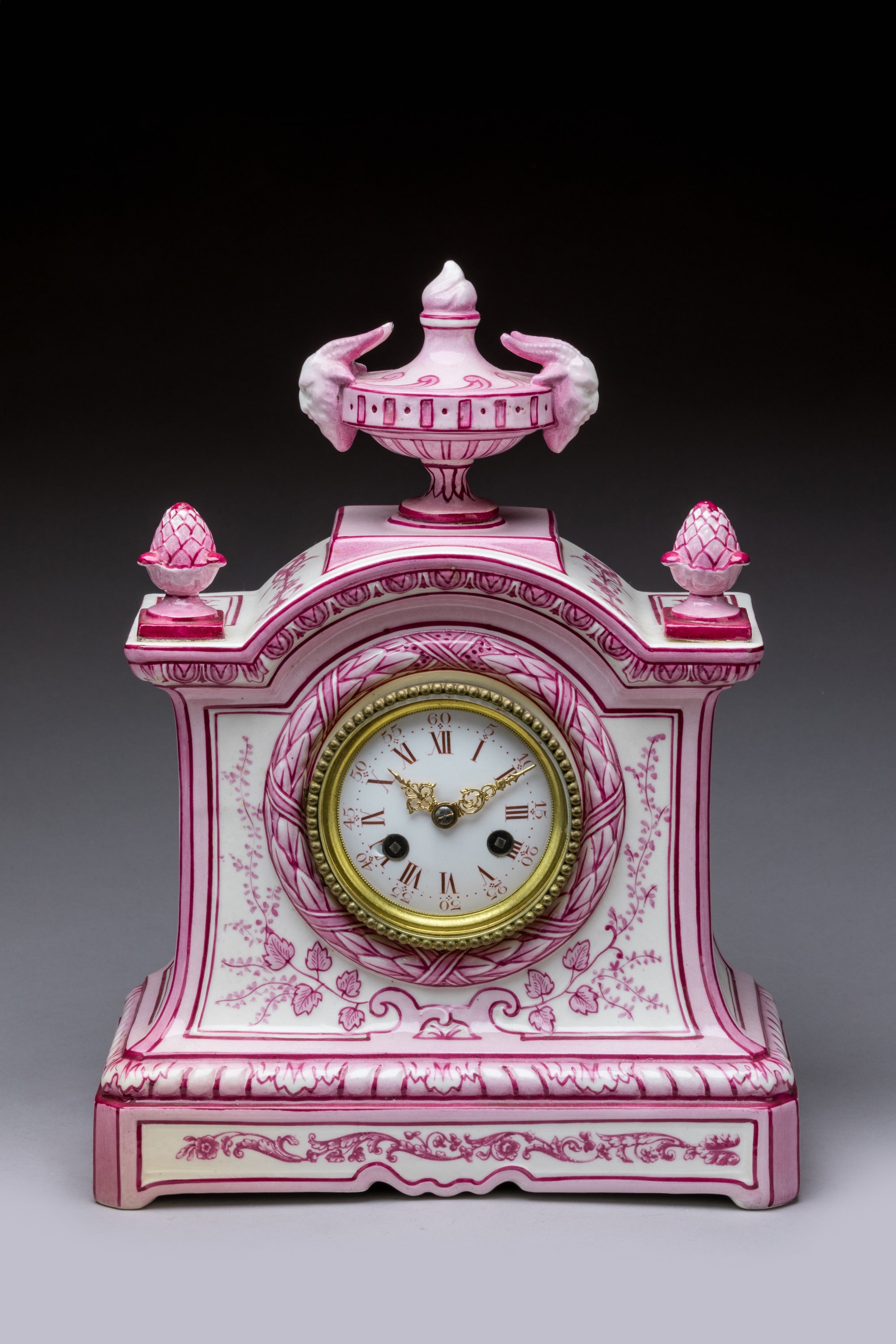 en céramique émaillée de camaïeu rose à la façon de Saxe avec glands et têtes de satyre.